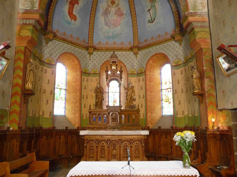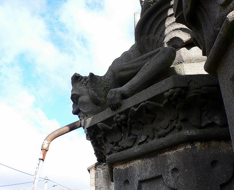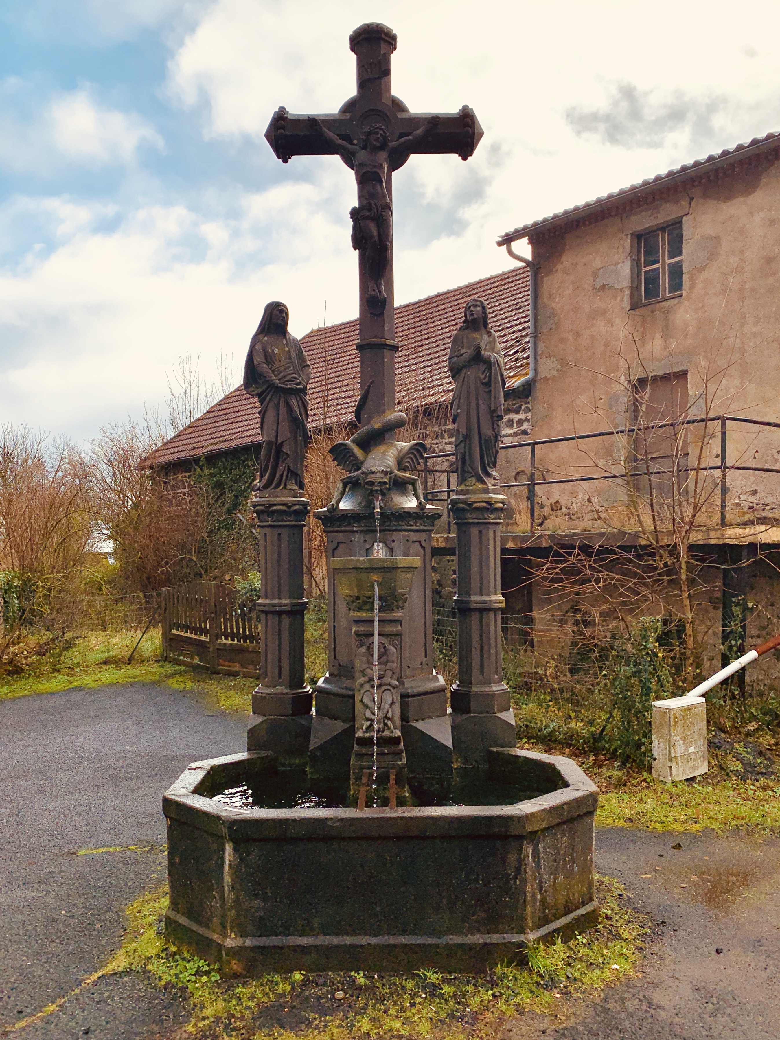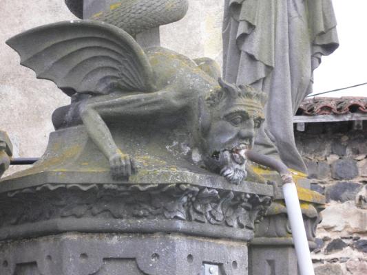 Fontaine calvaire et église de Ponteix A Ponteix il y a un crucifix au sommet d'une fontaine devant l'église. Au pied de la croix se trouvent deux femmes pieuses. Une figure diabolique crache de l'eau dans un petit bassin posé sur une grosse pierre, représentant un homme tenant deux serpents. L’eau s’écoule ensuite vers un bassin de rétention plus grand au sol. Cette fontaine remonte à la seconde moitié du XIXème siècle. L'ensemble est en pierre de lave. L'église de Ponteix du XIXème siècle a été construite en partie avec des pierres récupérées lors de la démolition en 1867 de l'ancienne église paroissiale au pied du château de Montredon. A l'intérieur de l'église, vous pourrez admirer des peintures murales.