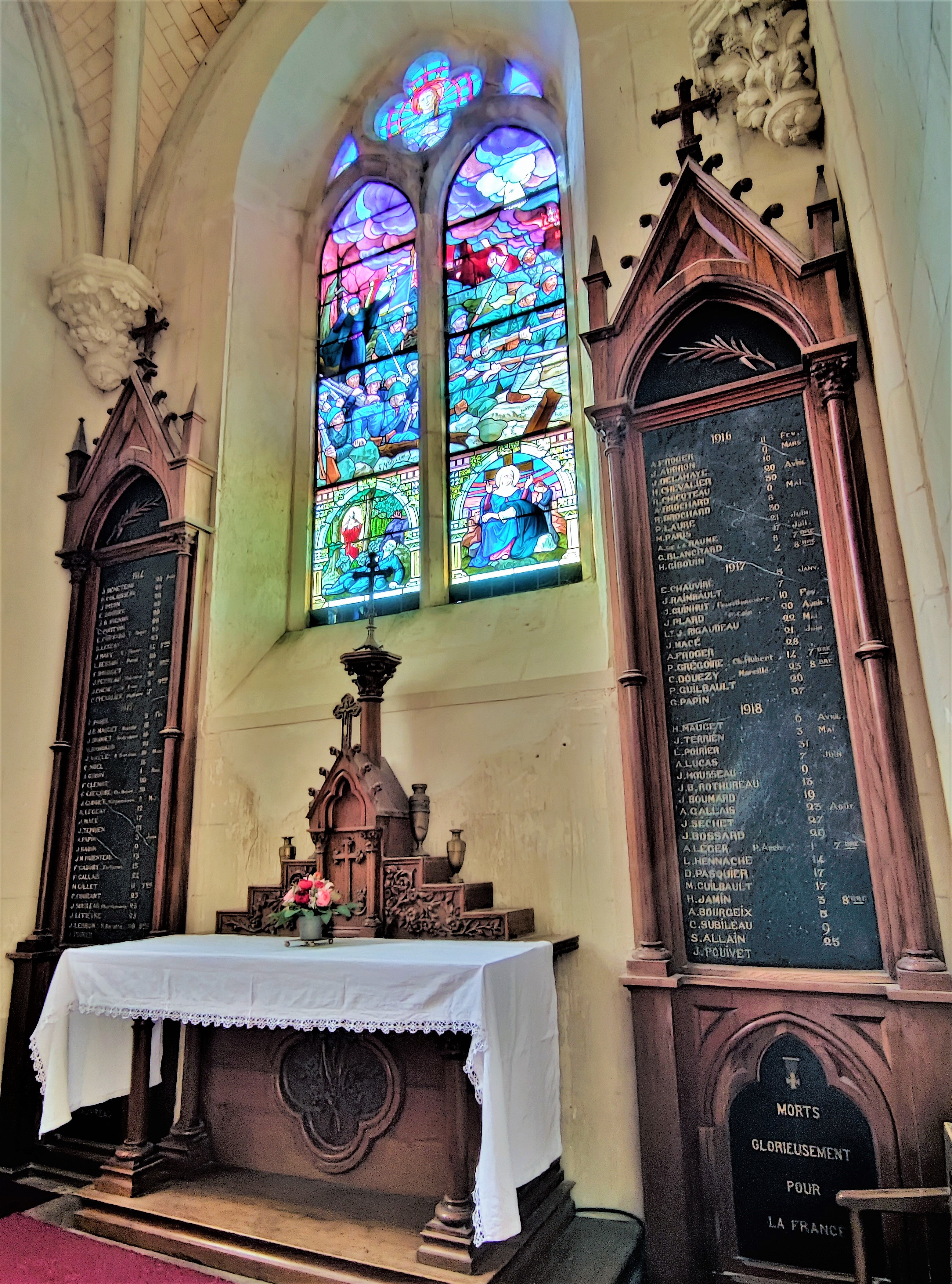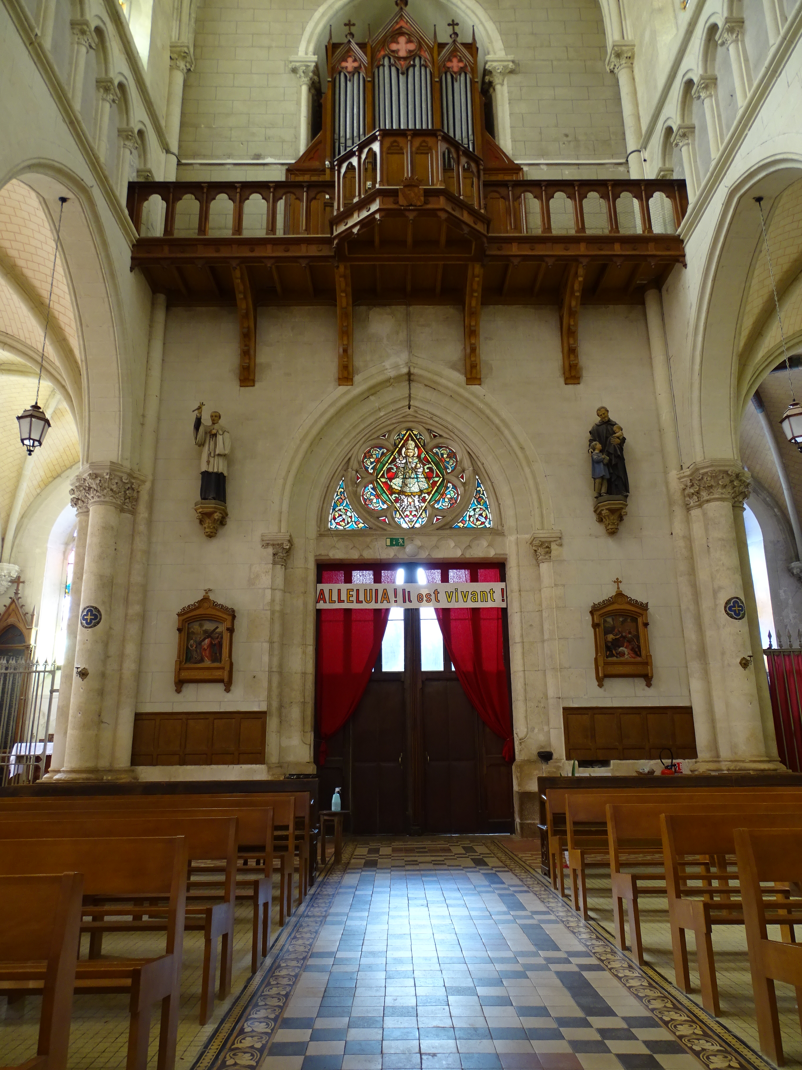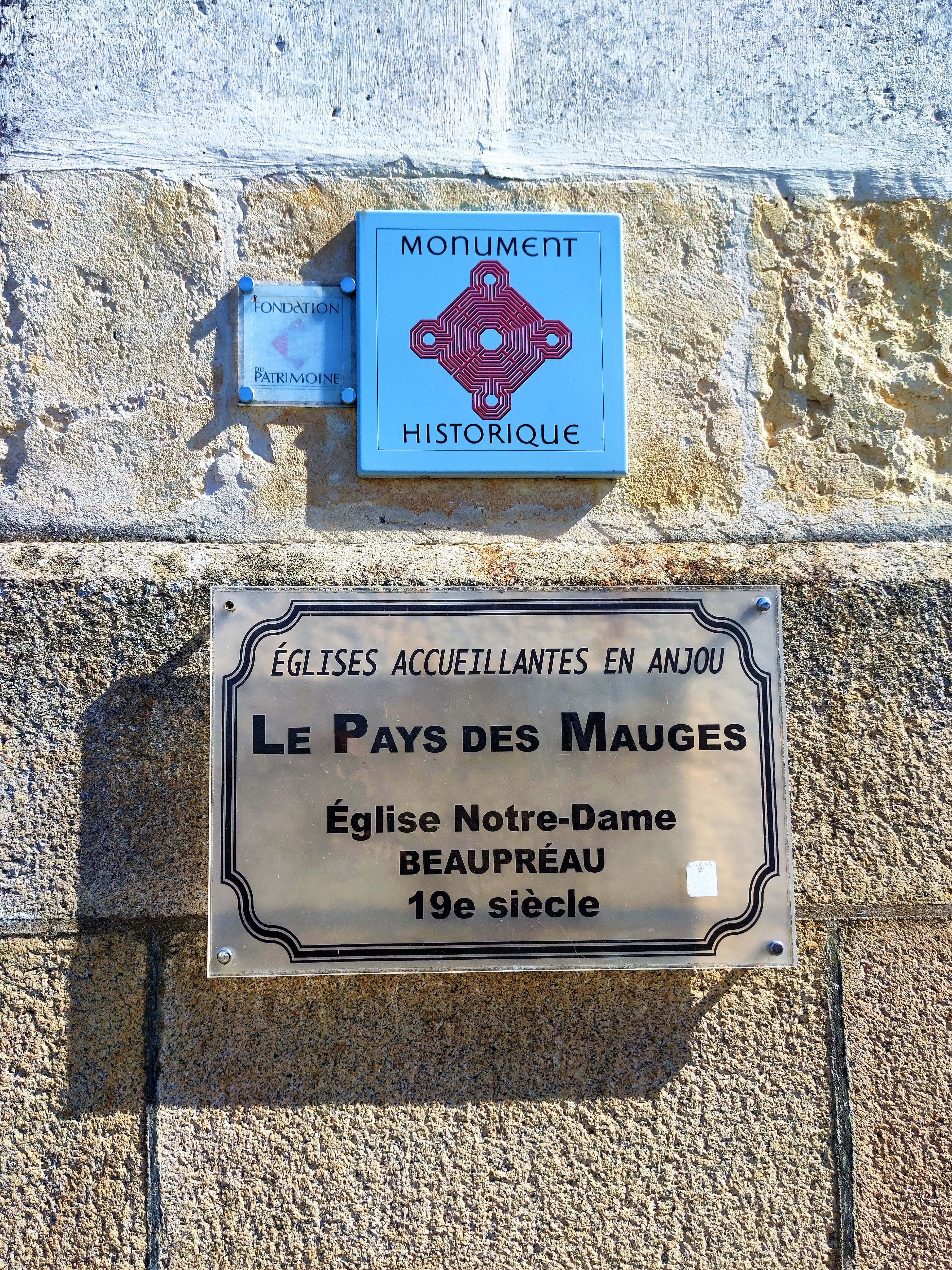 Vraiment une très belle église, grande, spacieuse, aux nombreuses verrières à deux rangées, toutes représentant des scènes ou des personnages de saints. A remarquer aussi le beau Christ du chœur, dont l'histoire rapporte que voué à la destruction en 1831 par décret municipal, il fut caché à Angers puis acquit par le curé de Beaupréau qui le plaça à l'arrière de la grotte de Lourdes qui se trouve à l'extérieur de l'église (il surplombait alors cette grotte); mais abattu ensuite par une tempête en 1951, il fut enfin placé dans l'église en 1959.