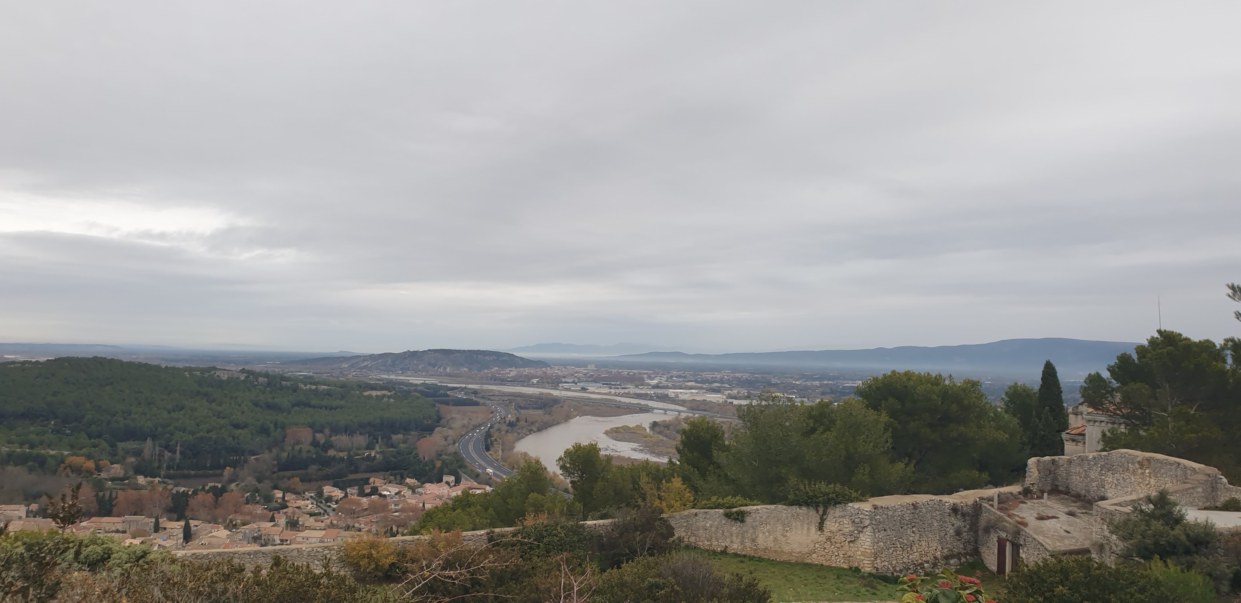 Très beau point de vue sur les Alpilles et le Lubéron en bas la Durance mais la vue est gâché par l autoroute A 7 et le TGV et la ligne de chemin de fer et le bruit infernal des voitures et camions