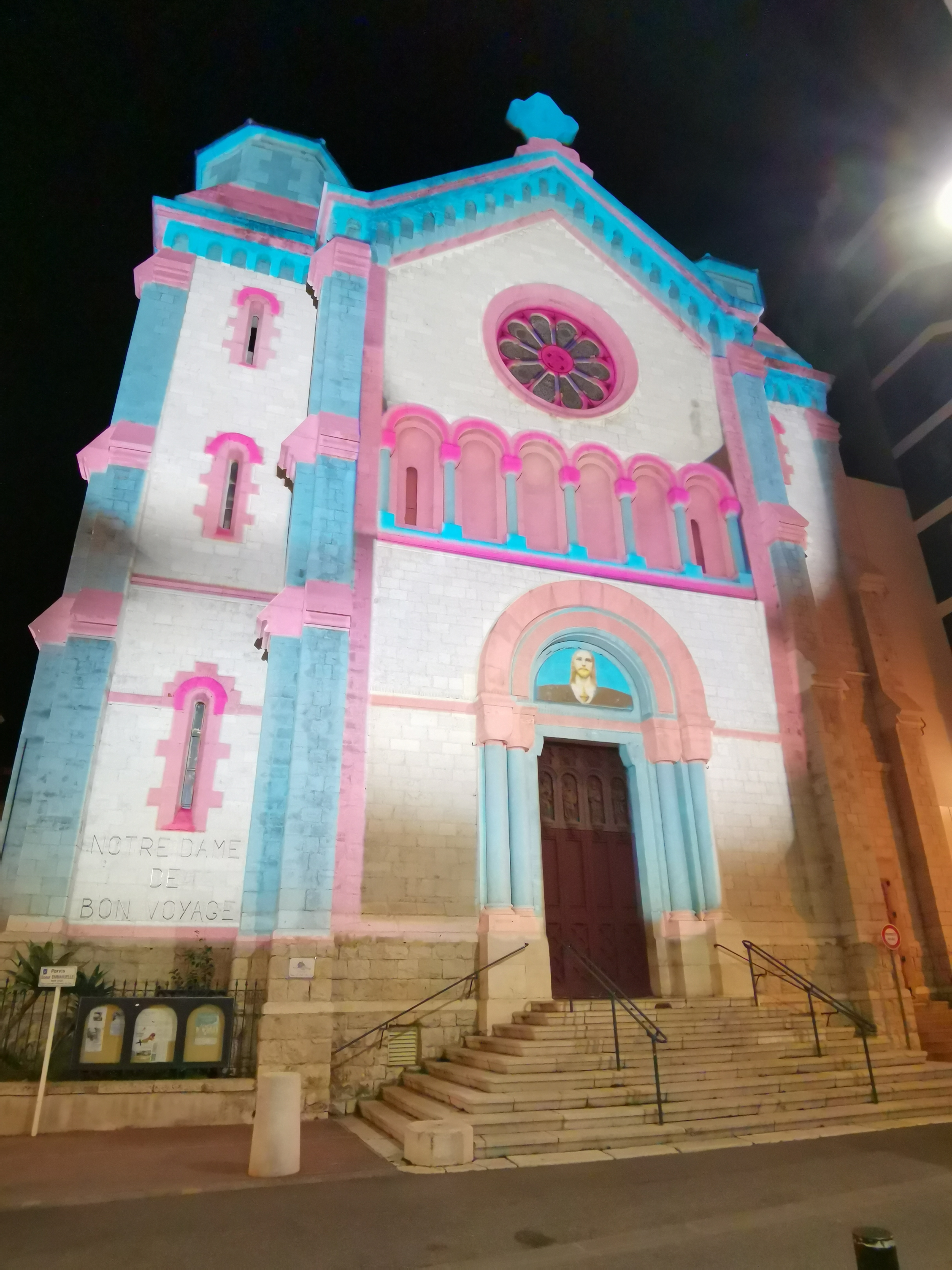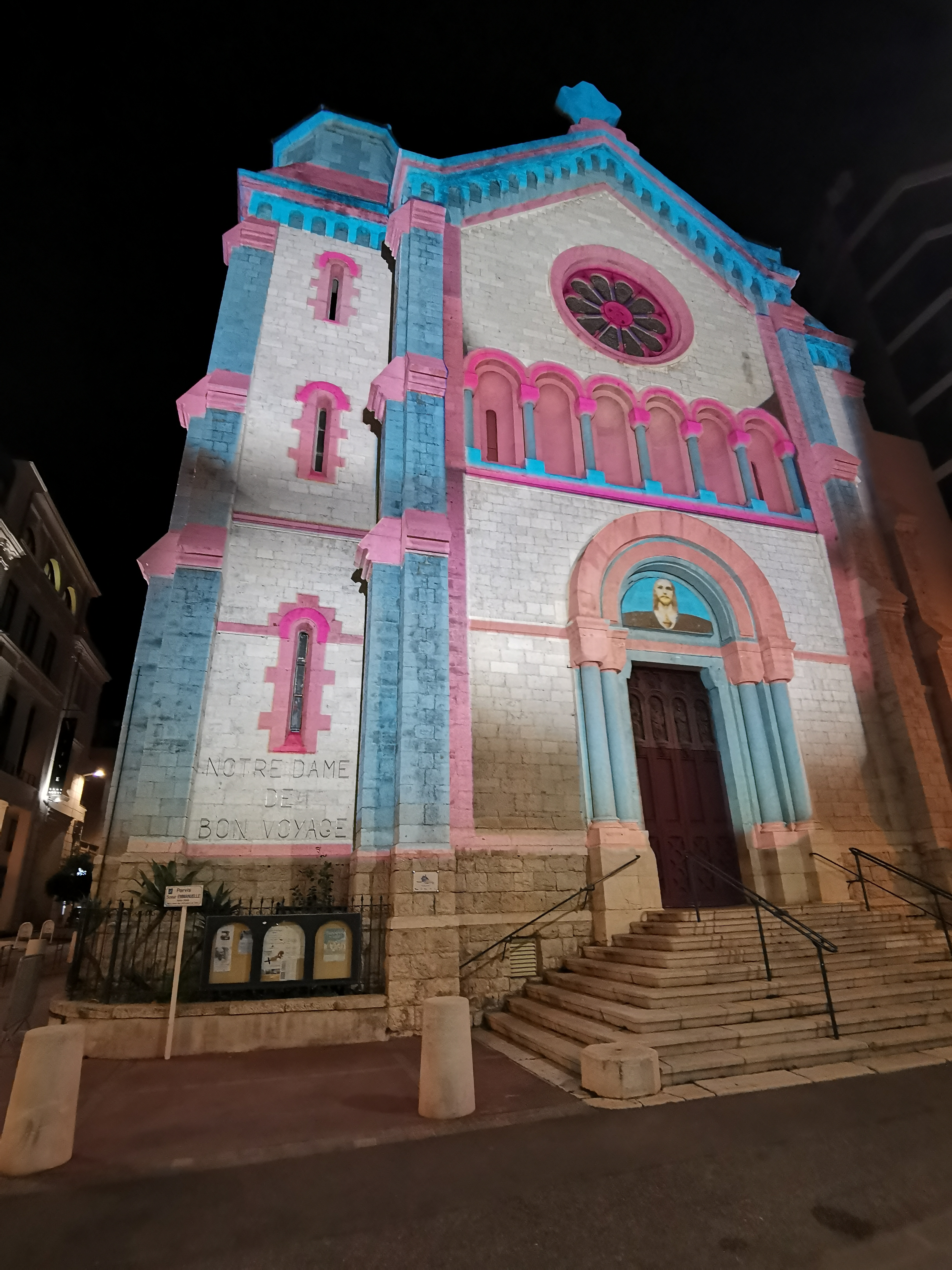 L'église est l'une des plus belles que j'ai vues ici à Cannes. Chaque soir, il est éclairé par de belles couleurs extérieures et tous les jeudis soir de 19h00 à 21h00, c'est la répétition de la chorale qui chante les services religieux du dimanche dans différentes églises de Cannes et propose également une grande variété d'autres concerts. dont des concerts de Gospel avec l'incroyable chanteuse solo Grace Beauly qui a non seulement une voix incroyable mais une énergie hors de cet univers... Le prochain concert aura lieu en cette église Notre Dame de Bon Voyage le 20 décembre 2022 à 20h00 .