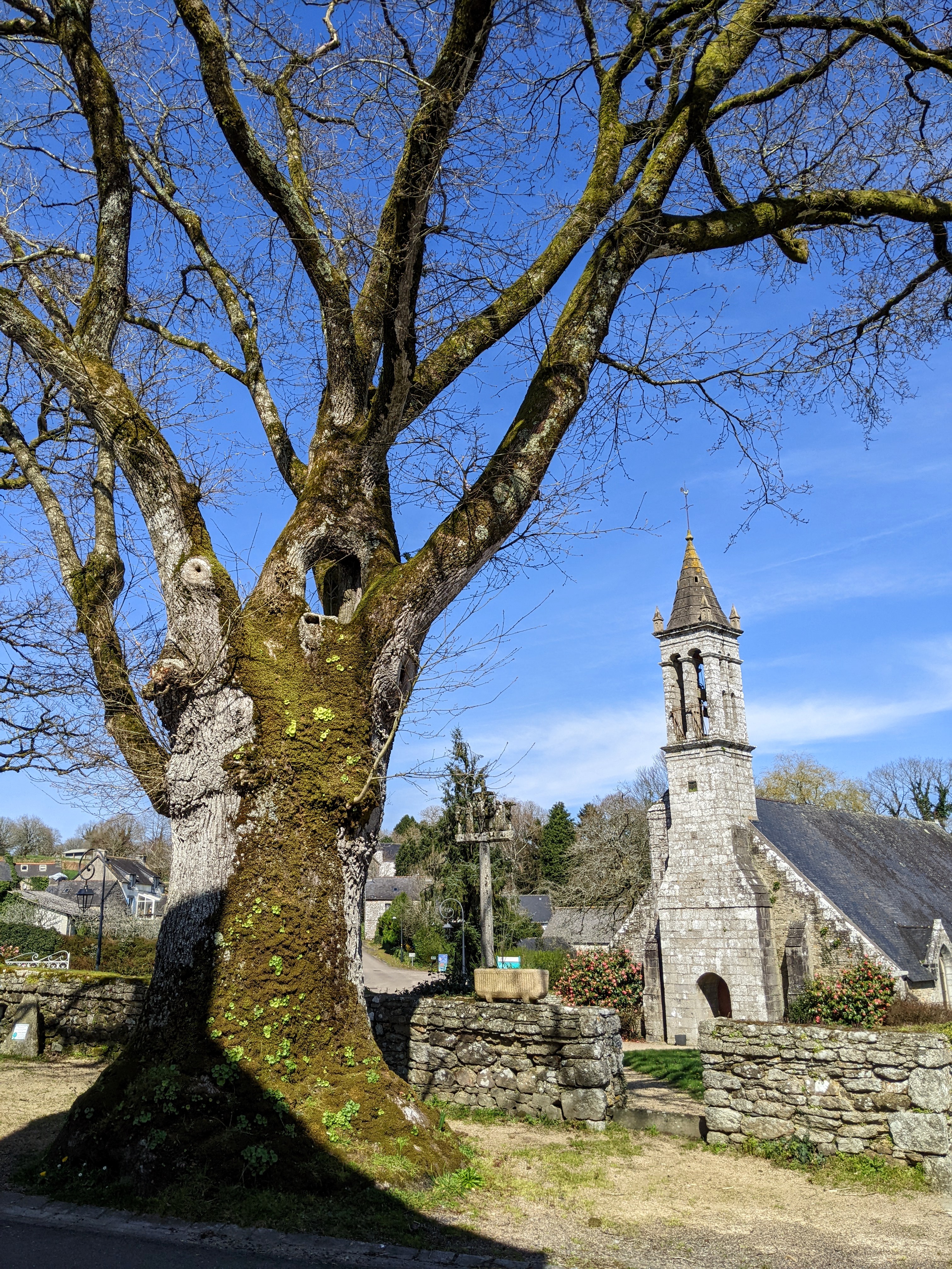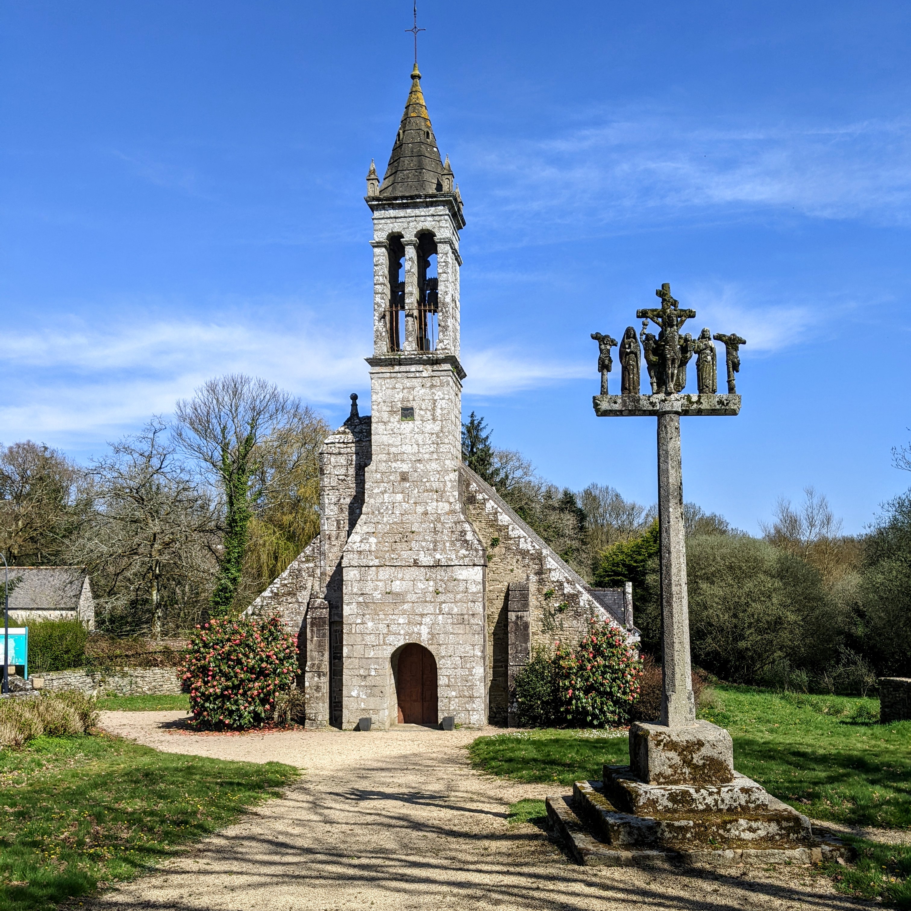 L'église était fermée, un calvaire en pierre de Kersanton du 16 siècle dans l'enclos. À l'extérieur deux chênes pédoncules, arbres remarquables plantés en 1582, l'année du décès de Catherine de Médicis.