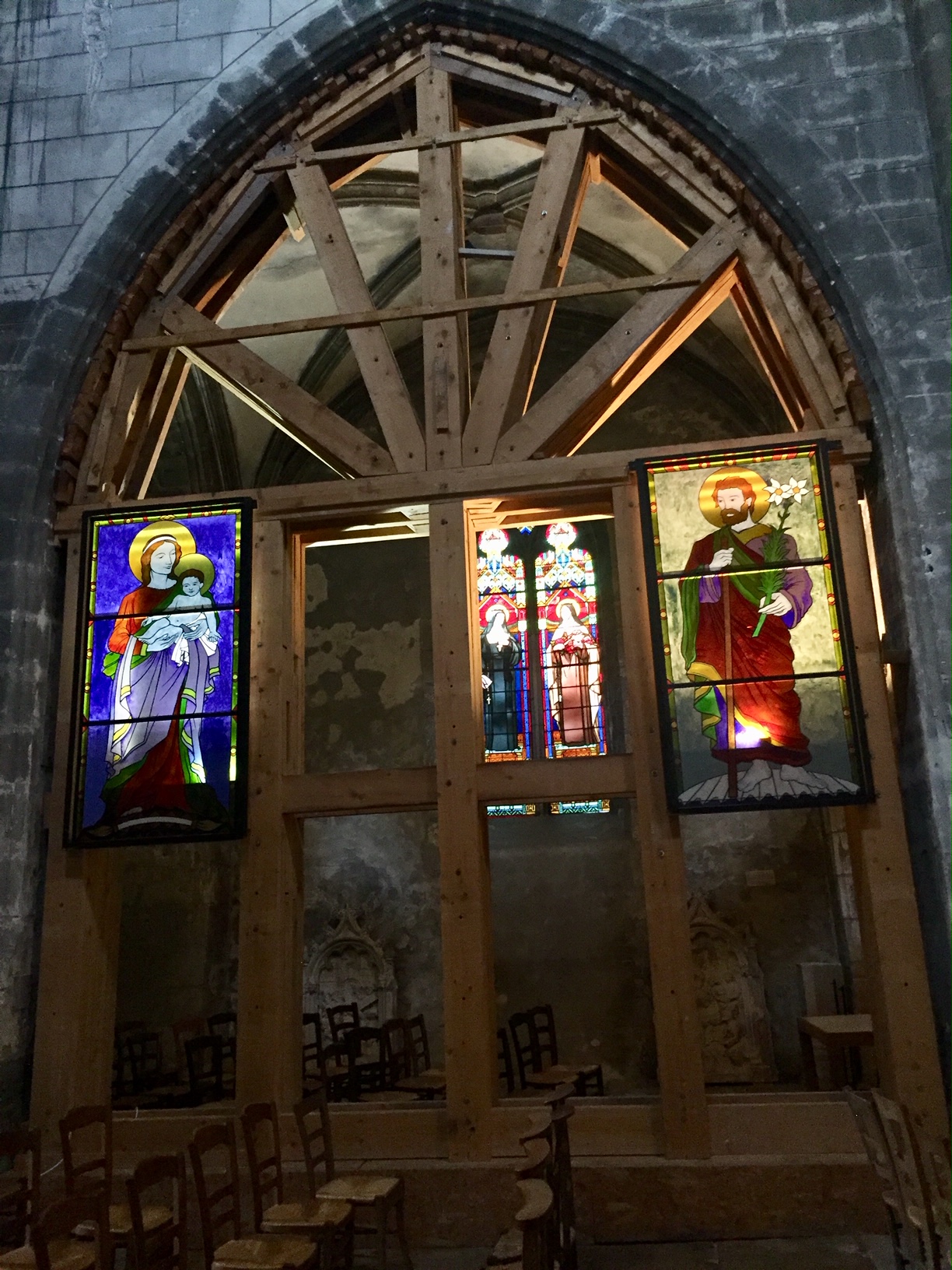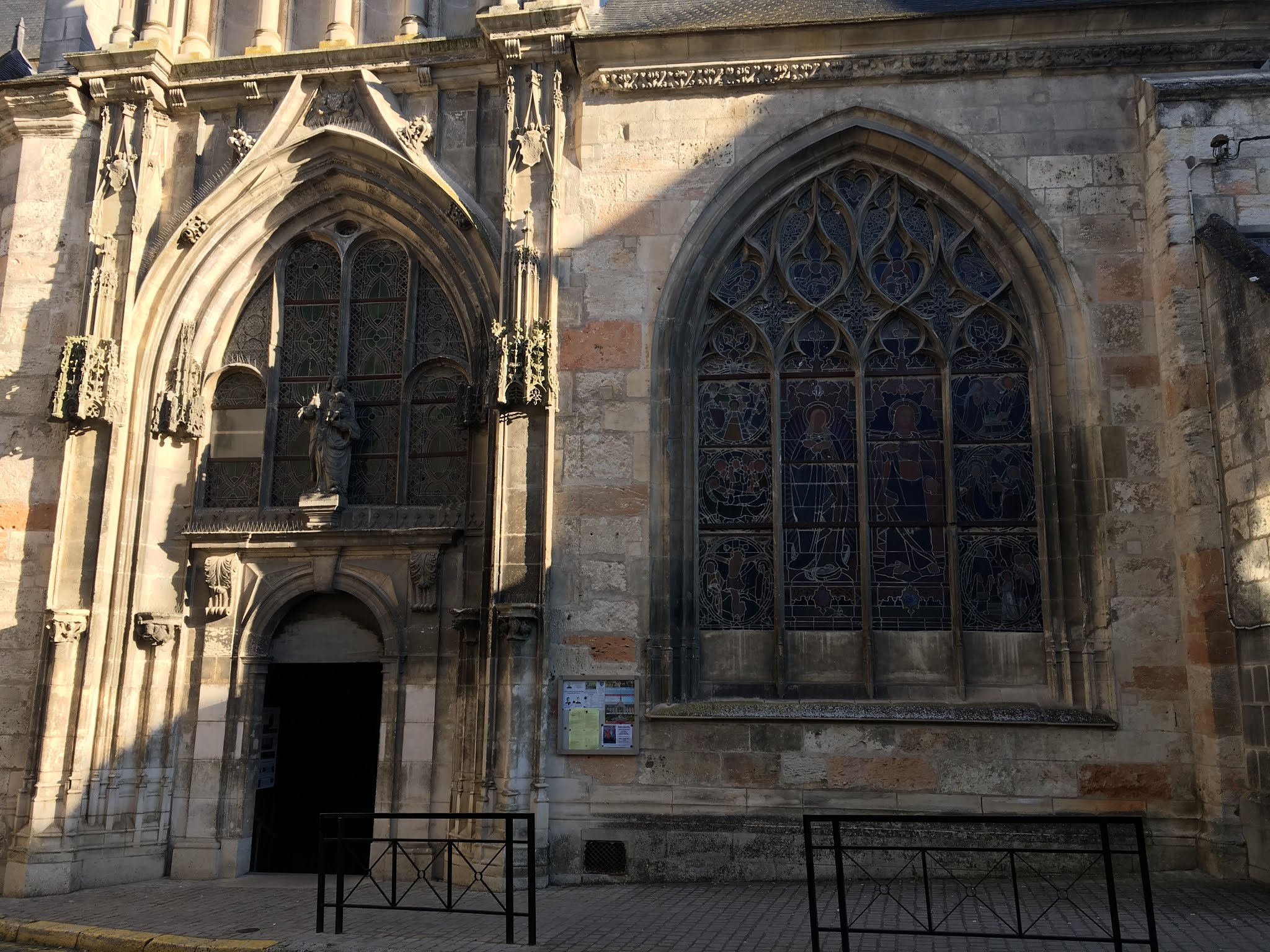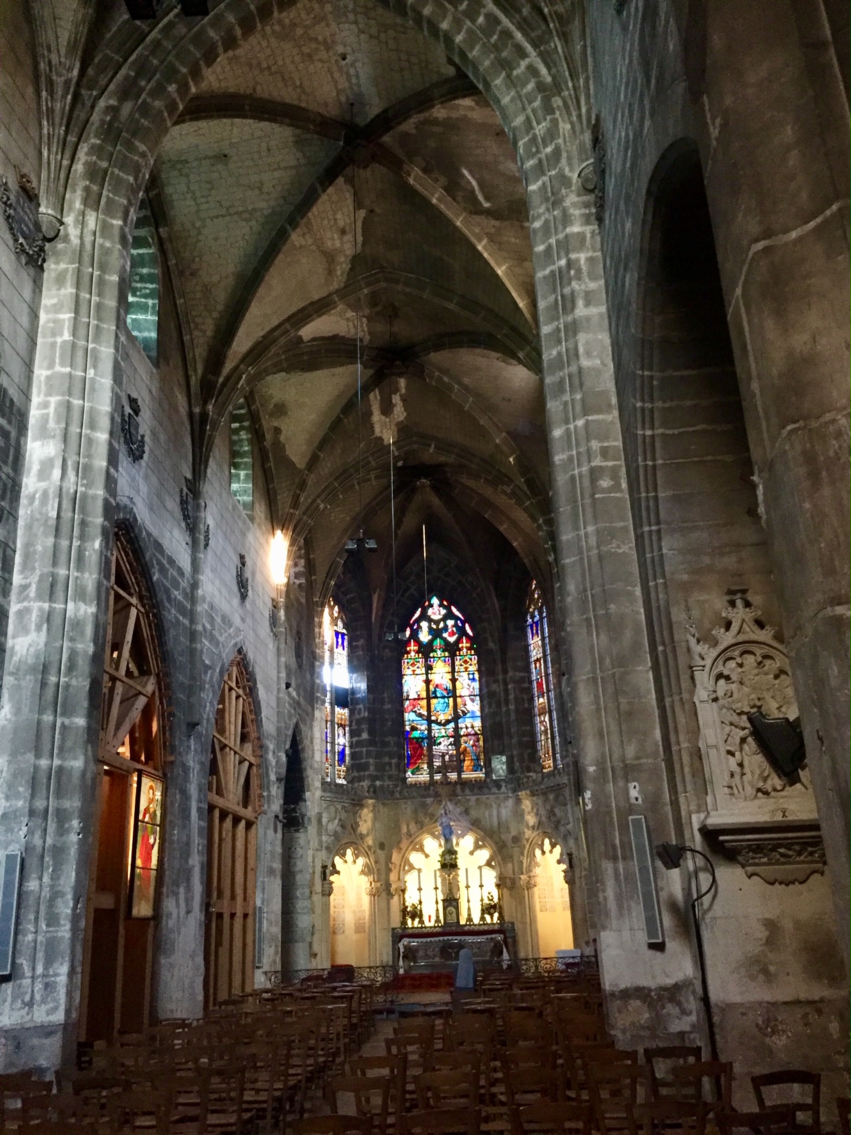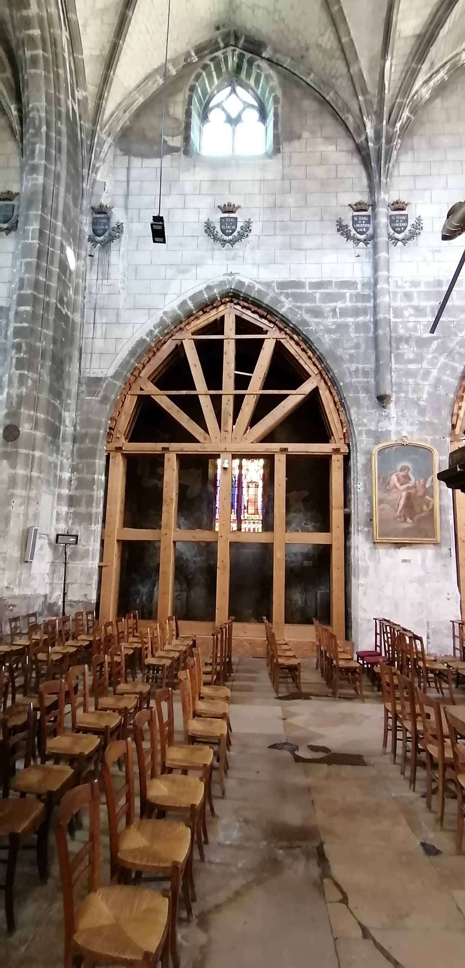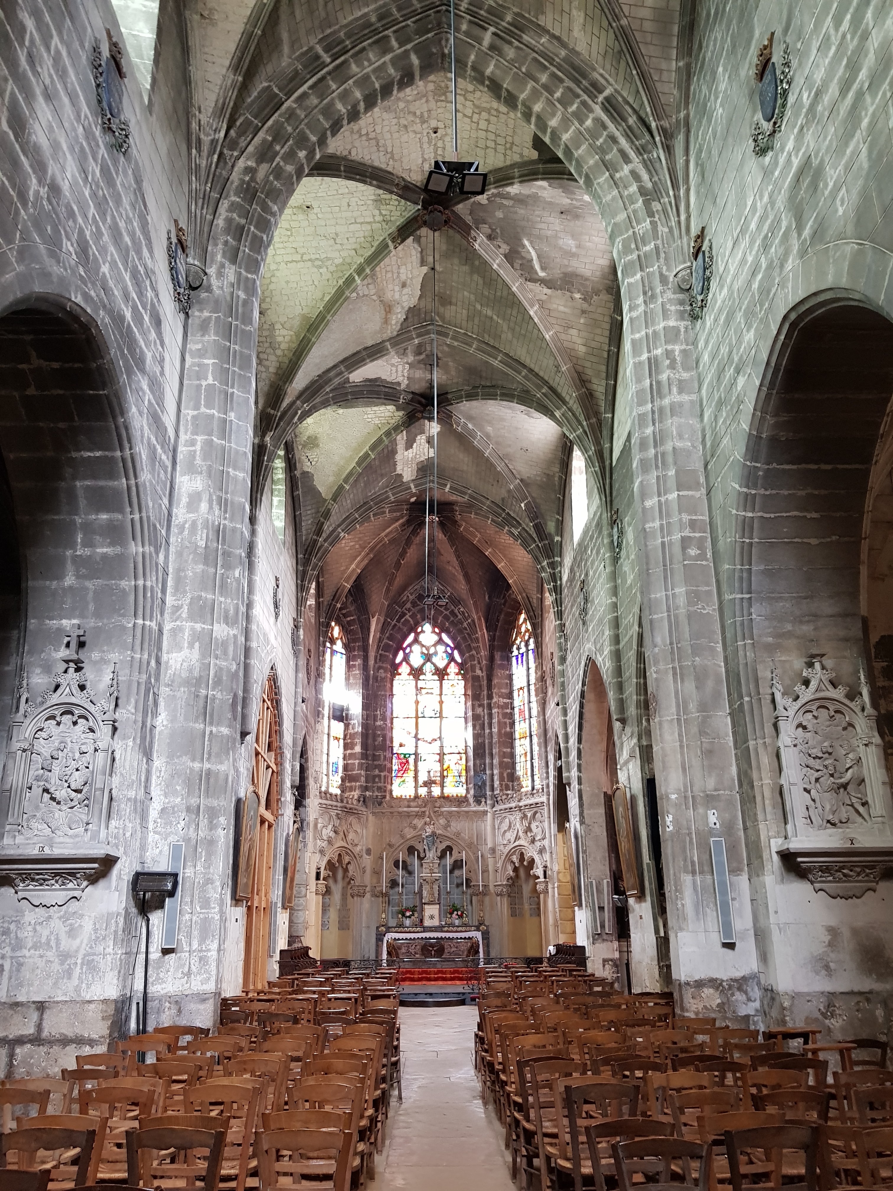 Une église en travaux de restauration mais ouverte pour les visites Construite aux 15ème et 16ème siècle, classée en 1931, Cette église mériterait, me semble-t-il, une restauration très importante. Des travaux sont en cours mais seront-ils suffisants ? Plusieurs arcades au nord sont soutenues par des étais de bois, la partie nord de la nef restant inaccessible. J'ai adoré le chœur, ses niches et ses arcades de style gothique flamboyant, ajoutées au 19ème siècle, jugées sévèrement (d'un effet fâcheux) par l'historien Deshoulières en 1931 dans le cadre du Congrès archéologique de France. Grâce à ces ajouts de 19ème siècle, Le chœur-sanctuaire de l'édifice gagne en luminosité, en fraîcheur et devient étrangement attirant pour le visiteur. Il offre aussi au croyant un espace lumineux vers lequel s'orienter, le reste de l'édifice étant dépourvu d'un éclairage suffisant.