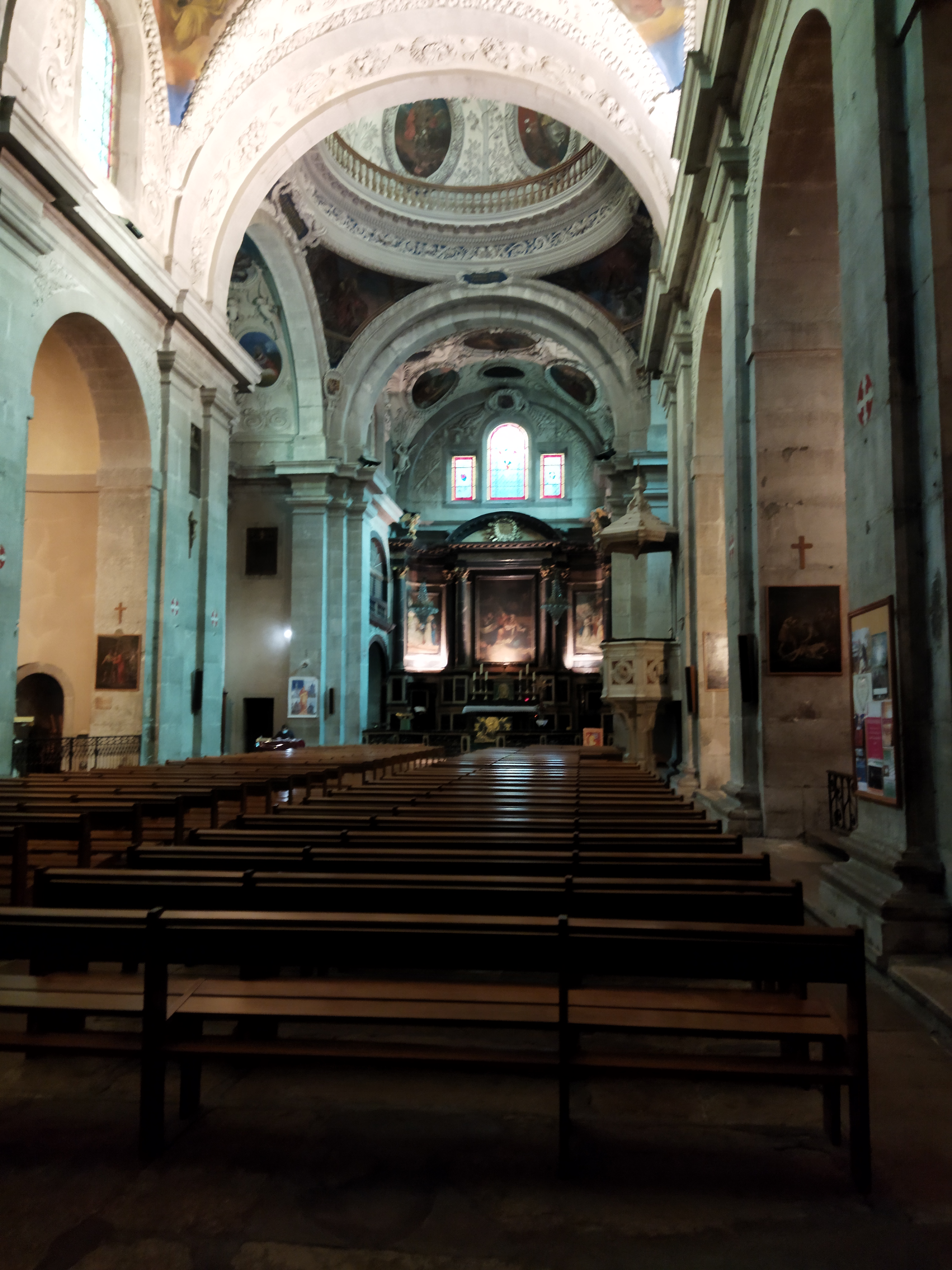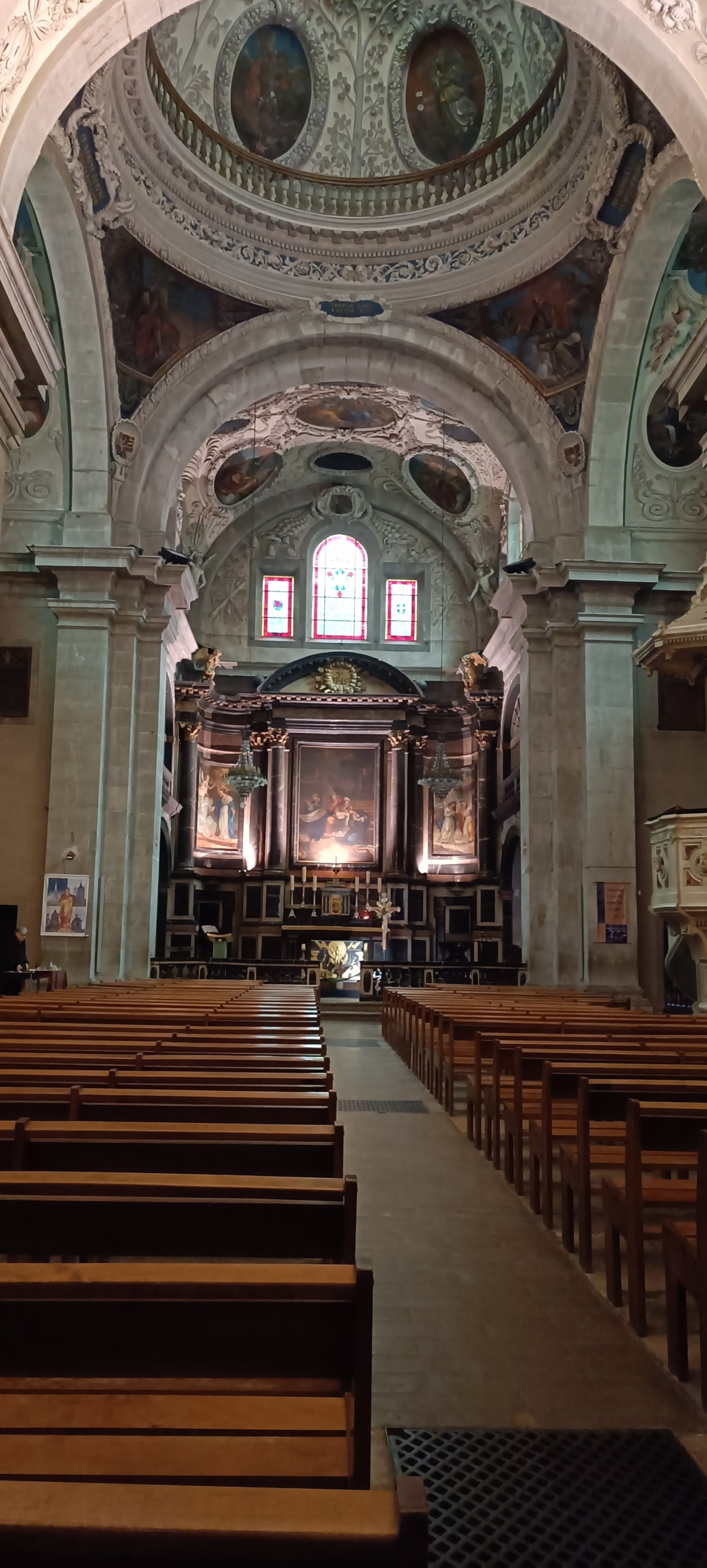 Malheureusement, je n'ai pas trouvé le nom de l'église à l'extérieur. Nous y sommes arrivés, même si nous y sommes passés à la hâte à plusieurs reprises, pour participer à la messe de pré-vacances. Appelée simplement « Notre Dame » par les habitants. Lorsque nous avons demandé des informations sur la façon de s'y rendre, aucun des commerçants vers lesquels nous nous sommes tournés n'a donné la bonne direction, en fait, ils n'en savaient presque rien... !!! Nous étions attirés par les cloches qui appelaient à la liturgie. Avec une modeste impatience, nous nous sommes assis parmi les derniers bancs et, tout en essayant de comprendre quelques mots de français, j'ai admiré l'architecture et les décorations.