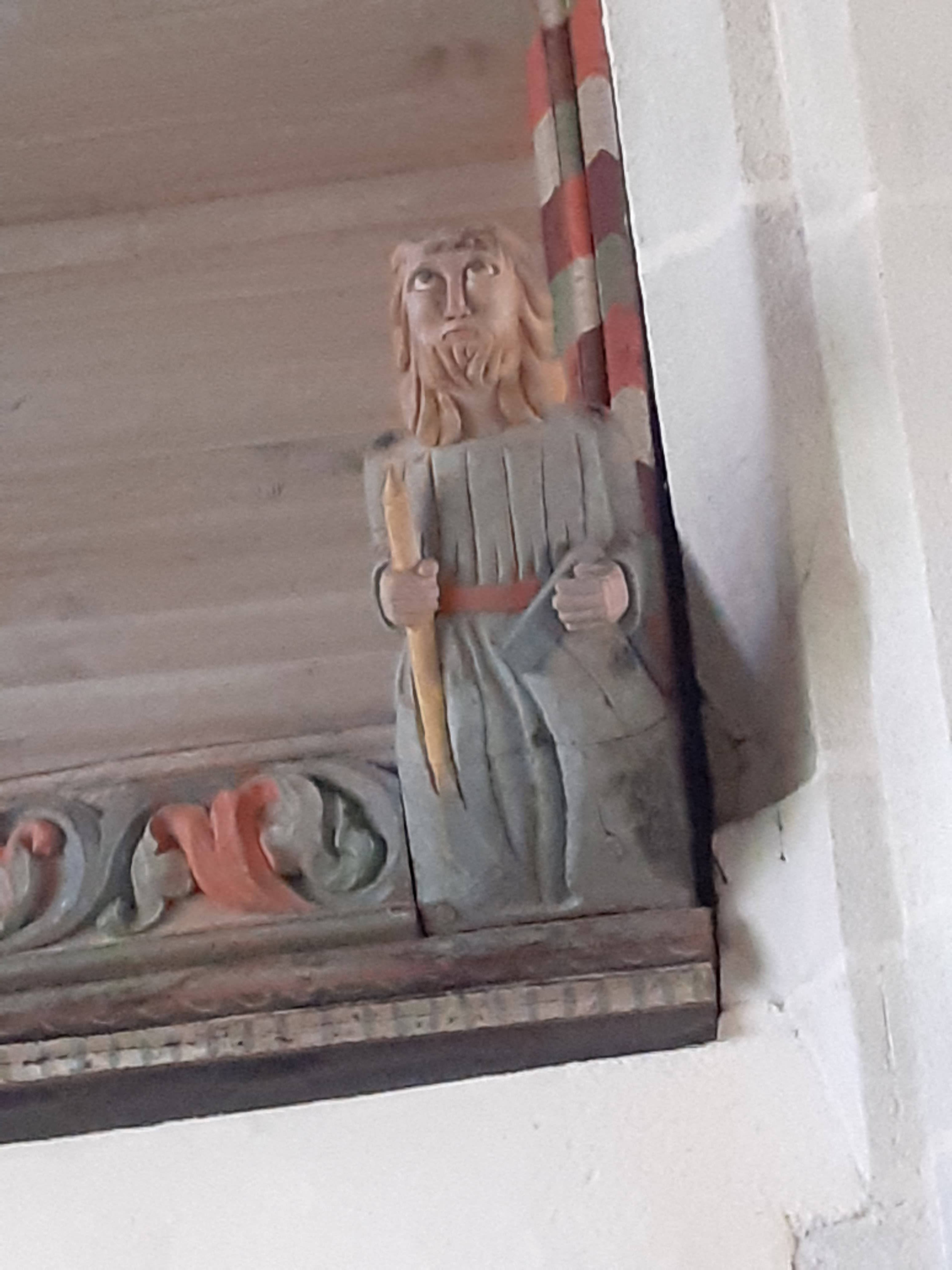 Très belle église ceinte sur tout son pourtour par un muret obligeant les visiteurs et les paroissiens à enjamber afin d'entrer dans l'espace sacré. Sur un des murs extérieurs se trouve un cadran solaire. L'intérieur est très beau aussi avec son baptistère puis sa niche dévolue à la vierge Marie. Le cœur est sublime avec ses vitraux (il est interdit d'y accéder). Les poutres de la nef sont sculptées de gueules de dragon et peintes de différentes couleurs rappelant la frise entre les murs et la voûte. Lorsque l'on se retourne pour sortir, en levant les yeux on peut admirer les tuyaux de l'orgue.