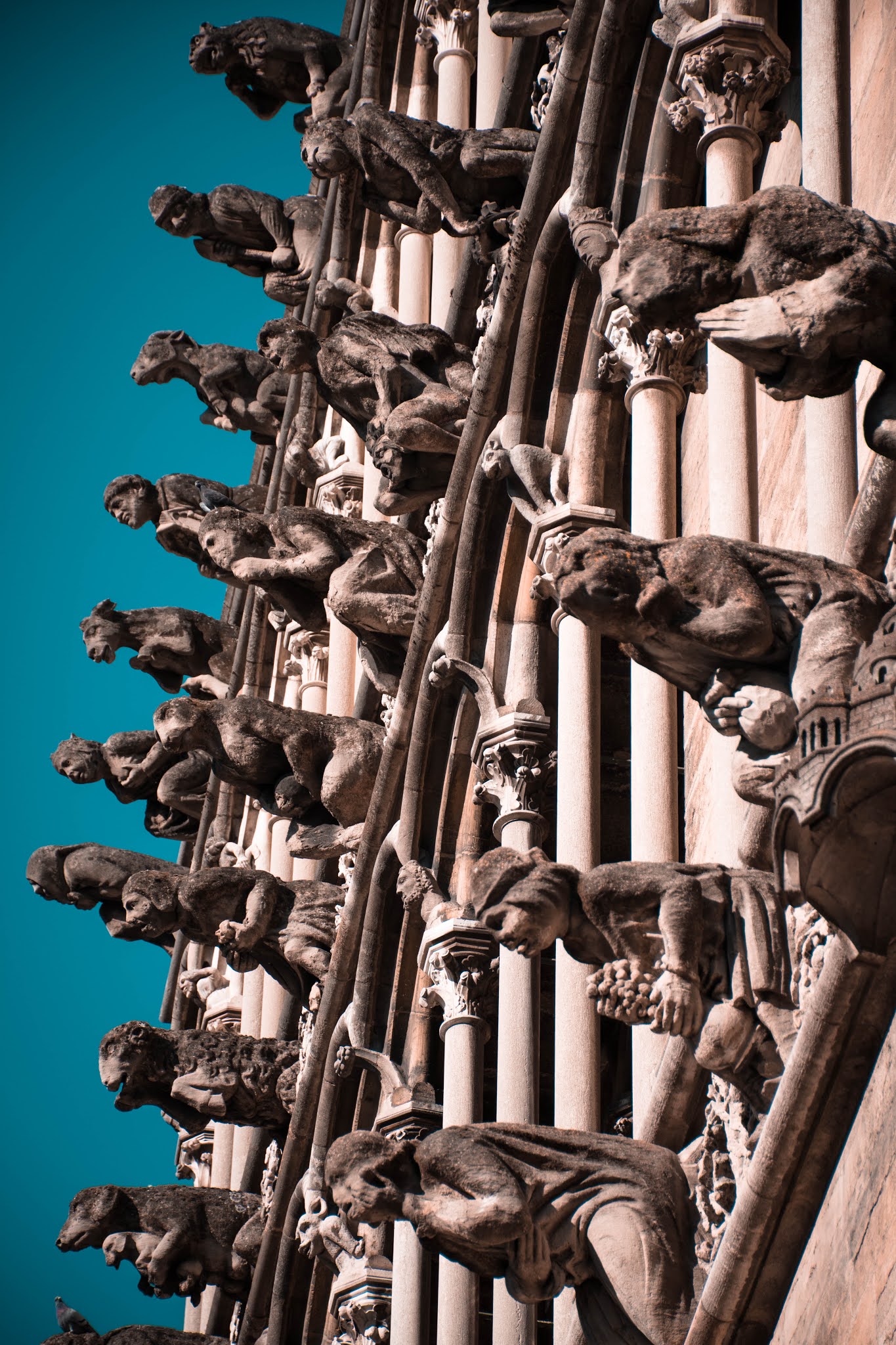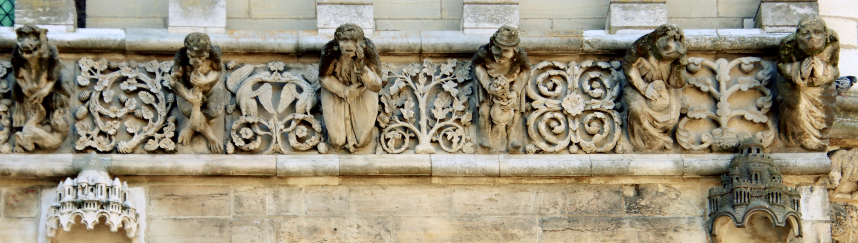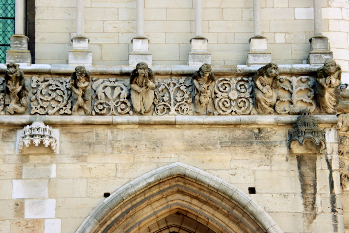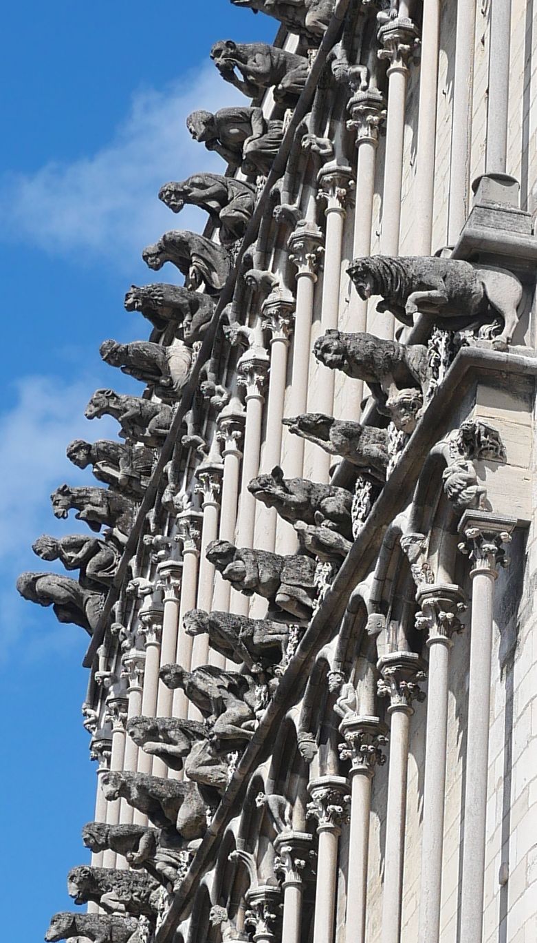 Extrait du net : La façade-écran de Notre-Dame est constituée de deux rangées d'arcatures, chacune soutenue par dix-sept colonnettes. L'ensemble est souligné par trois bandeaux qui abritent, chacun, dix-sept fausses gargouilles et seize métopes. (On appelle métope la partie carrée sculptée de motifs végétaux entre chaque gargouille). Un récit du moine Étienne de Bourbon, au XIIIe siècle, raconte qu'un usurier qui entrait à l'église pour se marier fut tué par la chute d'une gargouille qui symbolisait l'avarice. Fable ou pas, on jugea plus prudent de raser toutes les gargouilles, sauf celles des côtés et du revers de la façade. Le XIXe siècle décida de les rétablir. En 1880 et 1881, sept sculpteurs parisiens se mirent à l'ouvrage et créèrent les gargouilles que l'on peut voir actuellement