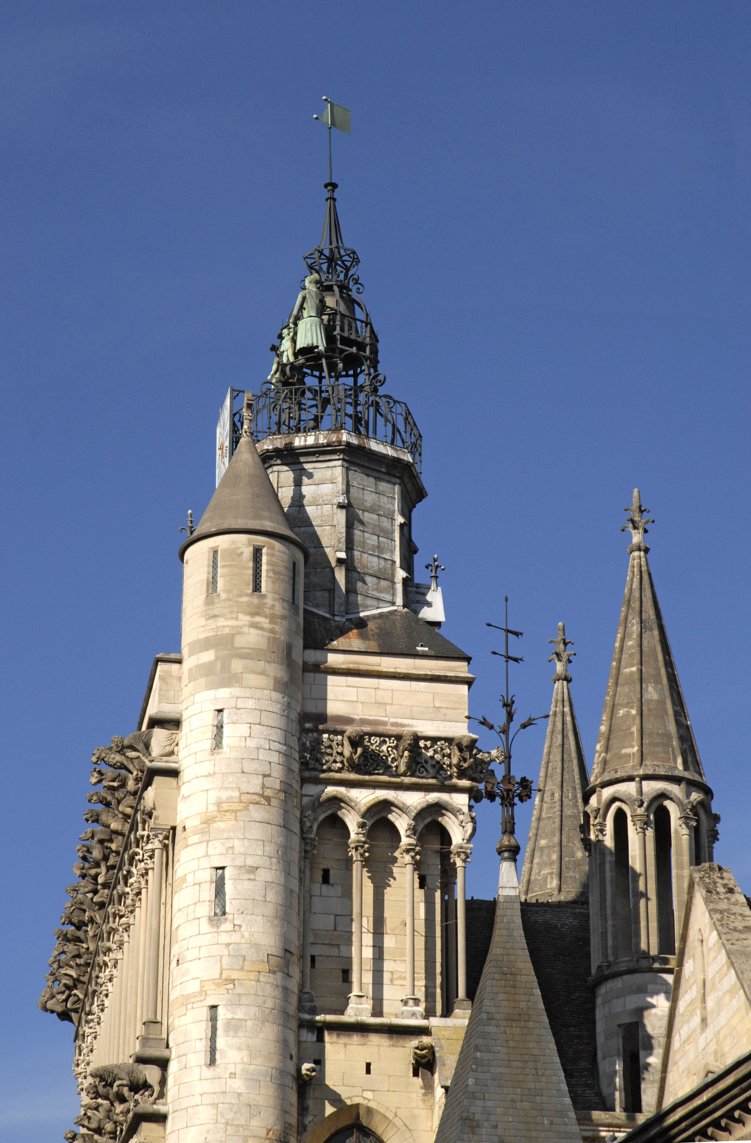 Le jacquemart. Cette horloge est située sur un campanile qui s'élève sur l'amorce de la tour sud de la façade occidentale de Notre-Dame. Elle comporte quatre automates métalliques dont deux, nommés Jacquemart et Jacqueline, sonnent les heures avec un marteau sur une grosse cloche, les deux autres automates, leurs « enfants » Jacquelinet et Jacquelinette, frappant de quart d'heure en quart d'heure, chacun sur une petite cloche. L'automate Jacquemart et la grosse cloche ont été ramenés de Courtrai, en Belgique, après le pillage de la ville par les armées de Philippe le Hardi en 1382. Cette année-là, le duc de Bourgogne partit en campagne afin de porter secours à son beau-père, le comte de Flandre, pris de court par une rébellion qui s'étendait entre Lille et Courtrai. La ville de Dijon avait fourni au duc mille hommes d'armes. Après la victoire bourguignonne, Philippe le Hardi s'empara à Courtrai, en novembre 1382, d'une horloge placée sur la tour des halles, munie d'un automate sonnant l'heure sur une cloche, qui passait pour une merveille. Il la fit démonter et l'offrit à Dijon, sa capitale. Ce qui restait de Courtrai fut livré au pillage. La famille ducale et les Dijonnais se cotisèrent pour placer en 1383 l'horloge et l'automate au-dessus de la façade occidentale de l'église Notre-Dame. La cloche, qui s'était brisée lors du transport, fut refondue à Dijon et reçut le prénom de sa marraine, la duchesse Marguerite de Flandre. L'étymologie du terme Jacquemart est incertaine ; ce nom n'est attesté, pour l'automate de Dijon, que depuis 1458. Un second automate, figurant une femme, fut ajouté en 1651 à droite du campanile, pour sonner les heures alternativement avec Jacquemart. Les Dijonnais l'appelèrent Jacqueline. En 1714, le poète dijonnais Aimé Piron demanda à la municipalité de donner des enfants aux époux. Cette année-là ou peu après, un enfant automate fut adjoint au couple pour sonner les demi-heures. Les Dijonnais le nommèrent Jacquelinet. En 1884 fut ajoutée Jacquelinette, qui frappe les quarts d'heure avec son frère