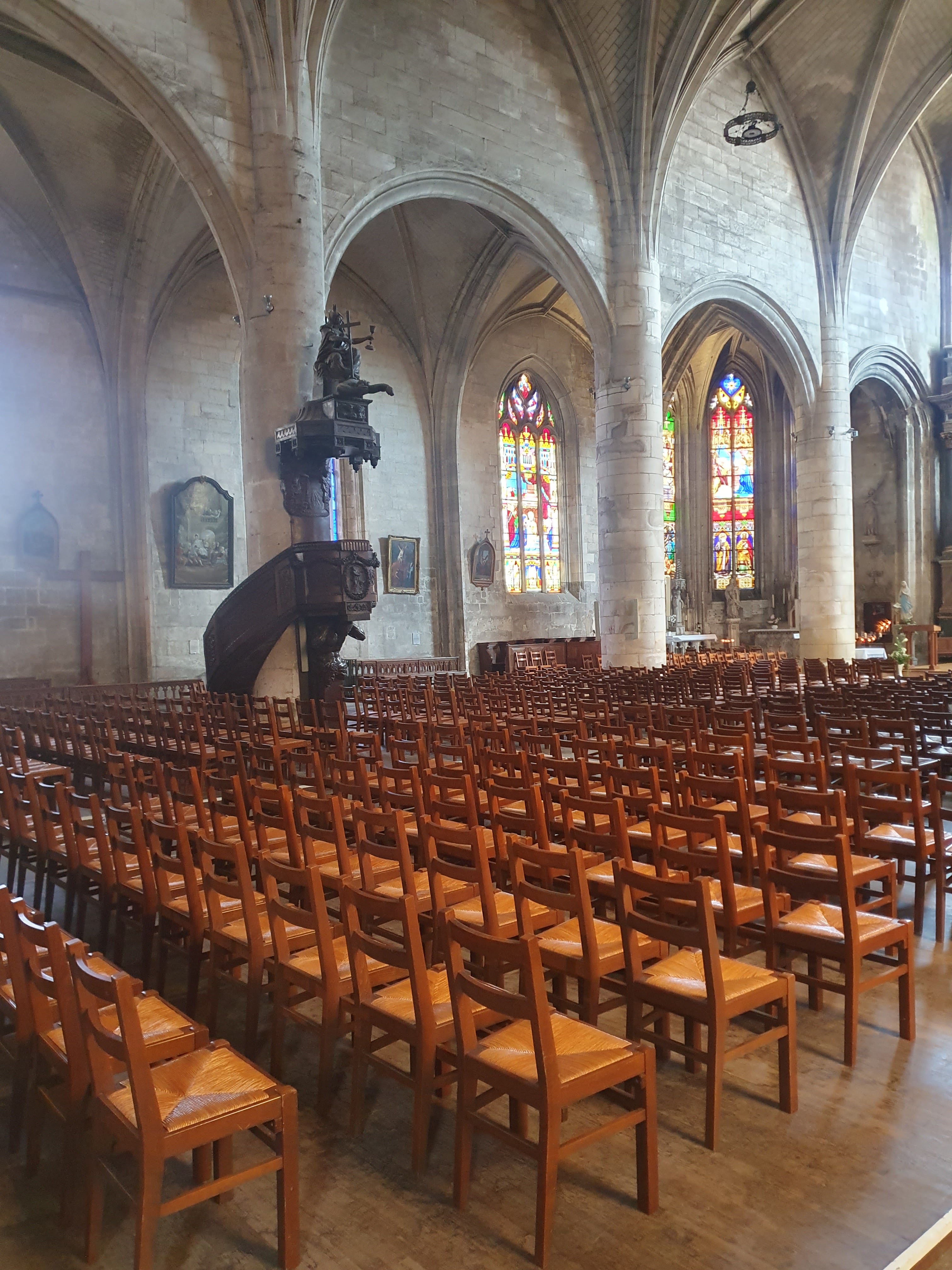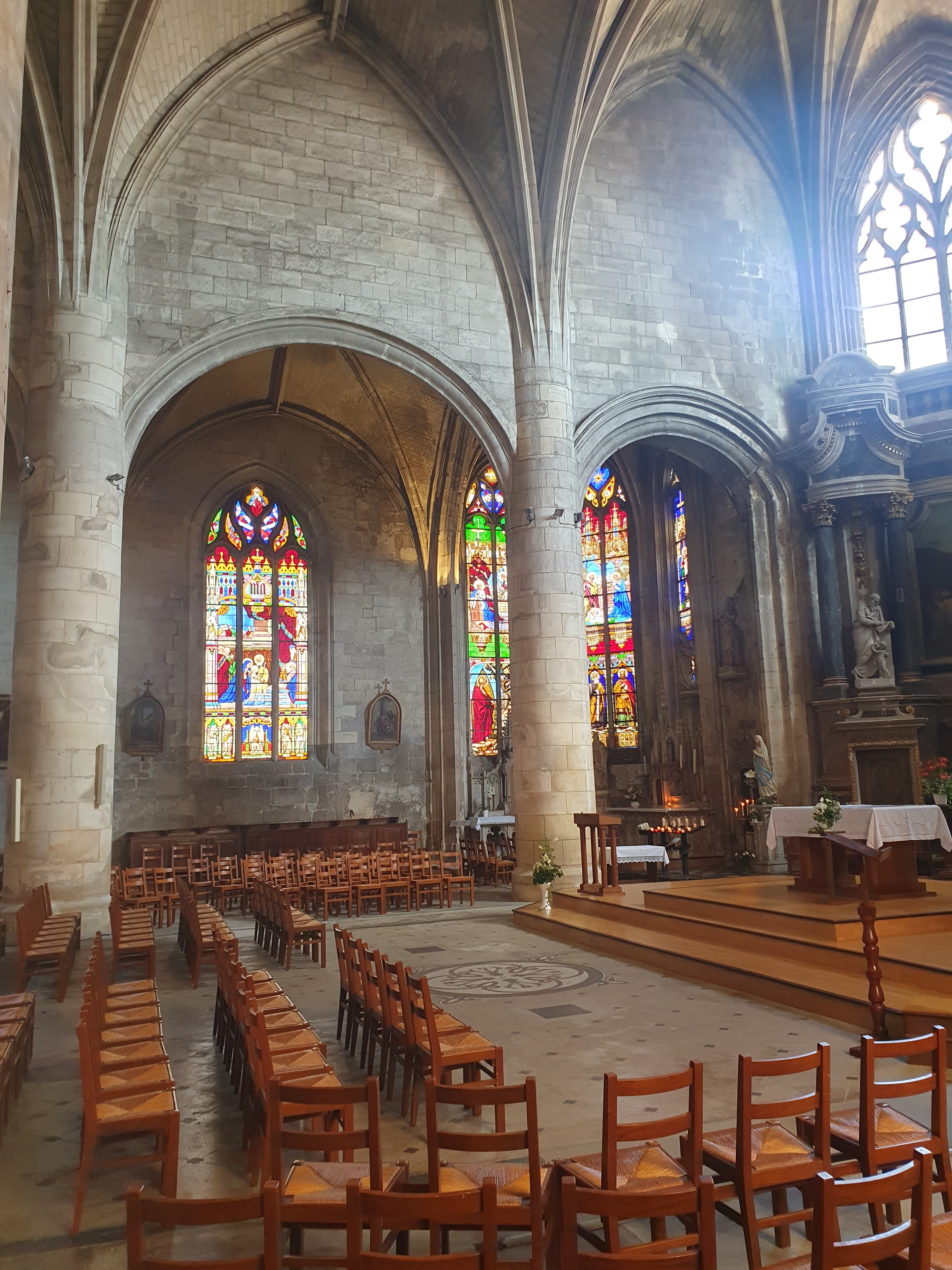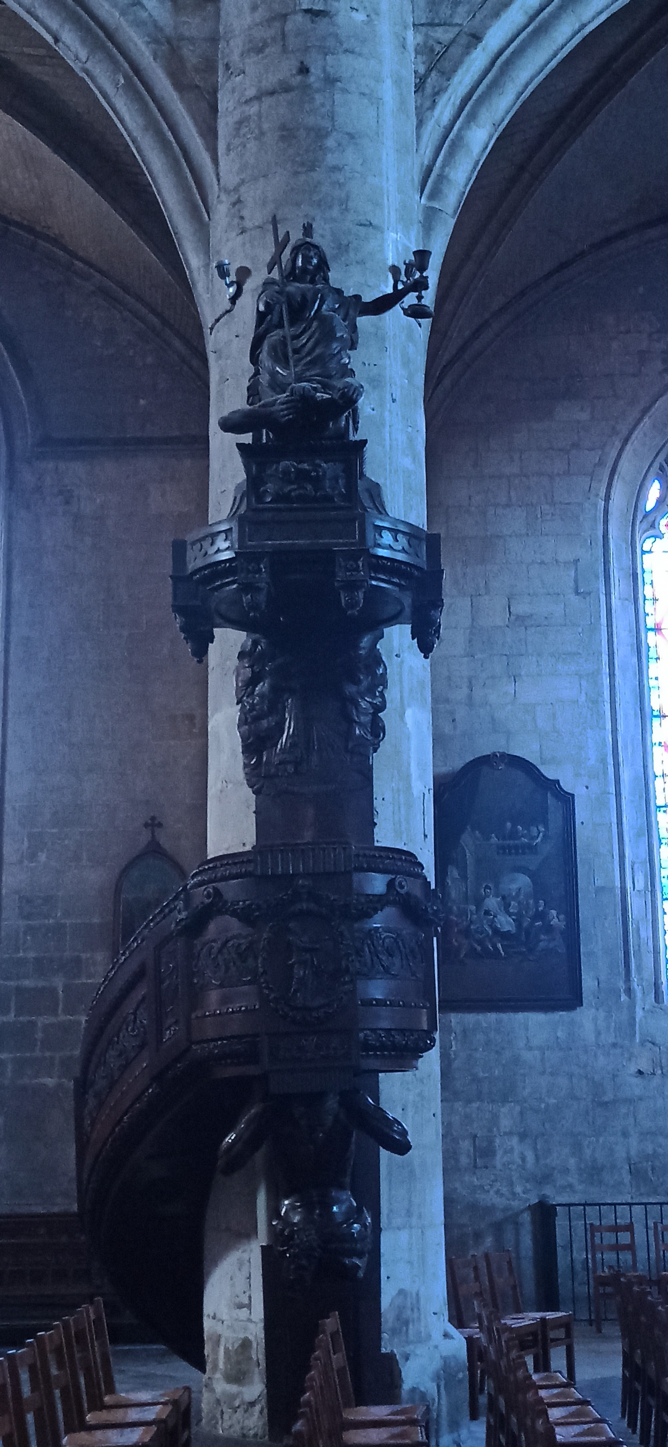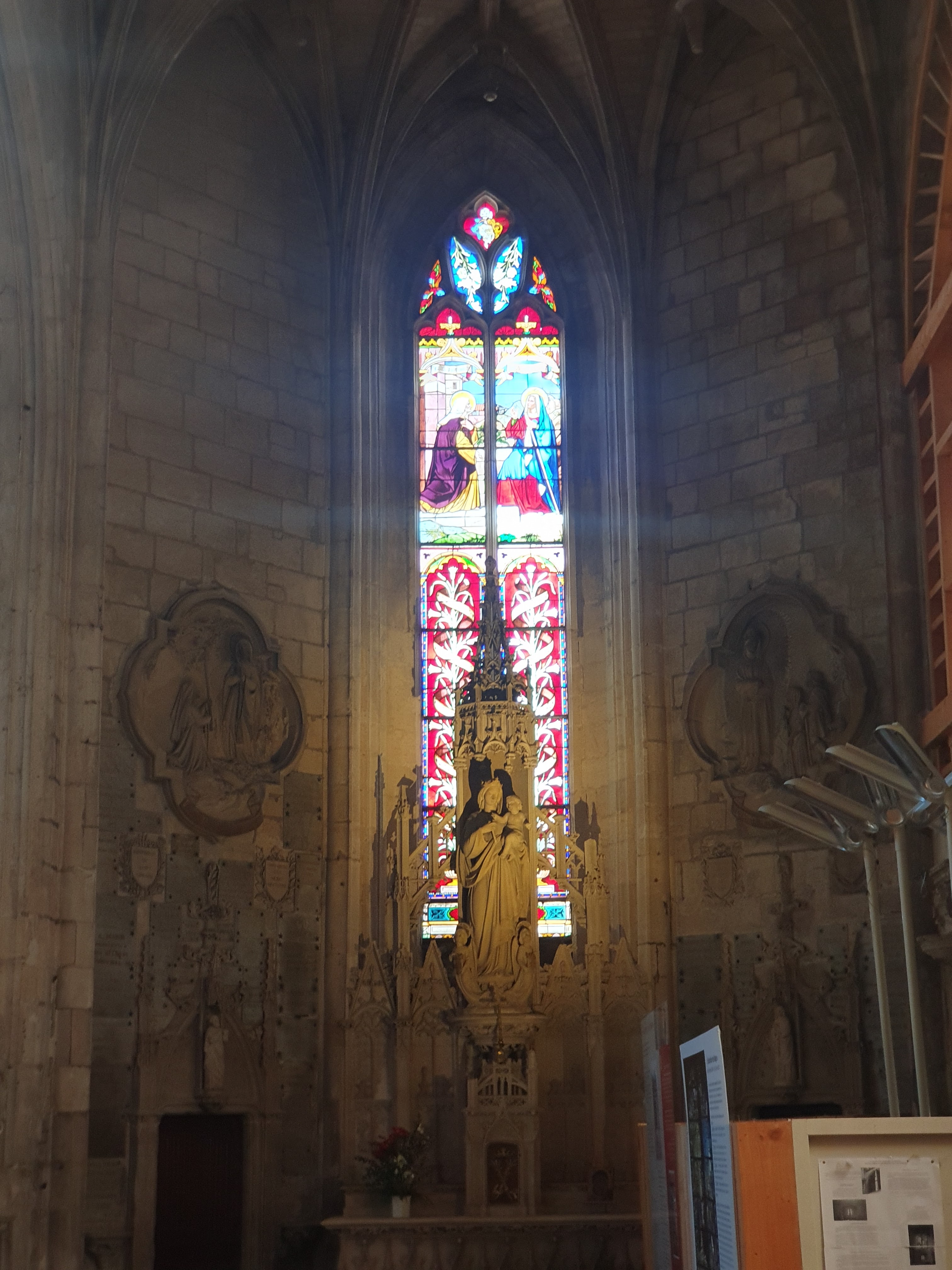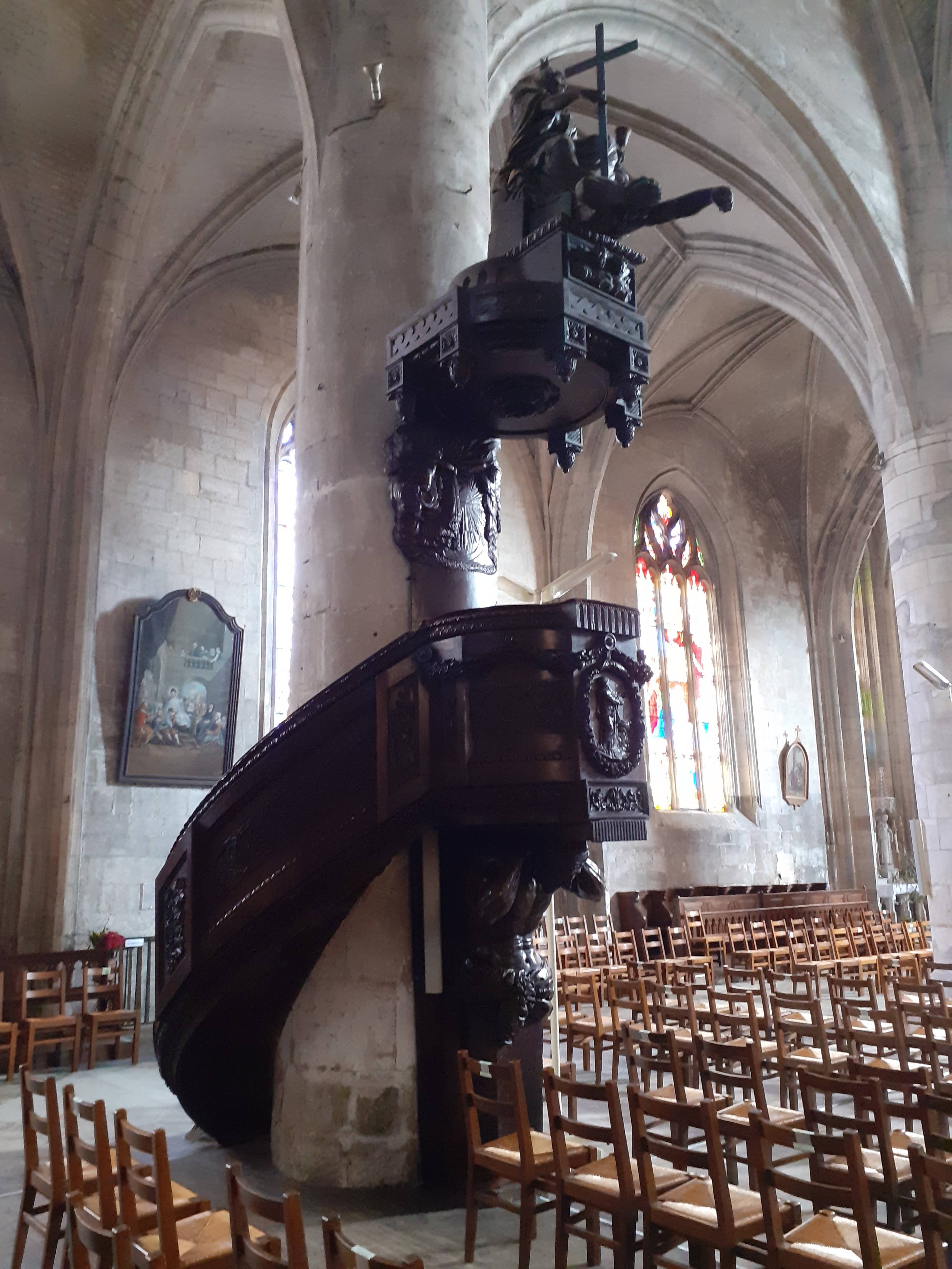 Dans cette église, j'ai vu l'une des plus belles cryptes que j'ai visitées. Elle remonte au XIe siècle et a été découverte, par hasard, lors de travaux effectués sur la nef centrale en 1846. Rien ne permet d'affirmer avec certitude à quoi elle servait à l'origine. Ces vestiges sont les plus anciens de toute la ville et de ses environs. L'église, de style gothique flamboyant, date de 1420 et sa flèche haute de 79 mètres domine la ville et ses environs (sa vue est également belle depuis le château qui se dresse à proximité). A l'intérieur, parmi tant de belles choses à voir, spectaculaire chaire de 1784 de l'artiste Elie Dronard.