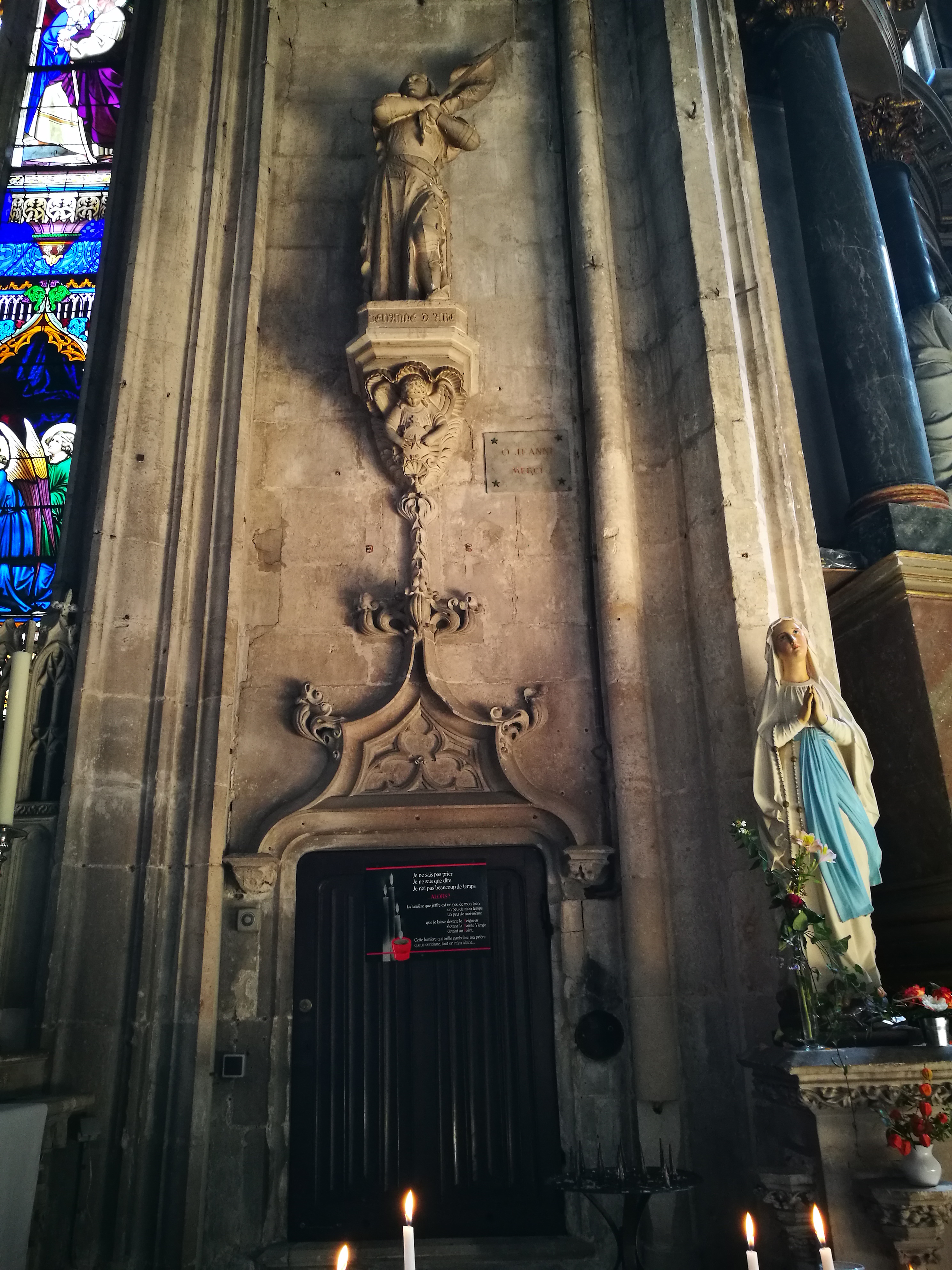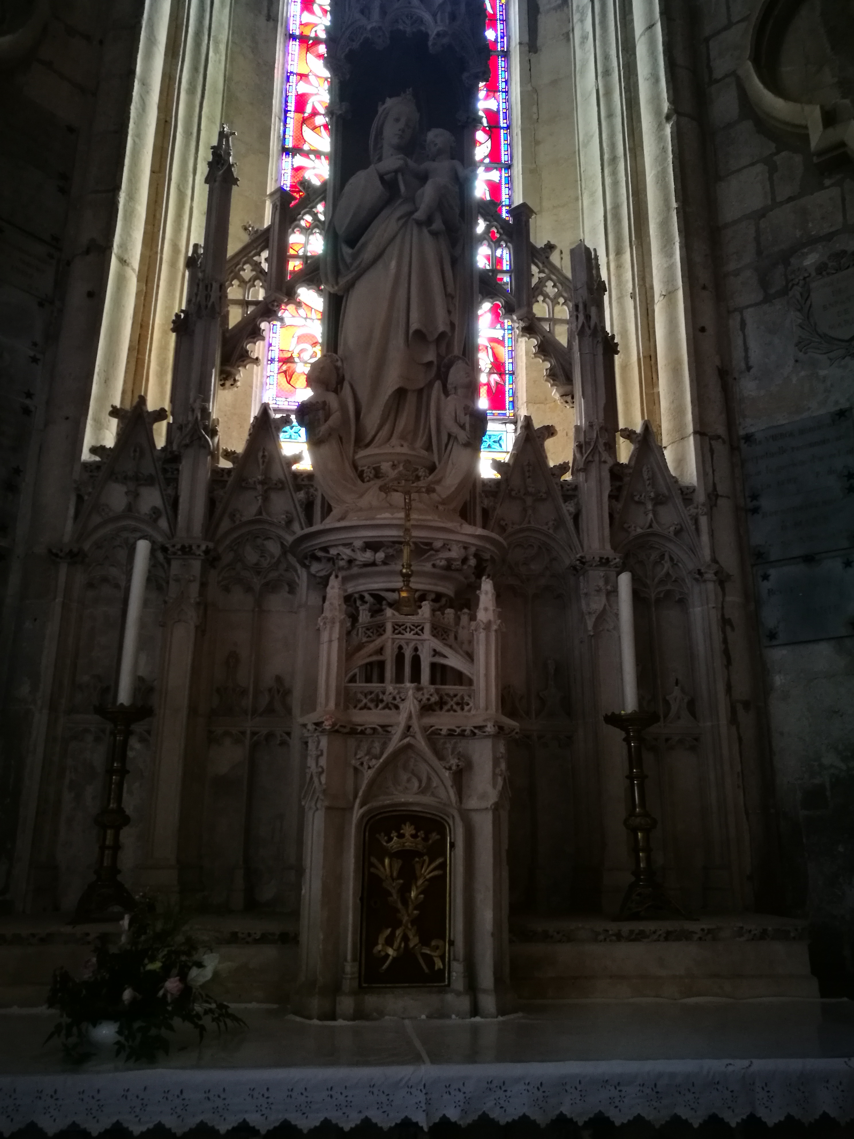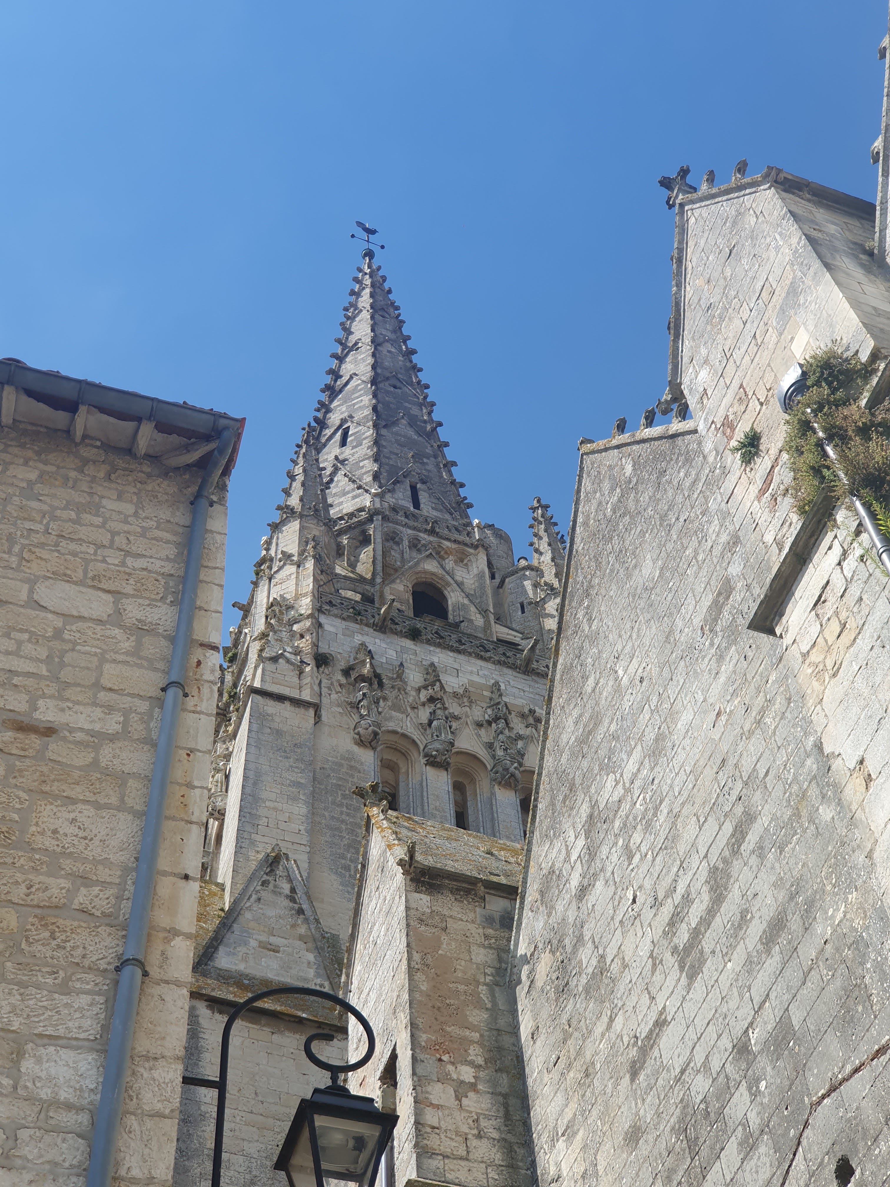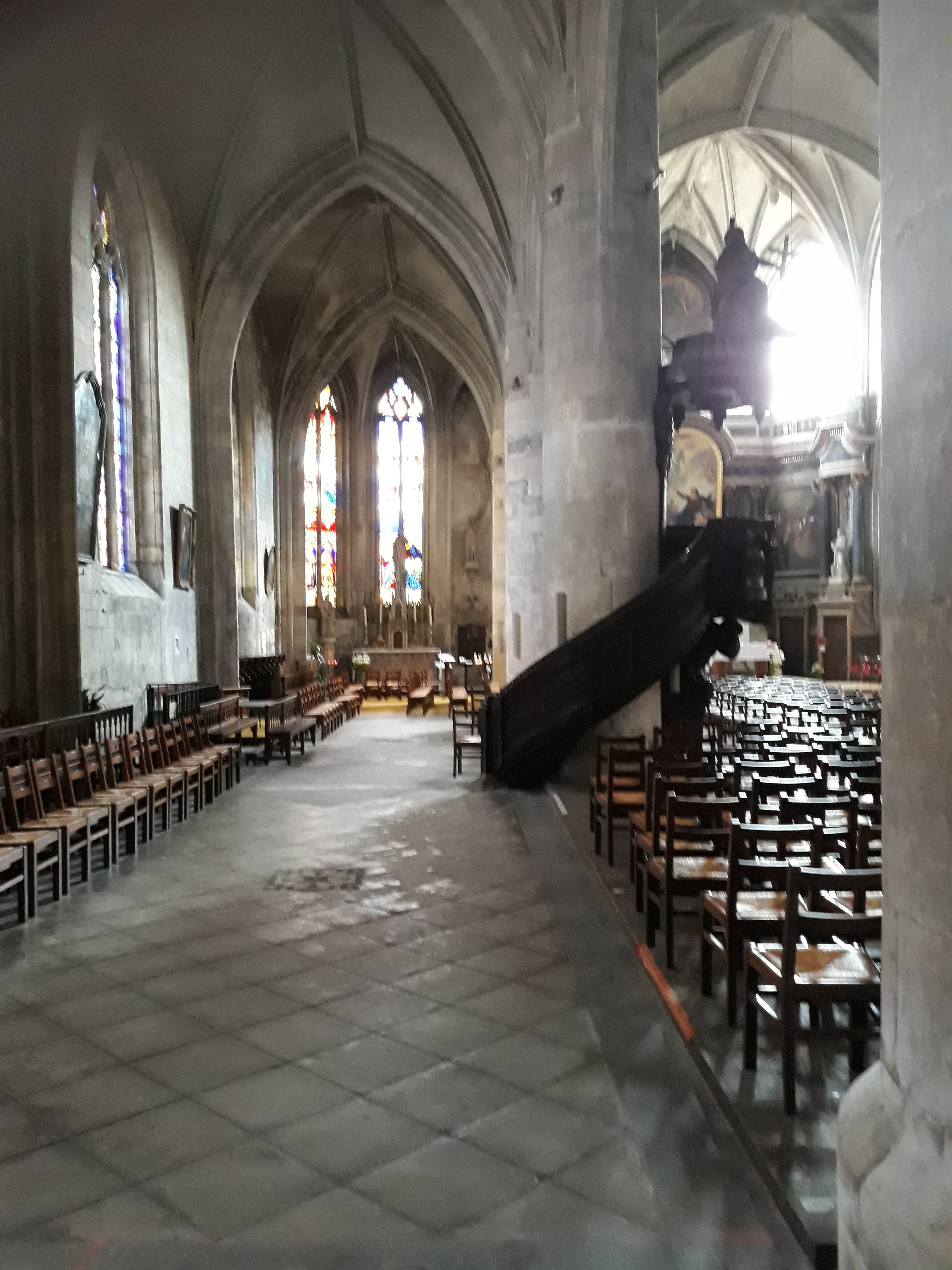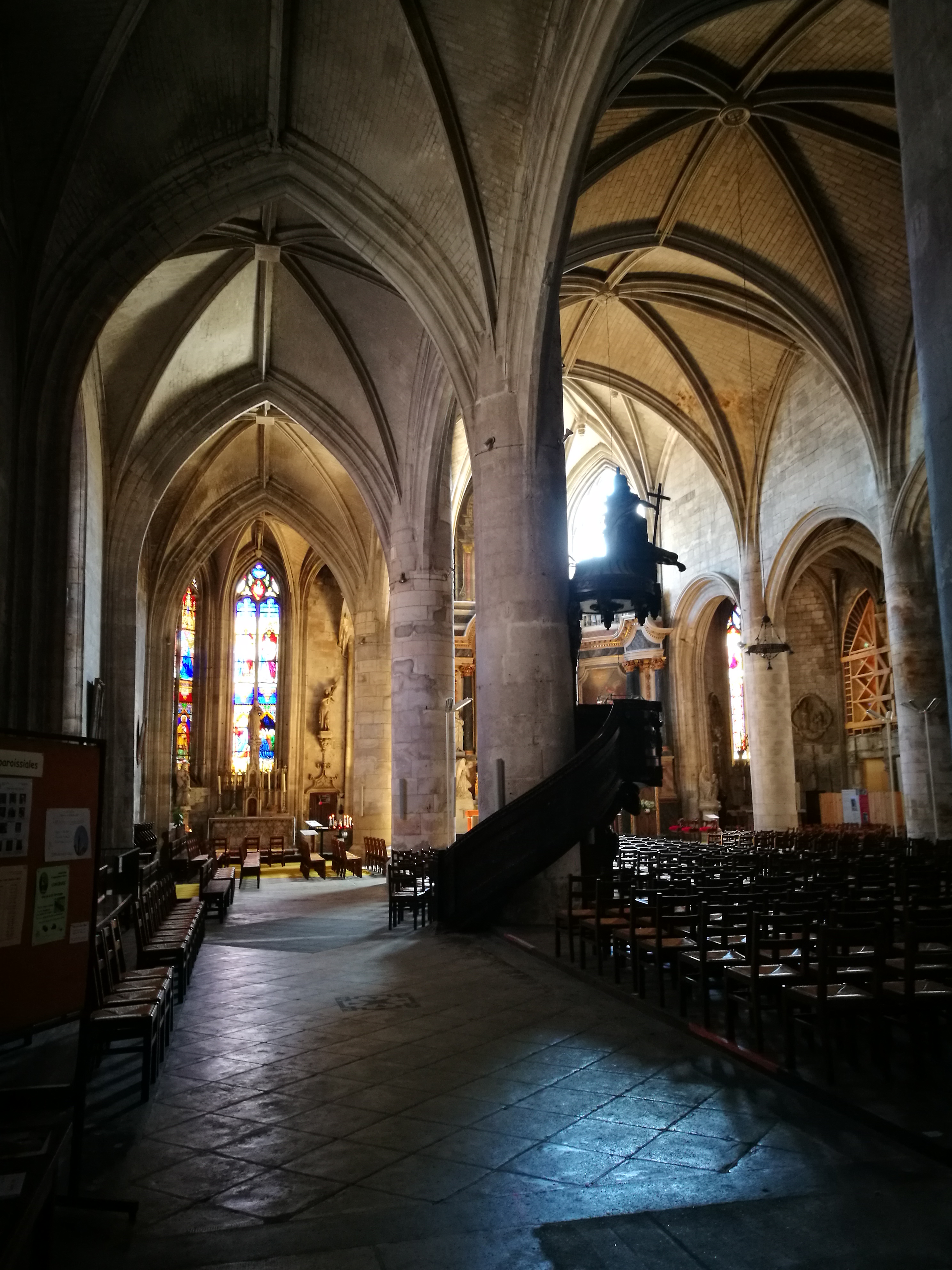 Dans cette église, j'ai vu l'une des plus belles cryptes que j'ai visitées. Elle remonte au XIe siècle et a été découverte, par hasard, lors de travaux effectués sur la nef centrale en 1846. Rien ne permet d'affirmer avec certitude à quoi elle servait à l'origine. Ces vestiges sont les plus anciens de toute la ville et de ses environs. L'église, de style gothique flamboyant, date de 1420 et sa flèche haute de 79 mètres domine la ville et ses environs (sa vue est également belle depuis le château qui se dresse à proximité). A l'intérieur, parmi tant de belles choses à voir, spectaculaire chaire de 1784 de l'artiste Elie Dronard.