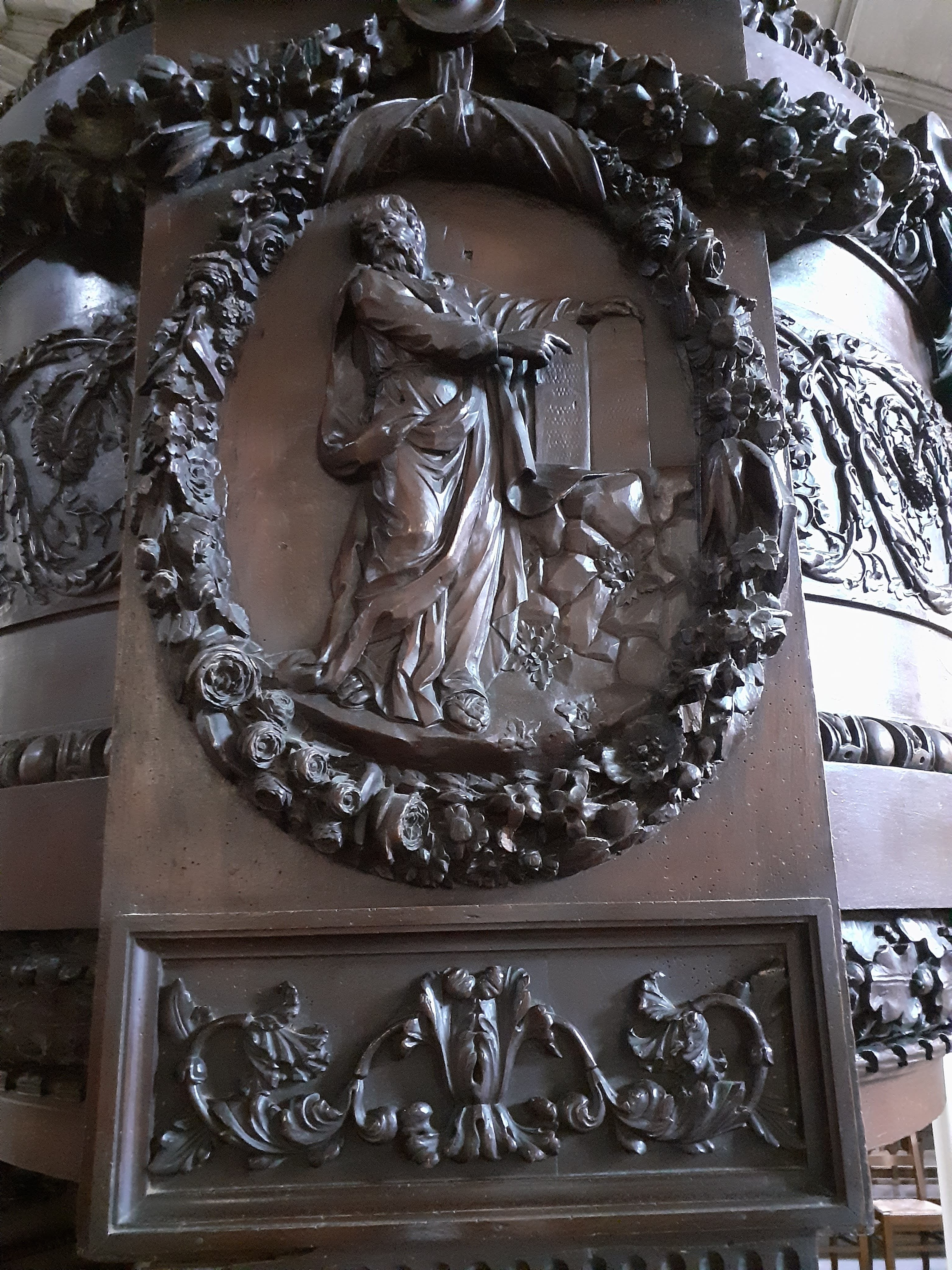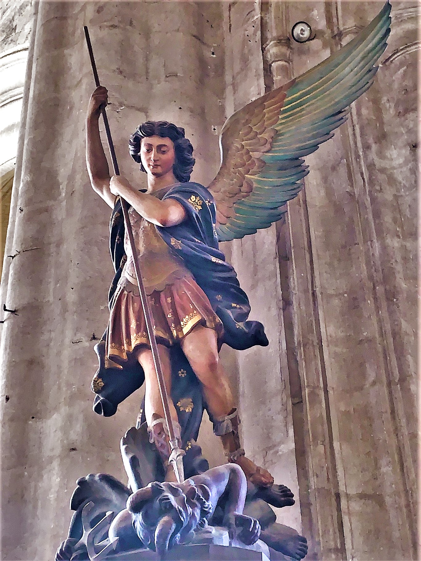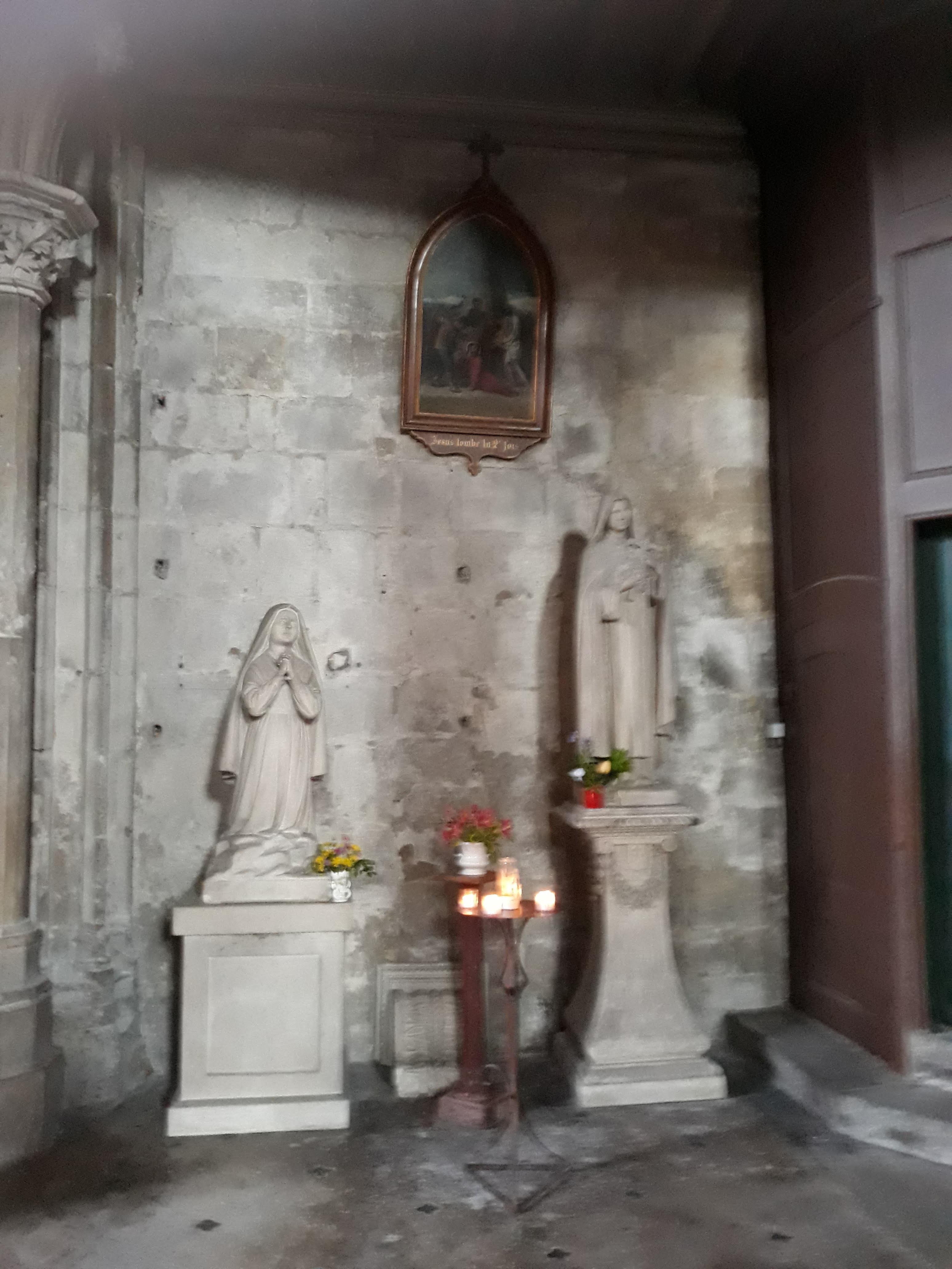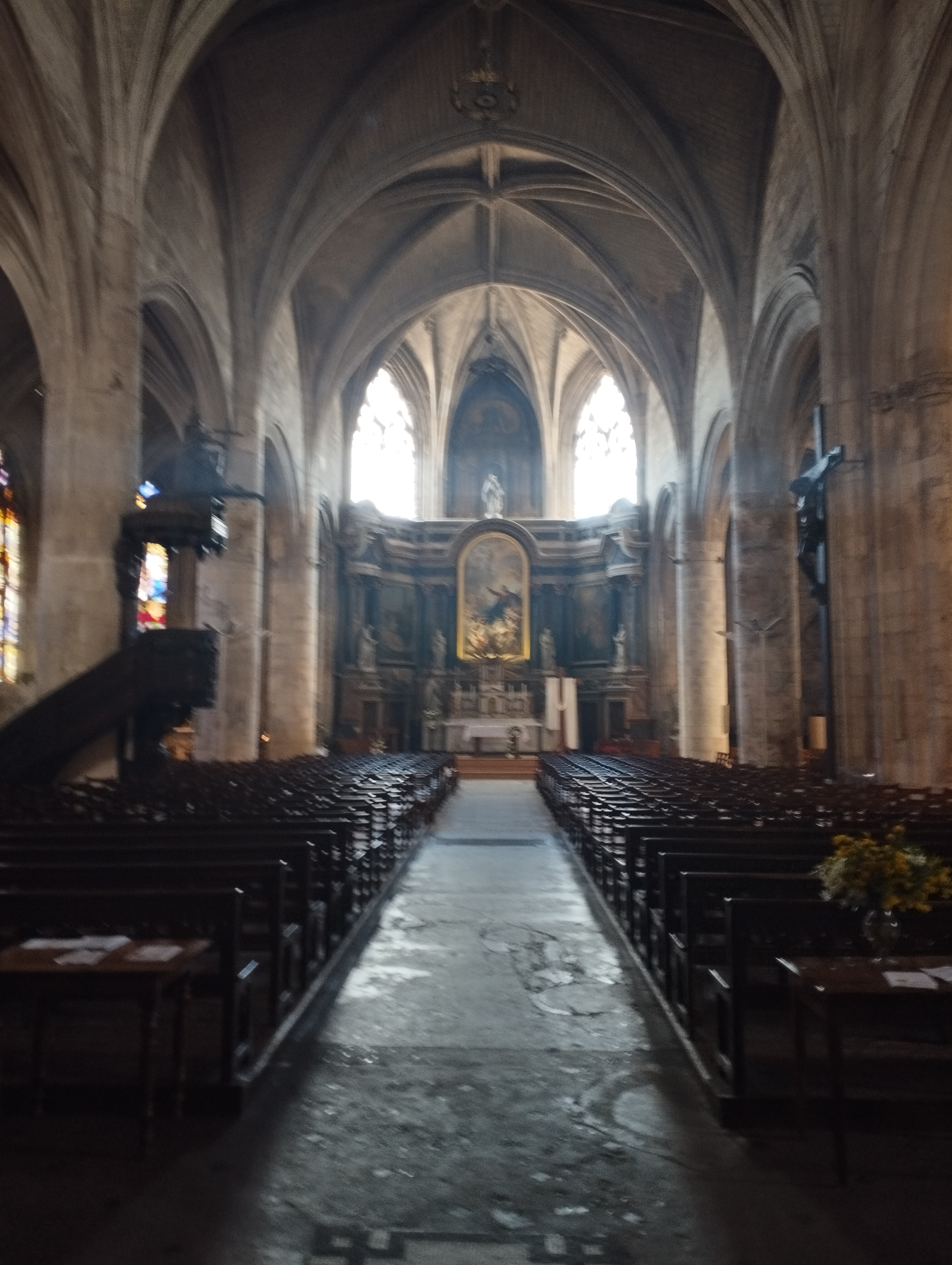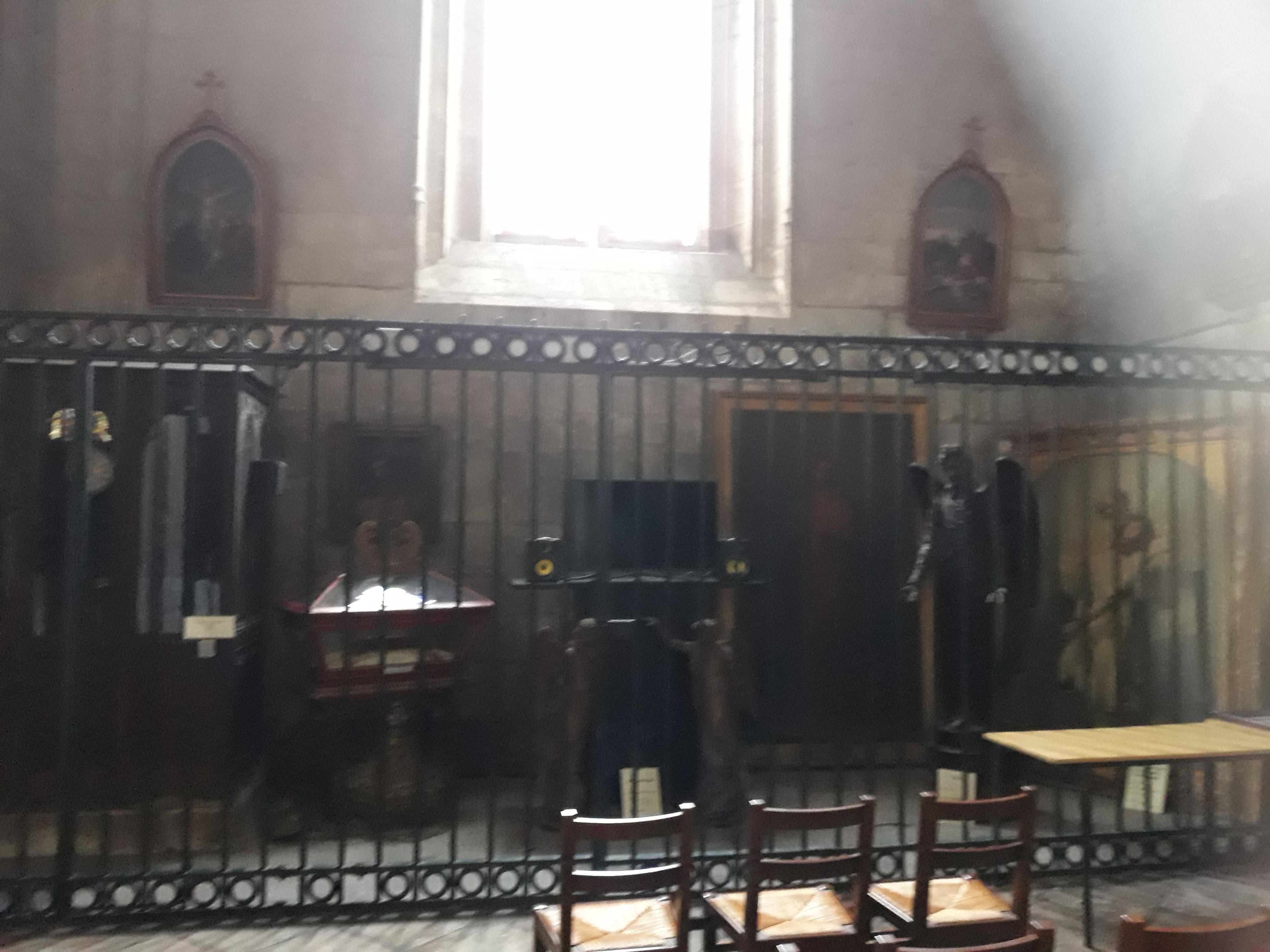 Dans cette église, j'ai vu l'une des plus belles cryptes que j'ai visitées. Elle remonte au XIe siècle et a été découverte, par hasard, lors de travaux effectués sur la nef centrale en 1846. Rien ne permet d'affirmer avec certitude à quoi elle servait à l'origine. Ces vestiges sont les plus anciens de toute la ville et de ses environs. L'église, de style gothique flamboyant, date de 1420 et sa flèche haute de 79 mètres domine la ville et ses environs (sa vue est également belle depuis le château qui se dresse à proximité). A l'intérieur, parmi tant de belles choses à voir, spectaculaire chaire de 1784 de l'artiste Elie Dronard.