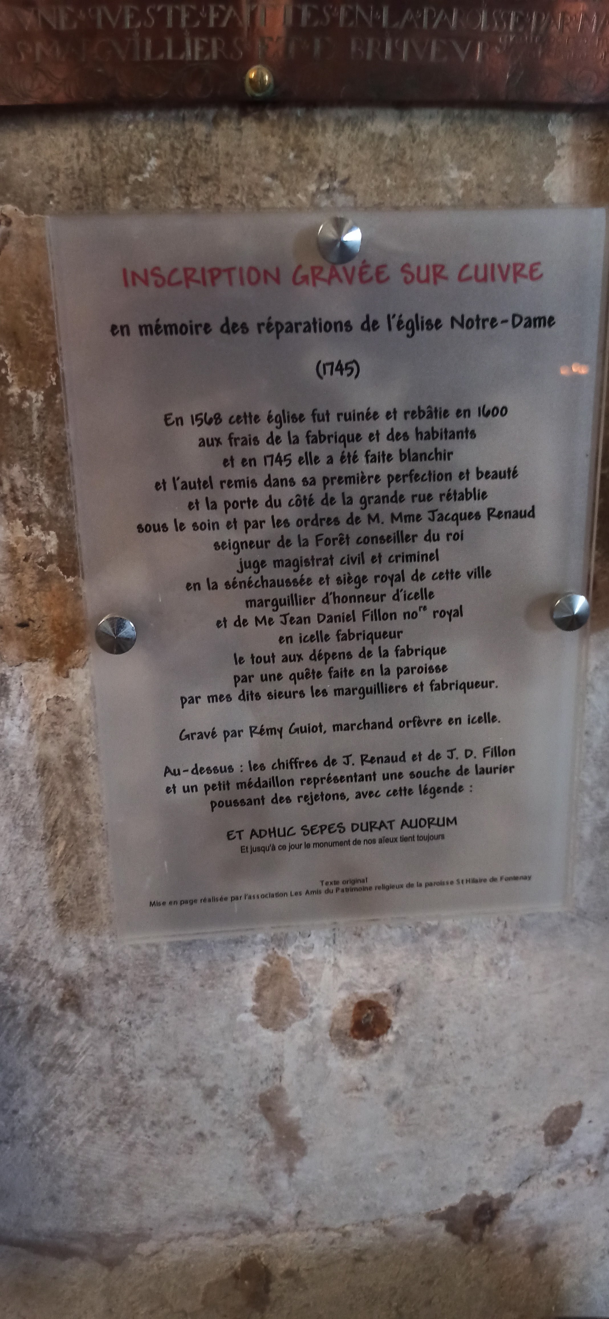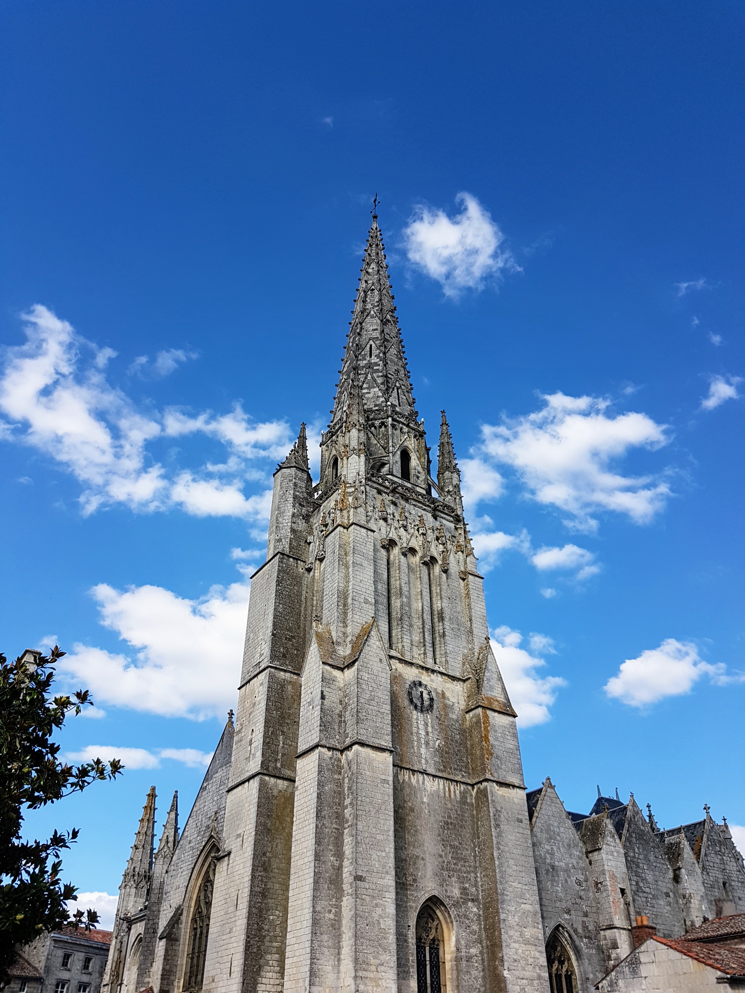 Une église à l'histoire mouvementée classée depuis 1862. Une crypte du 11ème pour une église construite au 15ème puis au 17ème et 19ème, qui n'aura été en bon état que quelques décennies tant les pillages, incendies et destructions diverses auront marqué son histoire. L’imposante flèche du clocher de plus de 80 m impressionne et plait aux visiteurs par ses proportions harmonieuses et la pureté de ses lignes. De très belles choses sont à découvrir à l'intérieur. Deux ans après, de retour à Fontenay-le-Comte, cette église m'est apparue toujours aussi intéressante comme témoin de l'histoire de la cité. Elle mériterait quelques investissements pour une restauration qui lui redonnerait son lustre et de la fraîcheur ; trouver l'argent dans ces cas-la est toujours complexe. J'en ai profiter pour découvrir les autres monuments religieux de cette ville. En face de l'église Notre-Dame de l'Assomption, de l'autre côté de la place, la Chapelle de l'Union Chrétienne mérite une visite. Une chapelle vaste et vivante, une architecture accueillante, une messe s'y déroule tous les jours, les paroissiens sont en nombre, j'en suis témoin. L'Ancien couvent des Carmélites-Déchaussées, situé à proximité, un patrimoine certainement intéressant mais inaccessible et dont on peut entrevoir les extérieurs seulement en jouant les paparazzis. Propriété privée qui bénéficie d'aucunes mise en valeur ou politique d'accueil. En traversant La Vendée, affluent de la Sèvre Niortaise, on peut découvrir l'église Saint-Jean-Baptiste, fermée lors de mon passage pour cause de travaux de restaurations.