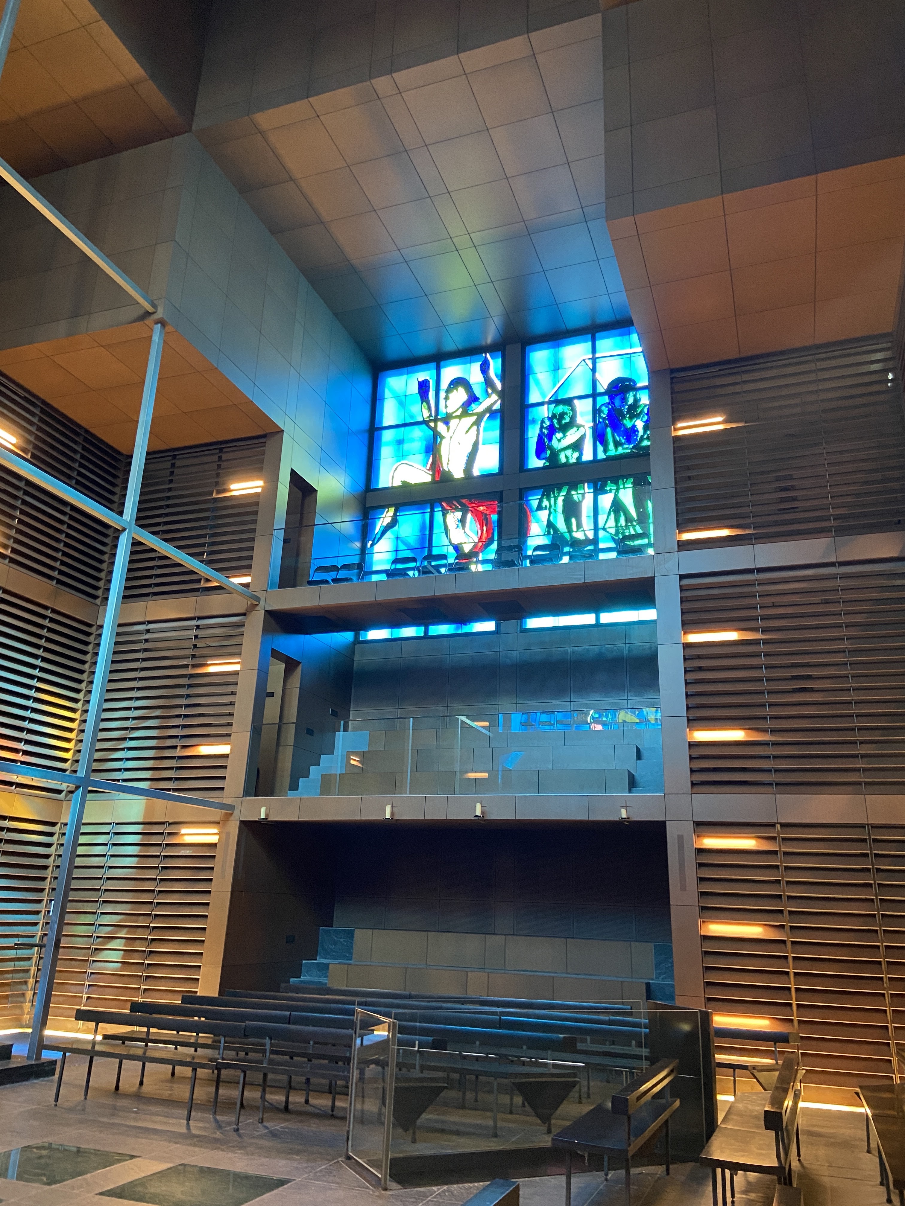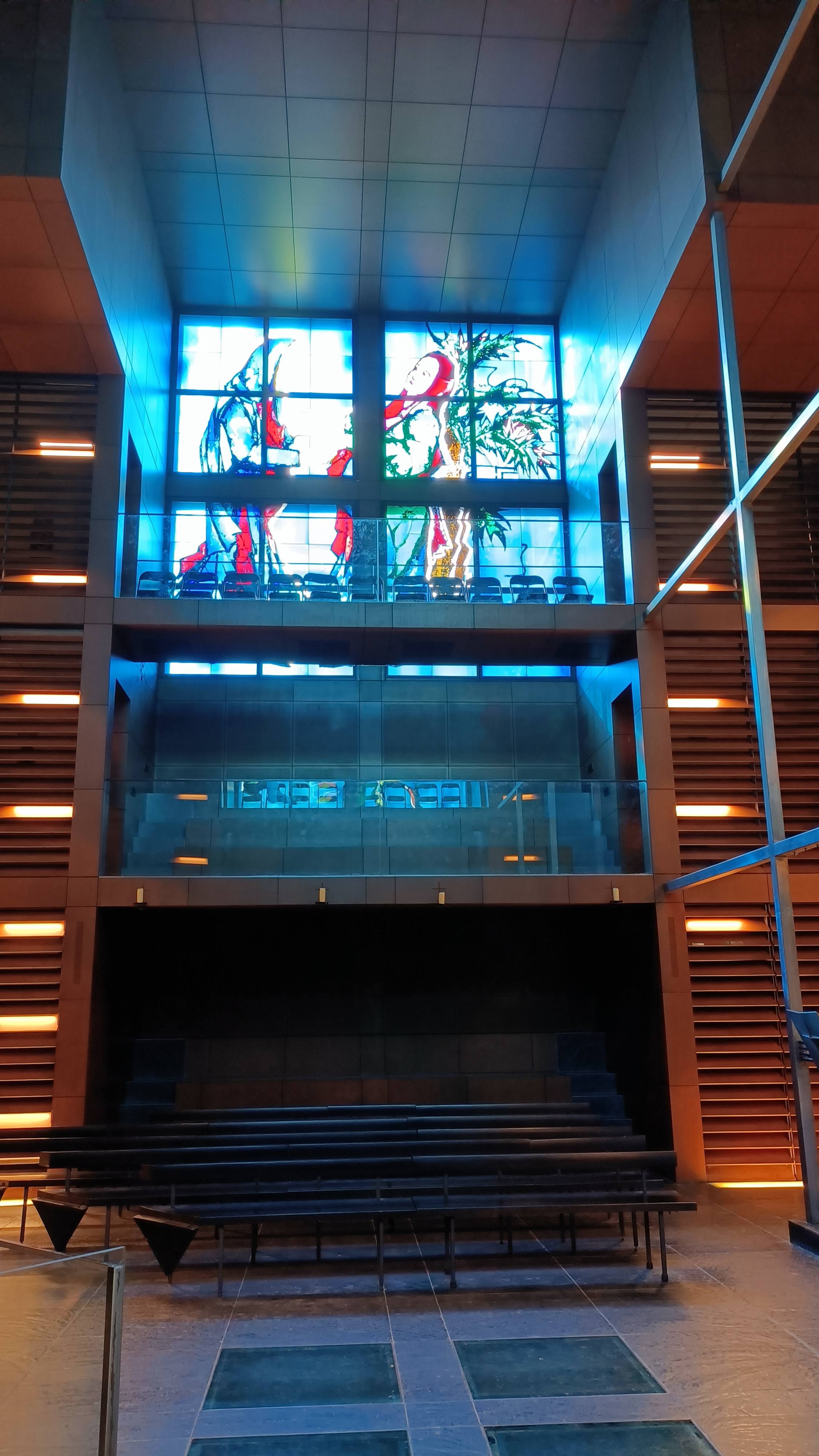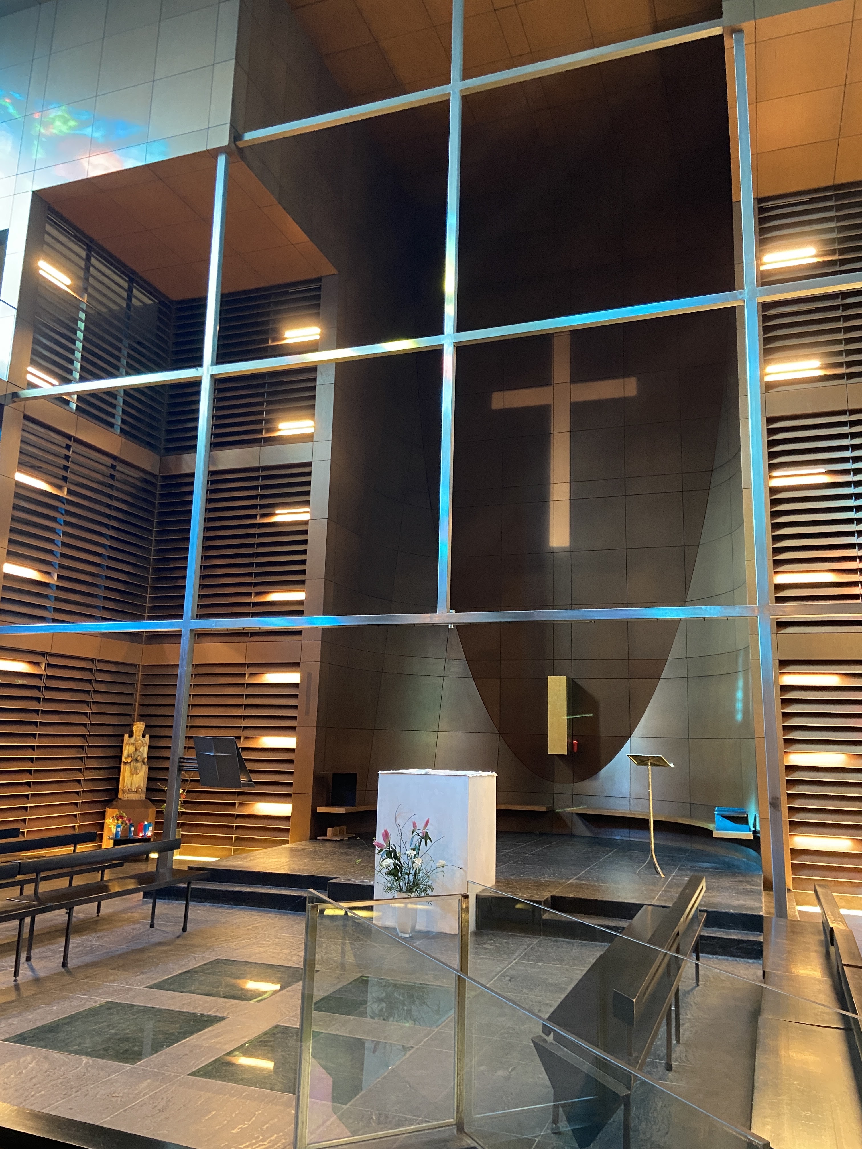 Cette conception architecturale est atypique mais sa modernité en fait un lieu où il est agréable de se recueillir. L'acoustique est bonne, le plancher en verre laisse apparaître les fonds baptismaux situés à rez-de-chaussée. C'est à voir.