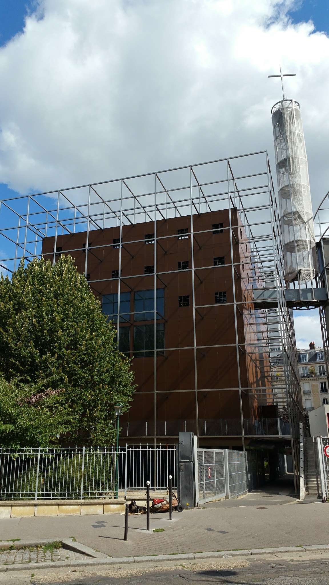 La dernière église construite à la fin du 20 e siècle à Paris. Église au 1er étage. La couleur marron, extérieure symbolise l arche de Noe.