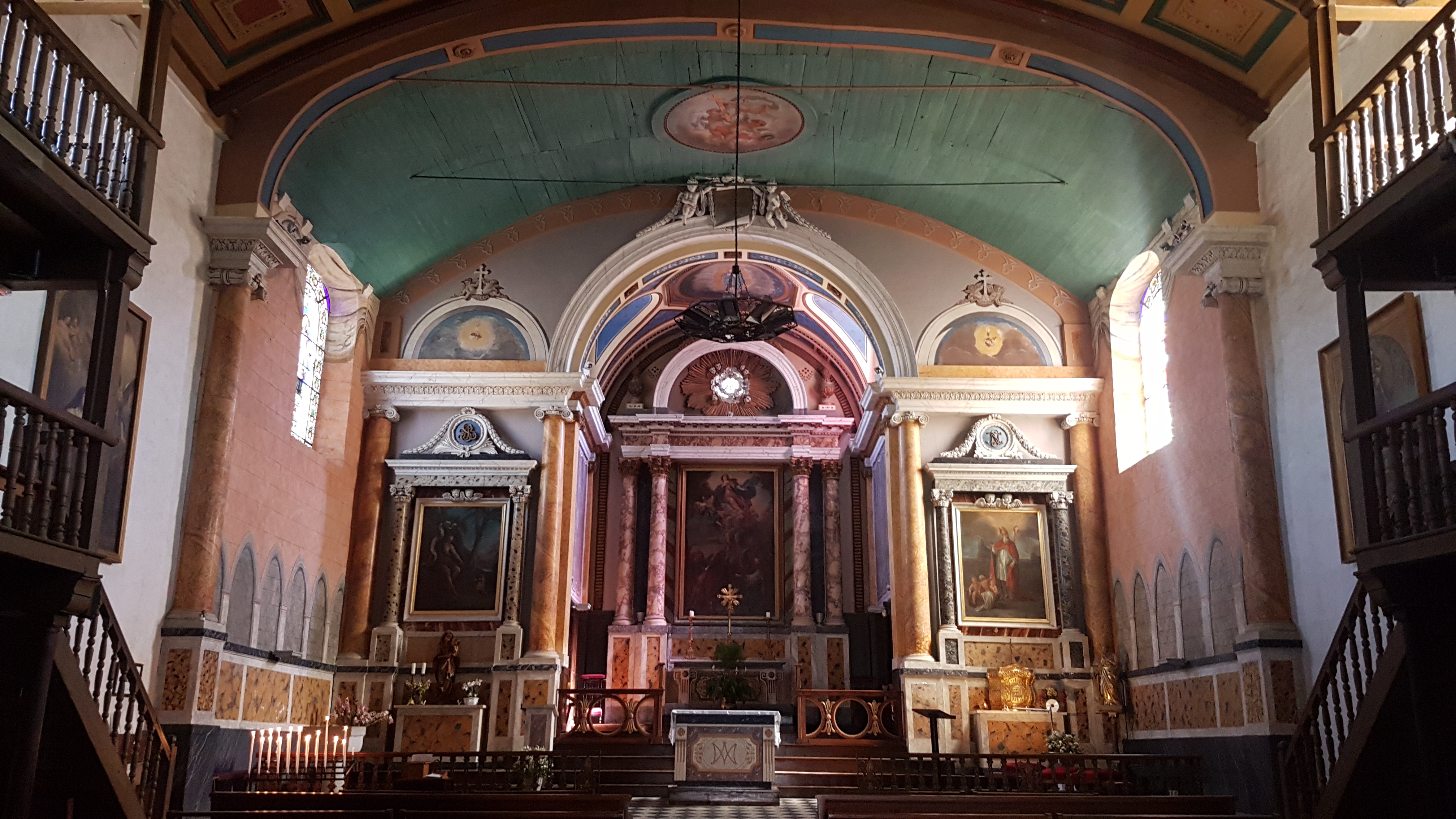 L'intérieur est dans la lignée des autres églises de la région mais l'intérêt de cet édifice-ci réside dans ses atours.