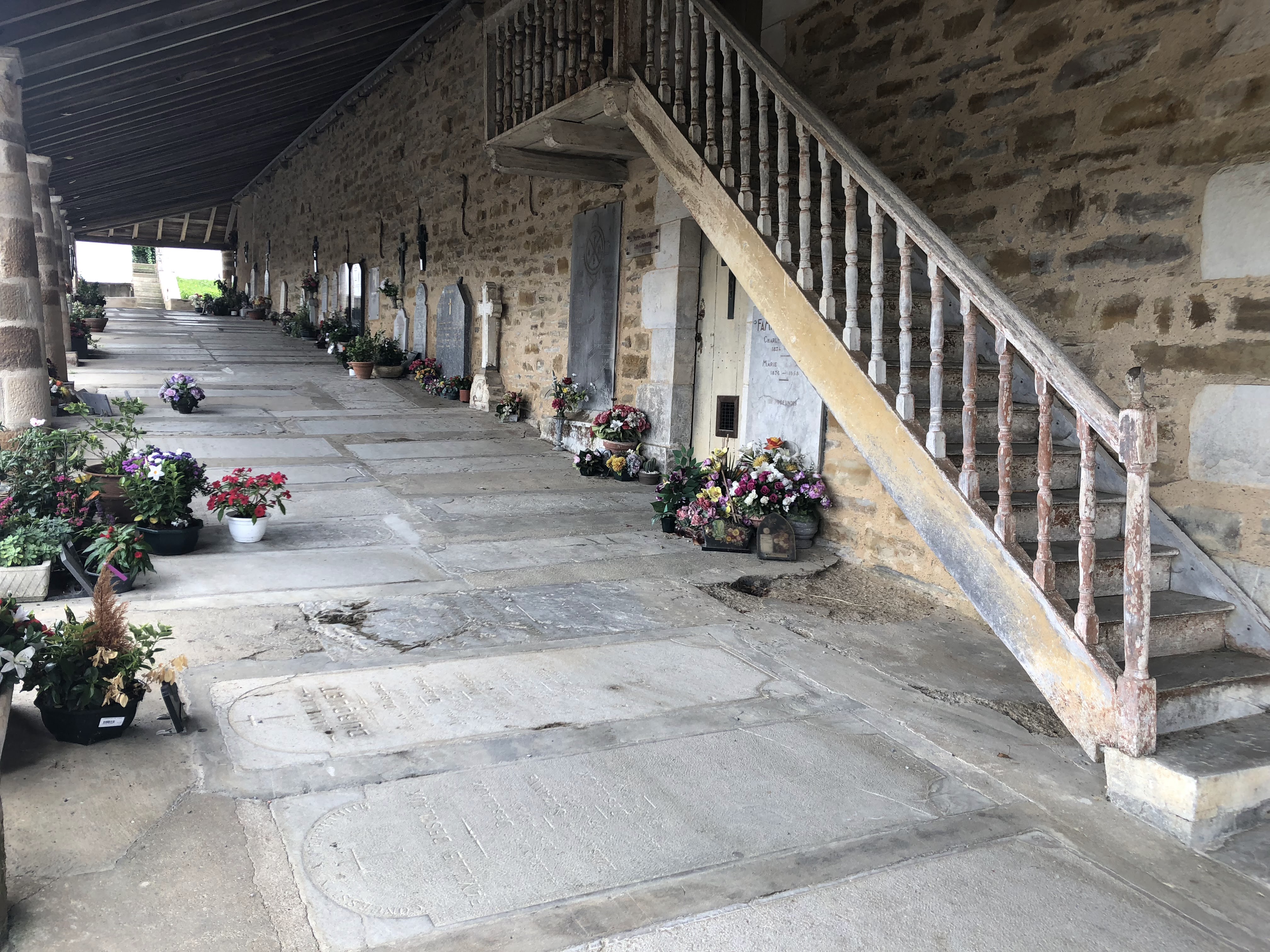 Étrange, l'intérieur ressemble à un parc à bébé d'antan, les dalles du cimetière envahissent tout.