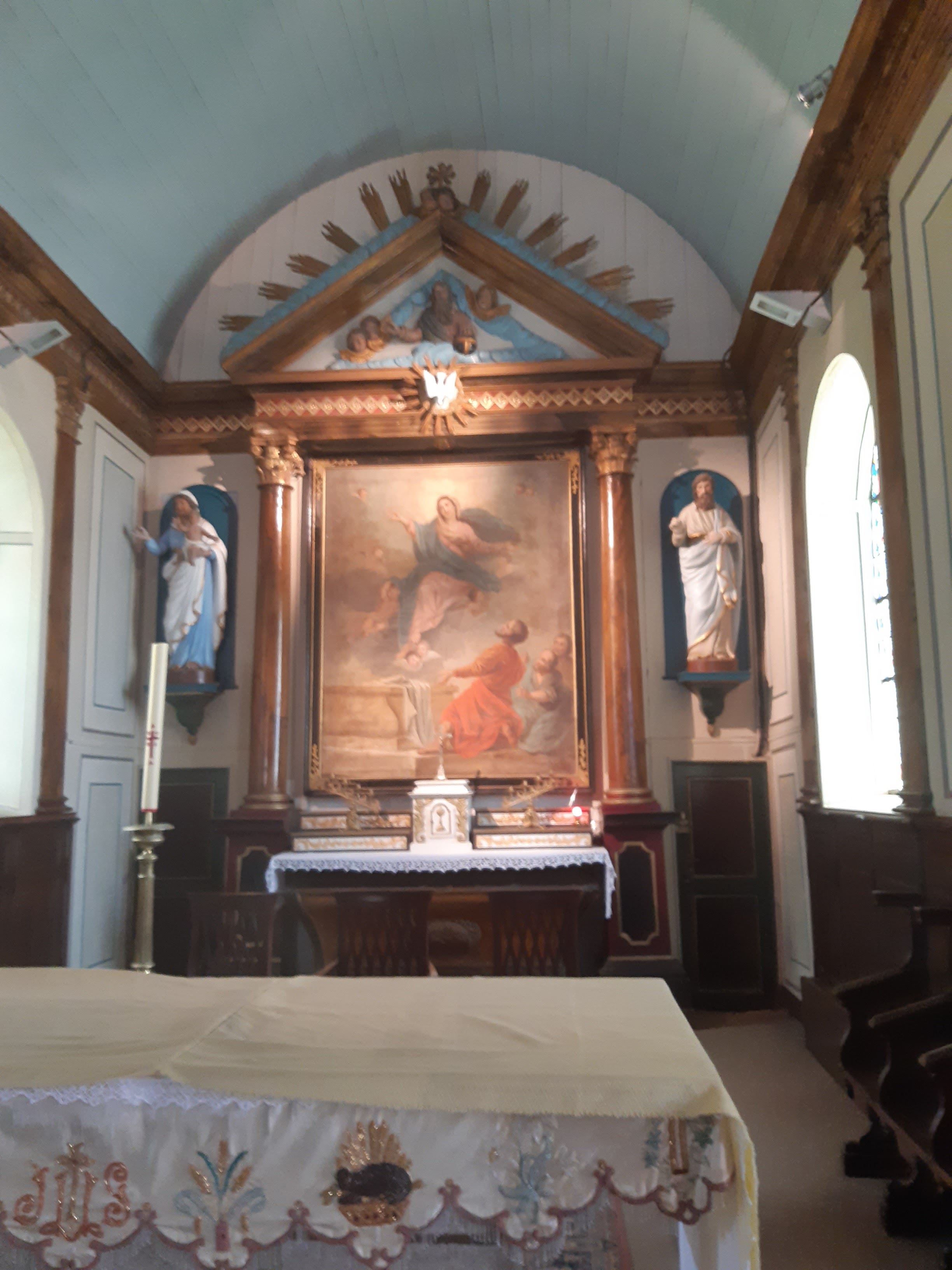 Église toute simple. 2 bateaux en voûte. Très beau tableau de l'apparition de la Vierge.