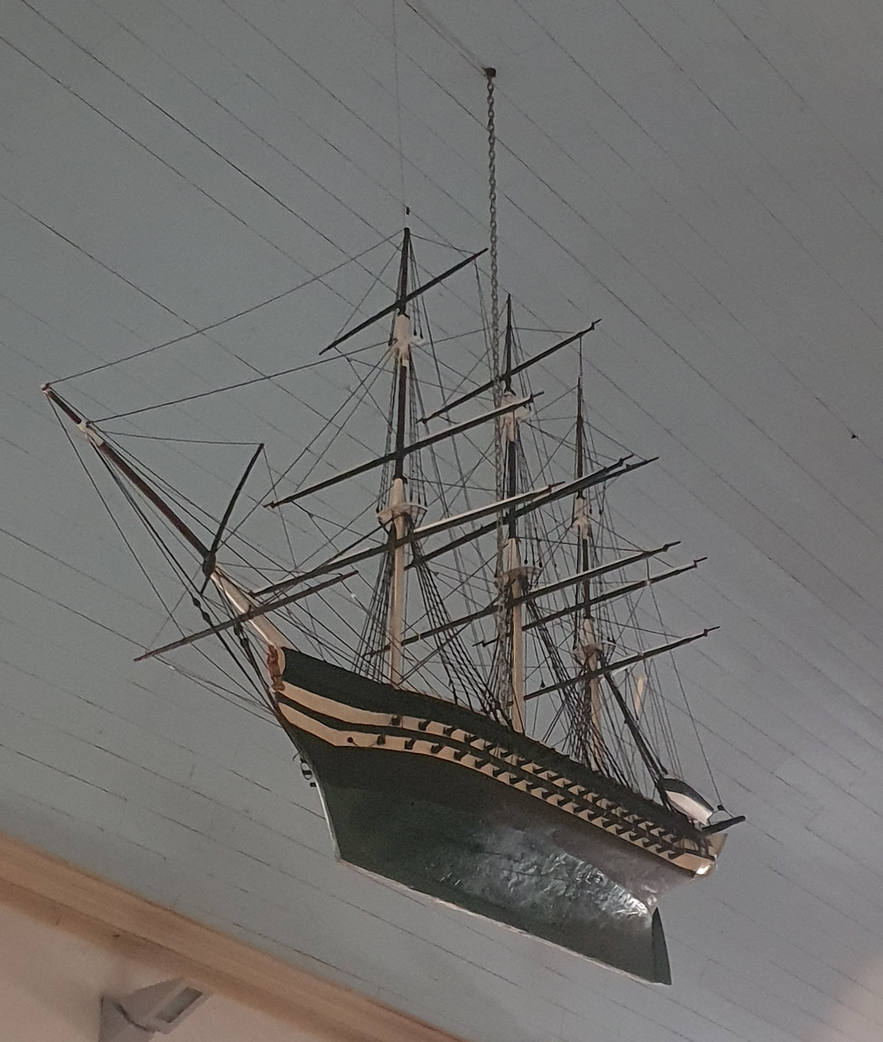 Jolie église du XIXeme siècle avec des maquettes de bateaux accrochées dans la nef.