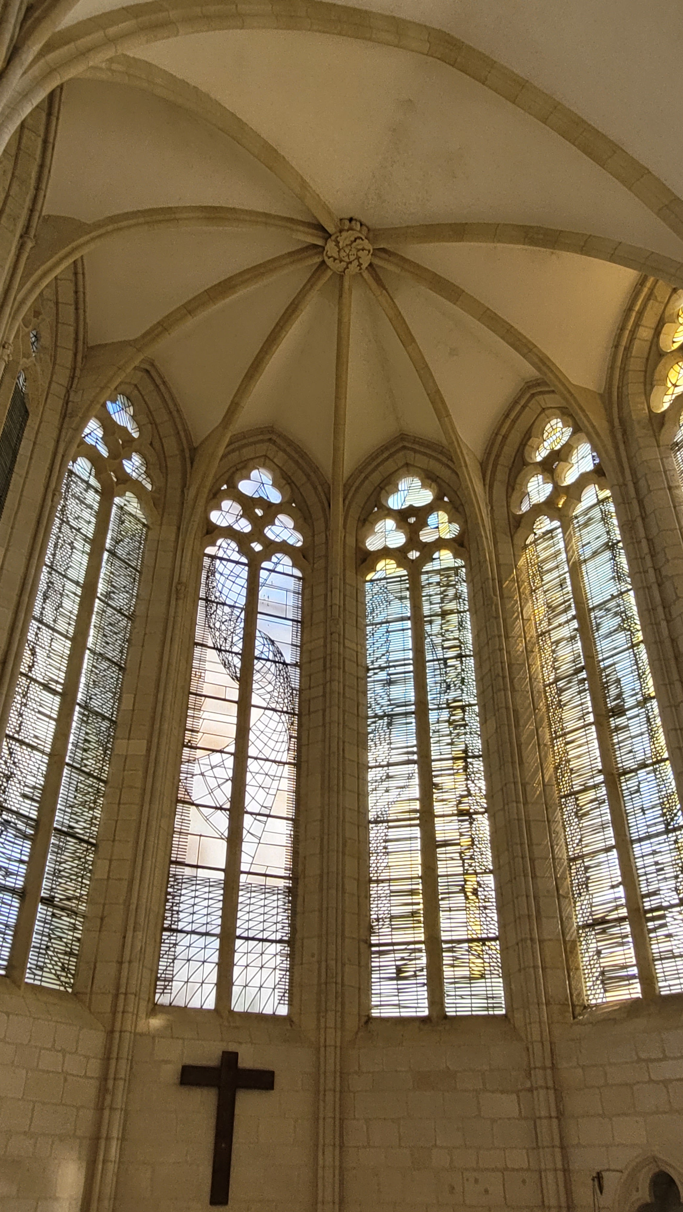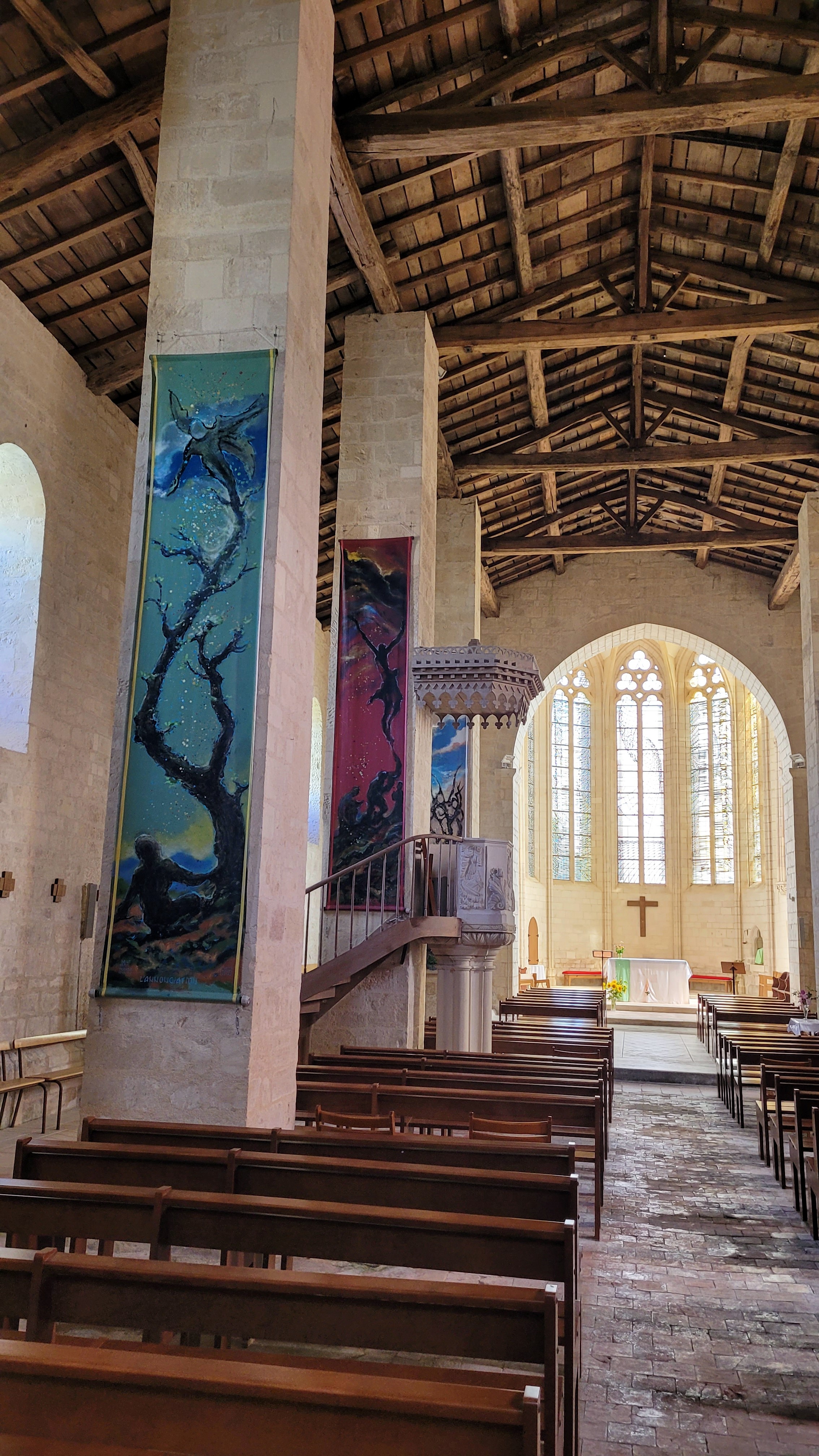 Les vitraux sont modernes. Le plafond tout en bois. De grandes fresques verticales sur des toiles. Quand aux orgues?, je ne sais pas s'ils fonctionnent. En tout cas j'ai vraiment aimé entrer dans cette église. Aucune ne se ressemble c'est là le plaisir des yeux.