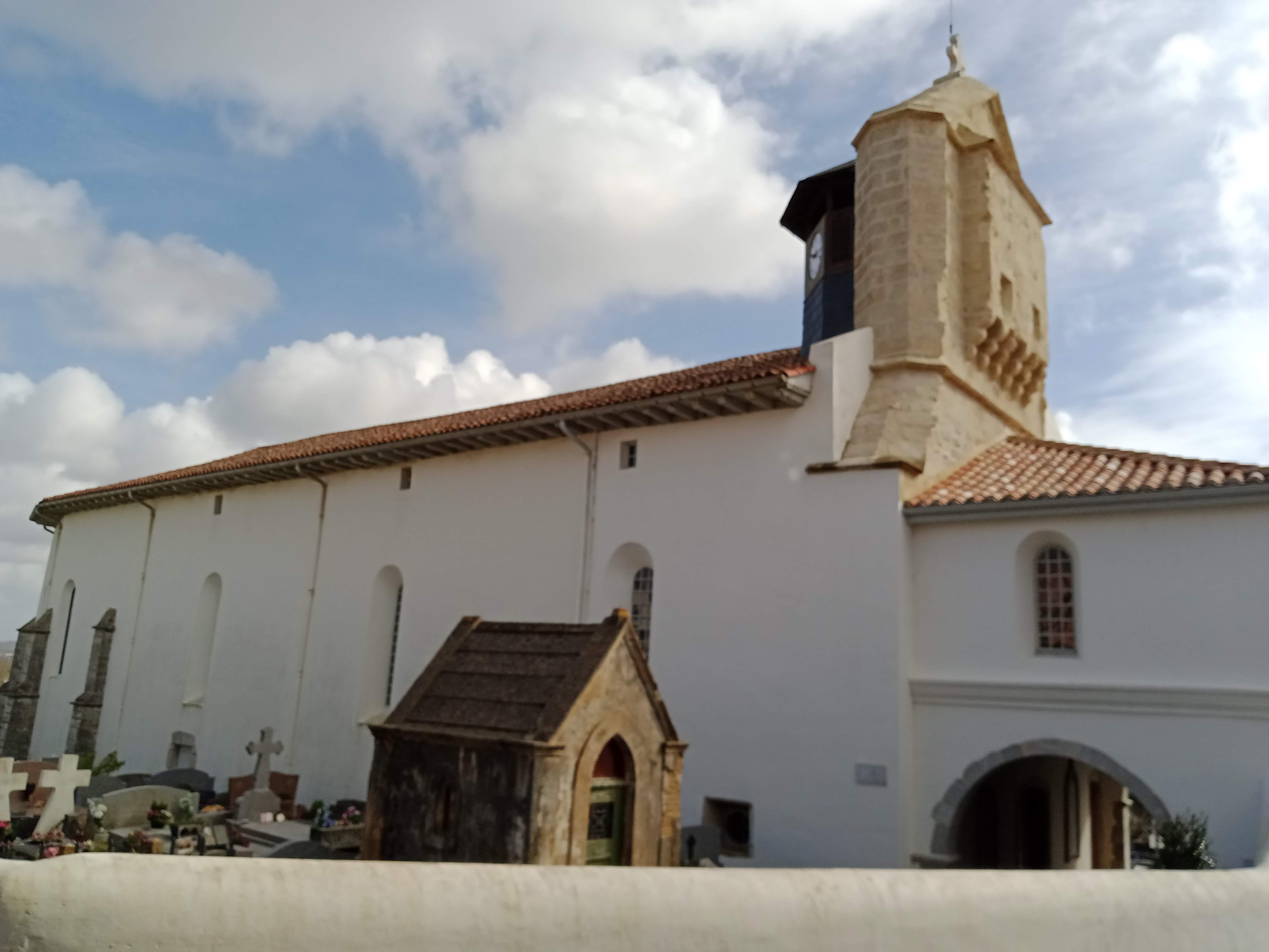 Très belle église, simple d'extérieur mais interieur avec des magnifiques tableaux de la procession et un bel autel... A voir... Messe dite par un prêtre noir et mêlant les langues : francais, basque et latin, très appréciable. (missel et feuillet indicatif distribué ou mis à disposition) Station debout un peu longue quand on est opérée récente d'un genou...