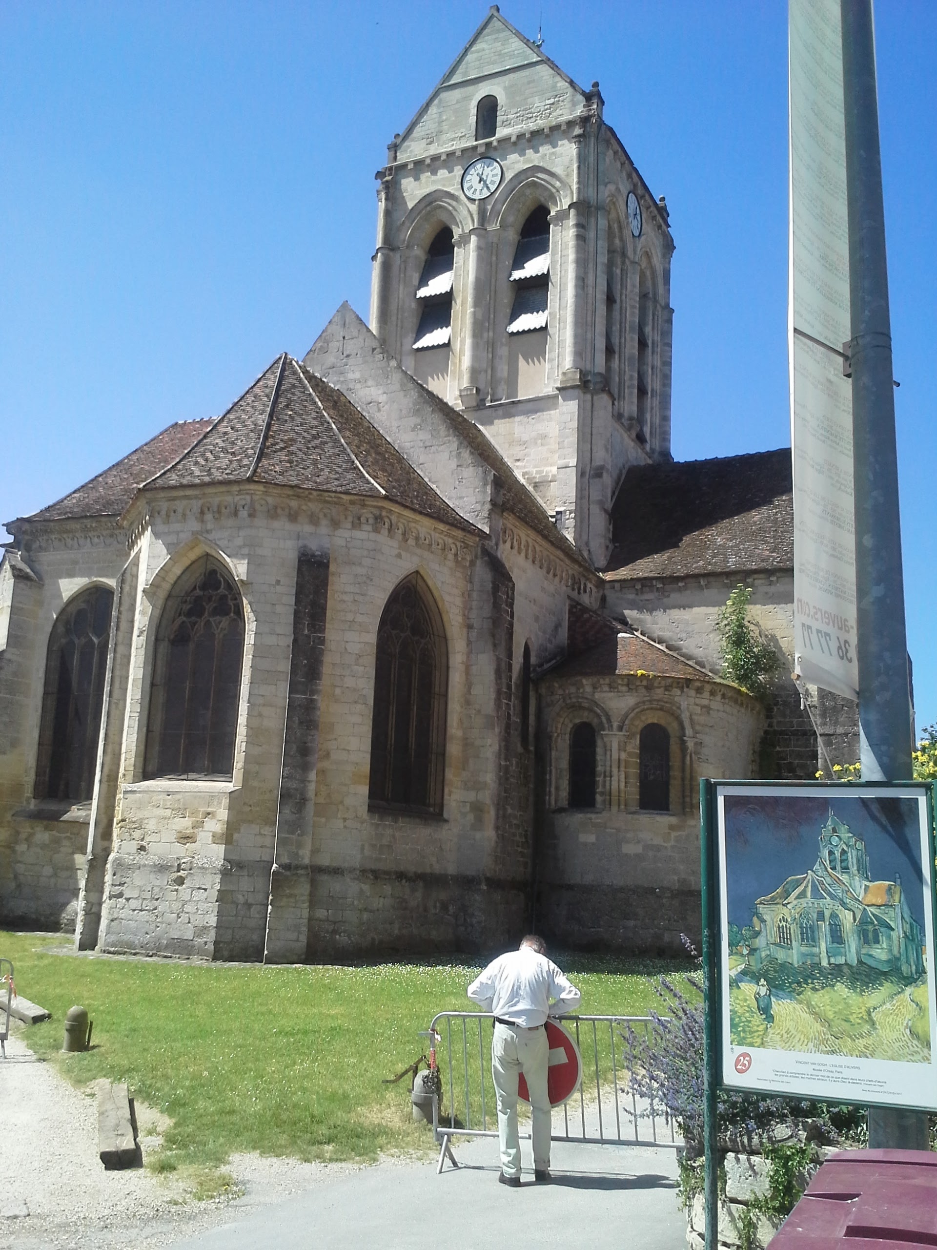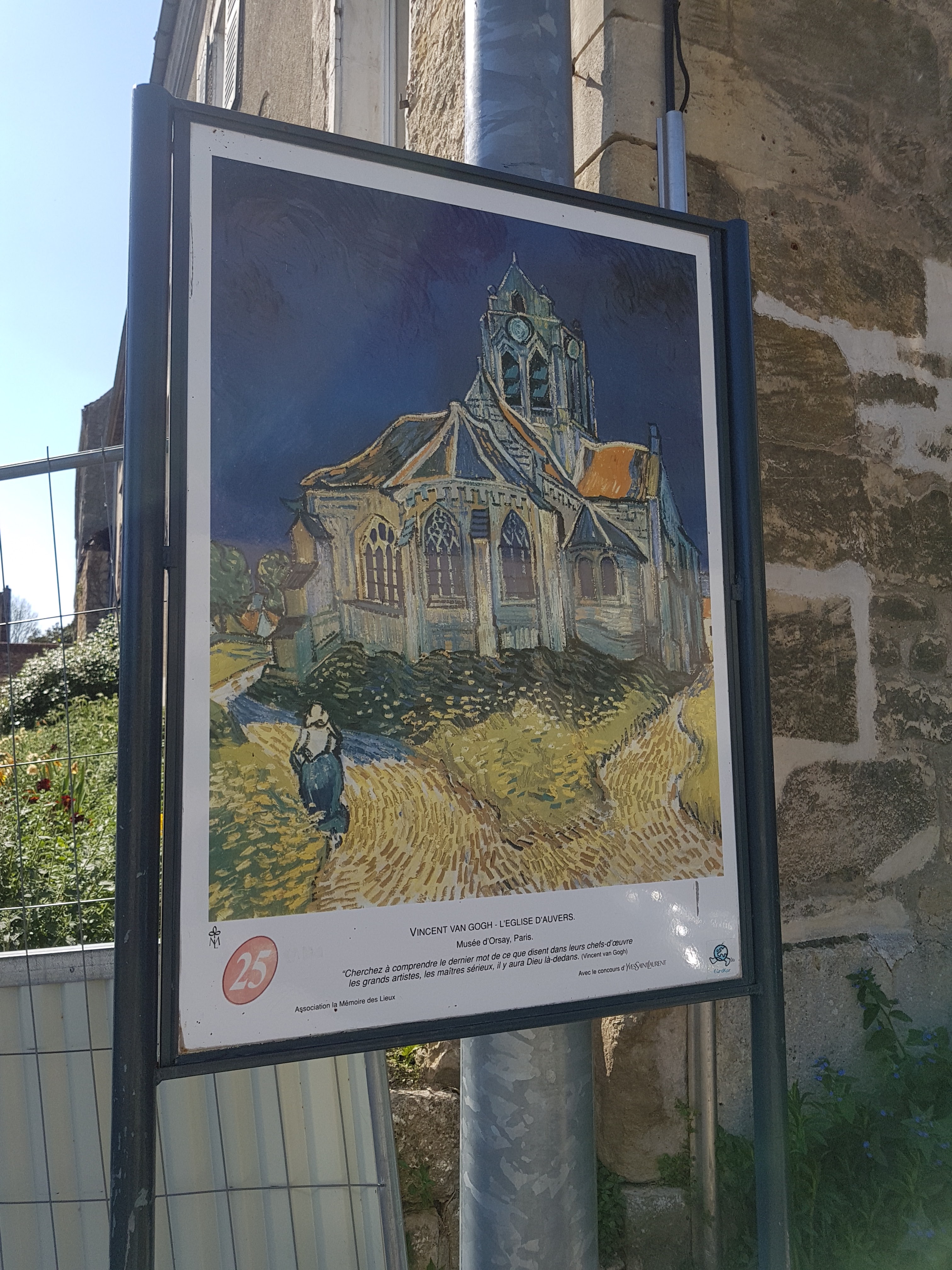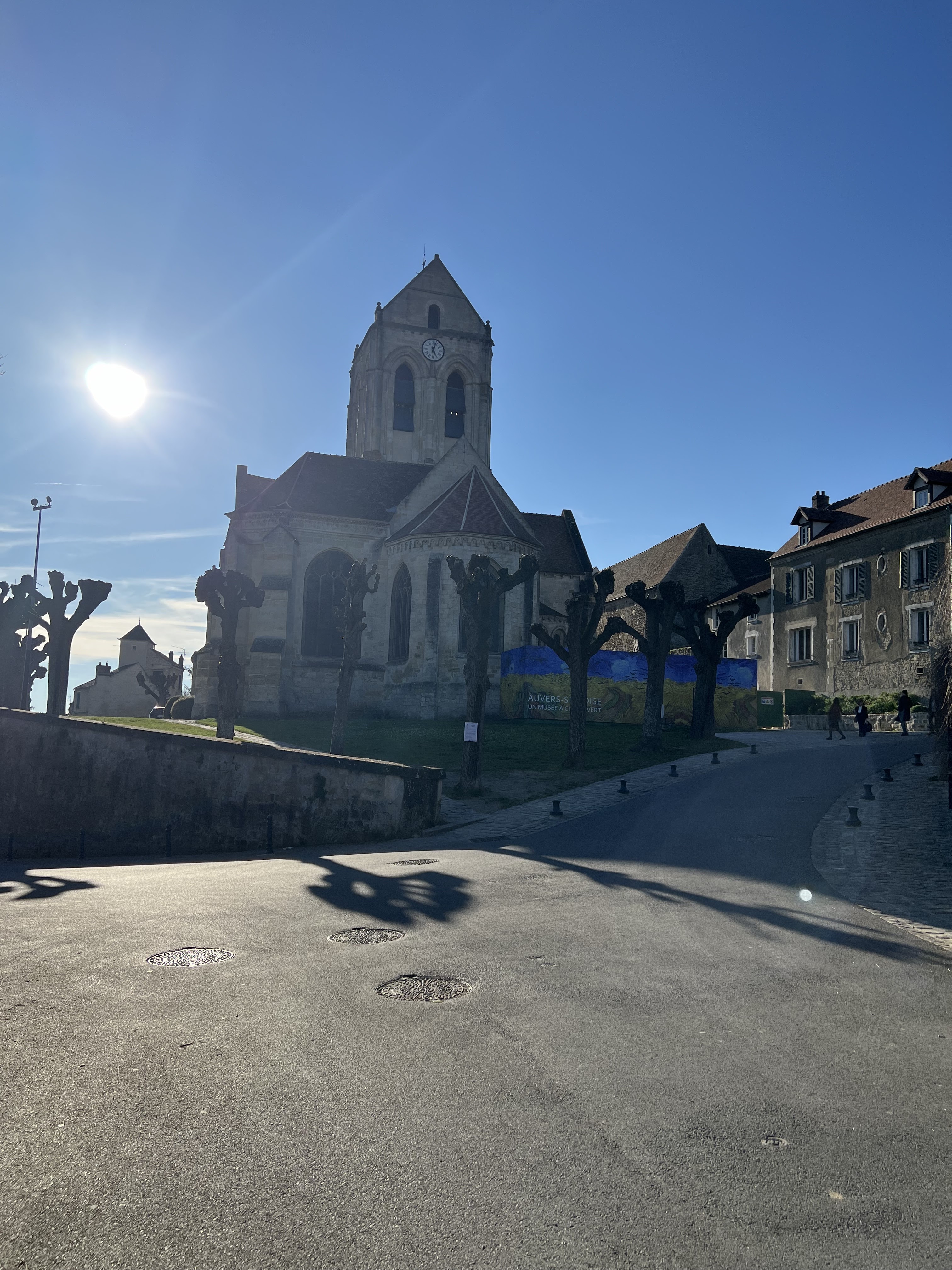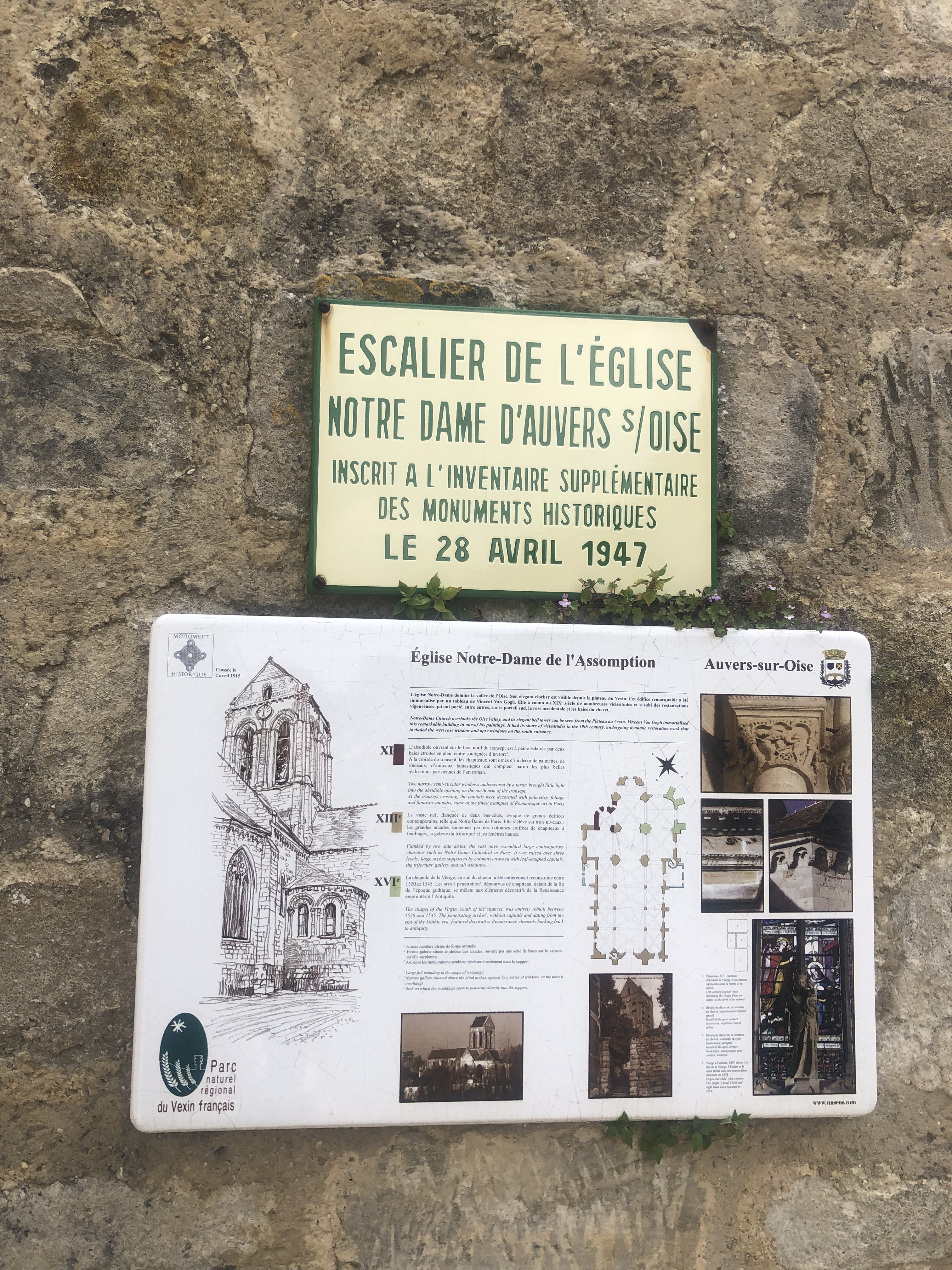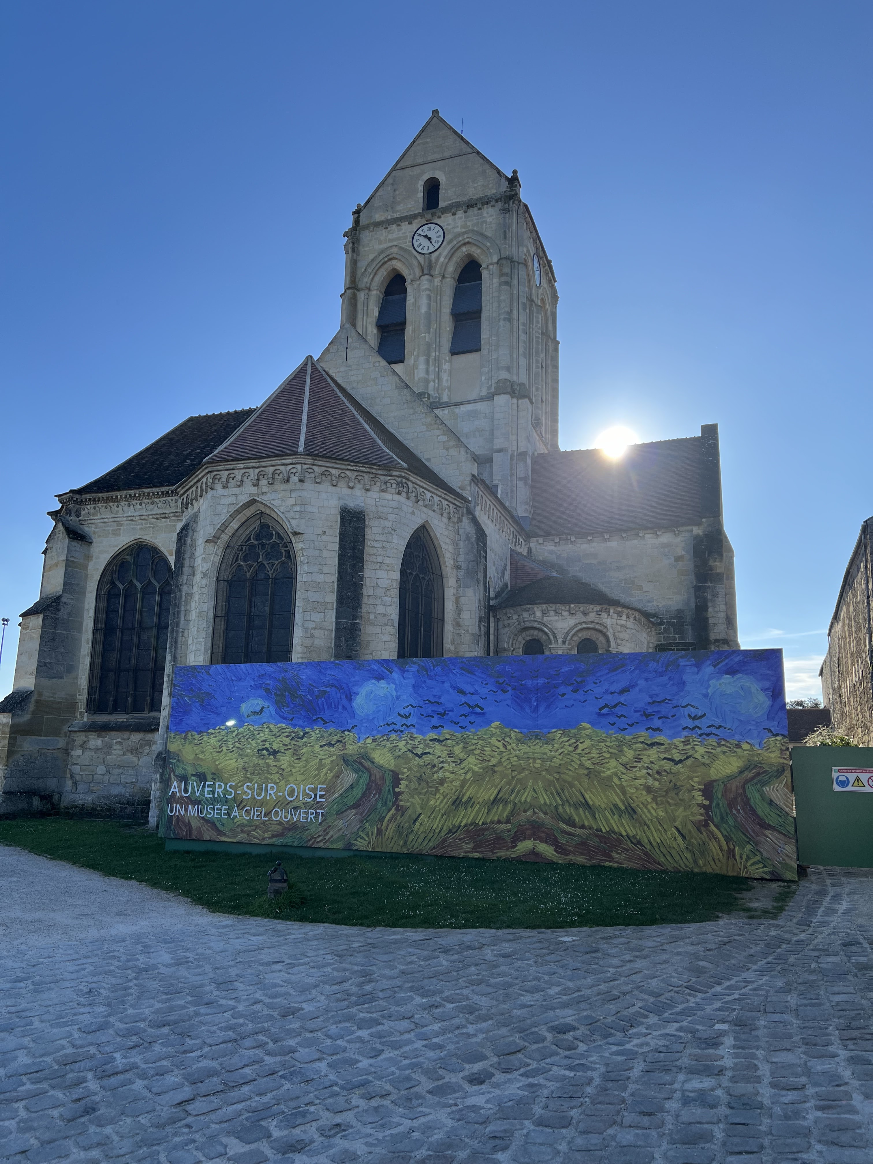 Un contre-jour met en évidence la courbe de la toiture de l'église peinte par Van Gogh. On se prend à chercher l'endroit exact où l'artiste a posé son chevalet. Un panneau sucette donne des informations intéressantes sur tous les lieux à visiter et les spots du peintre. Un des porches d'entrée de l'église représente l'assomption de la vierge dans une mandorle entourée par des anges. Si vous venez l'été, par temps très chaud, vous trouverez des bancs pour vous reposer un peu.