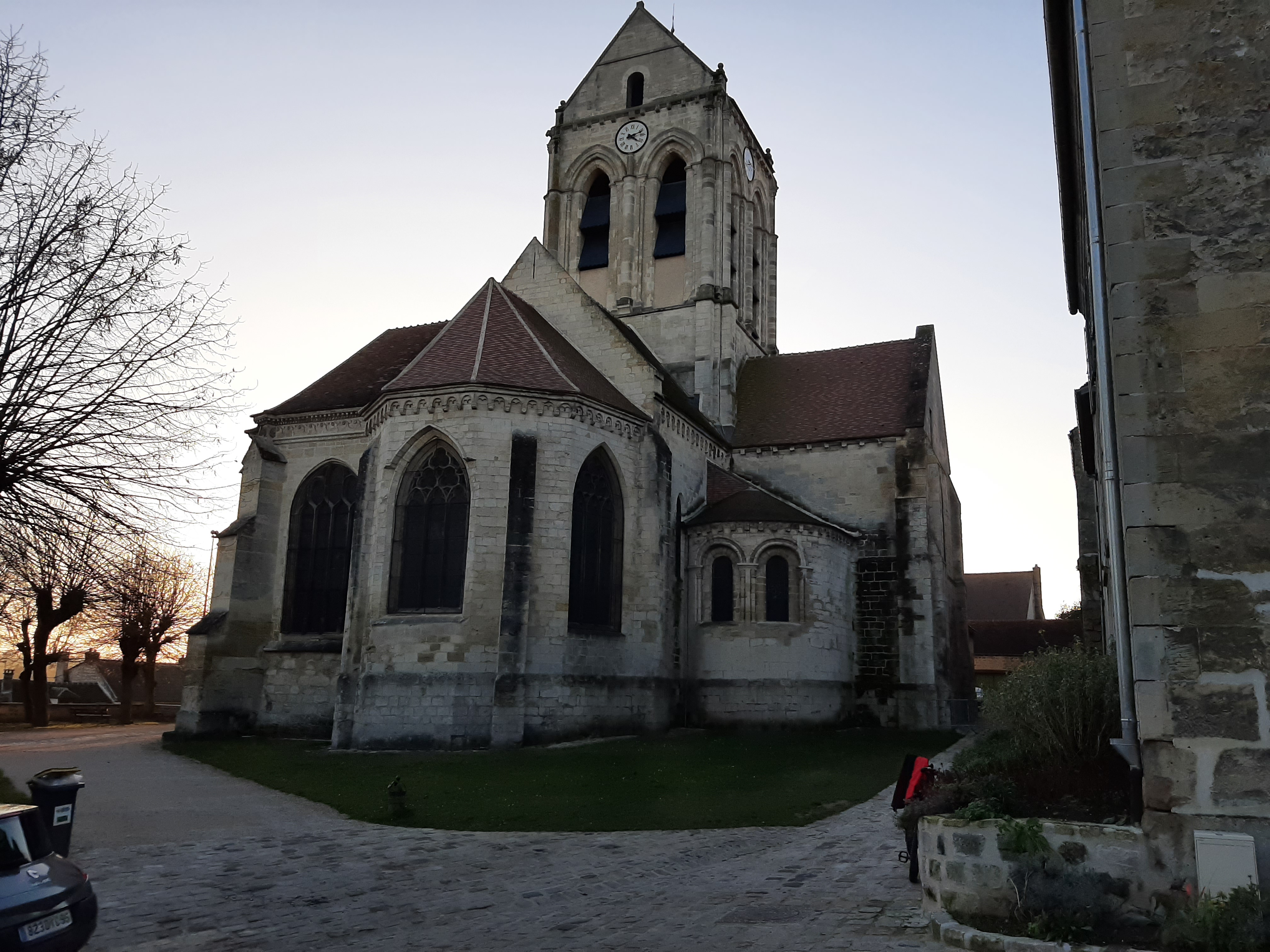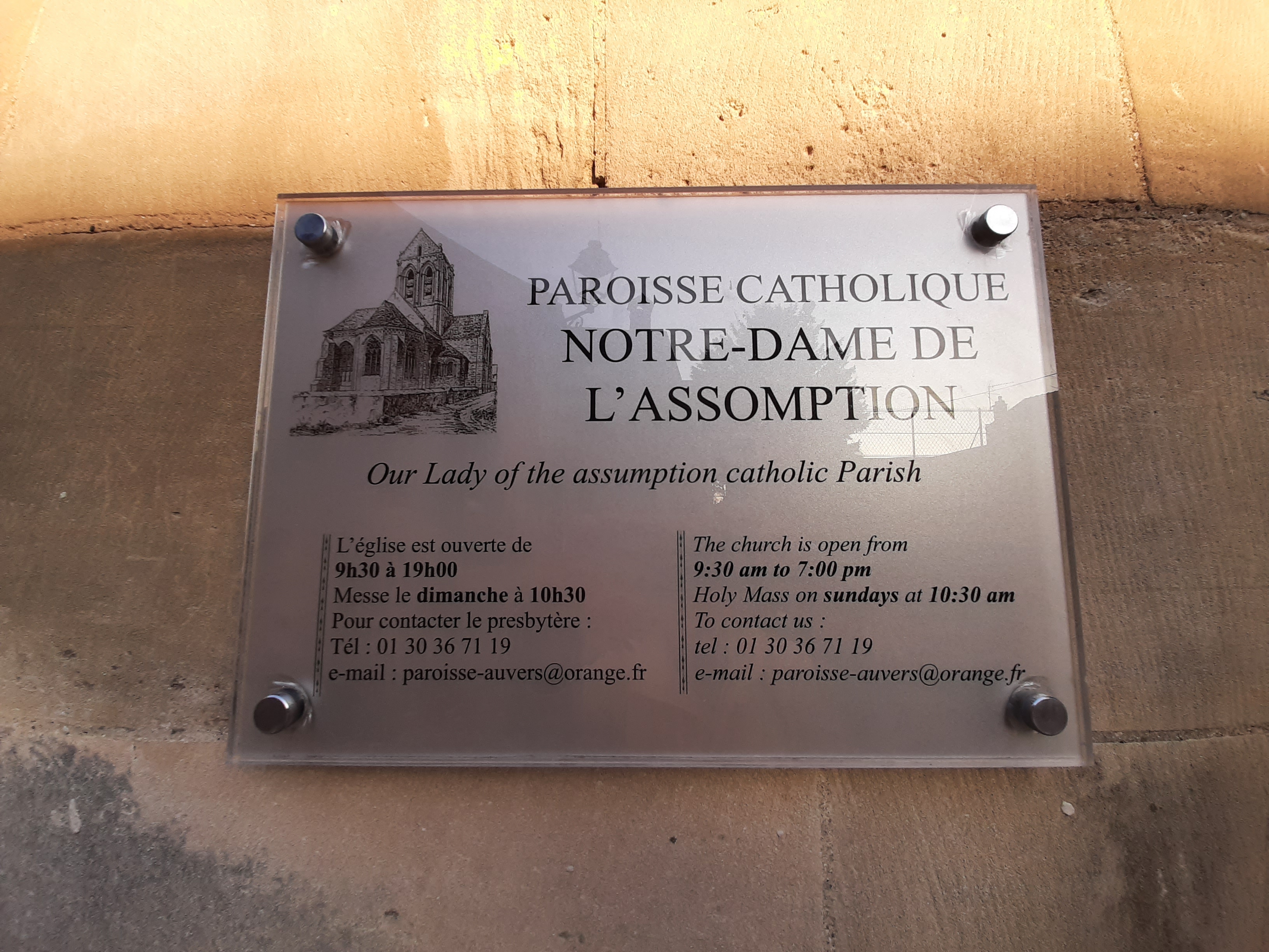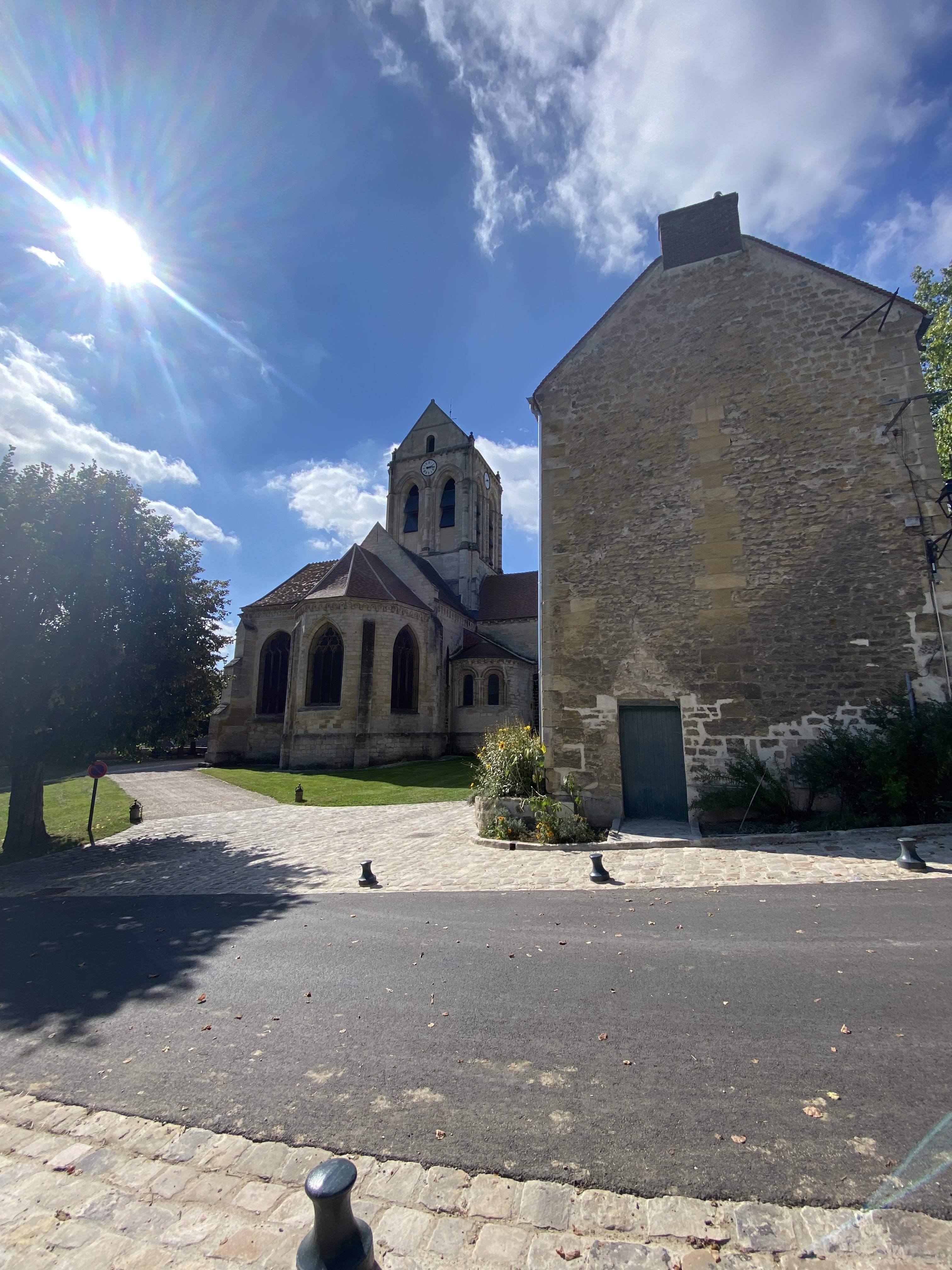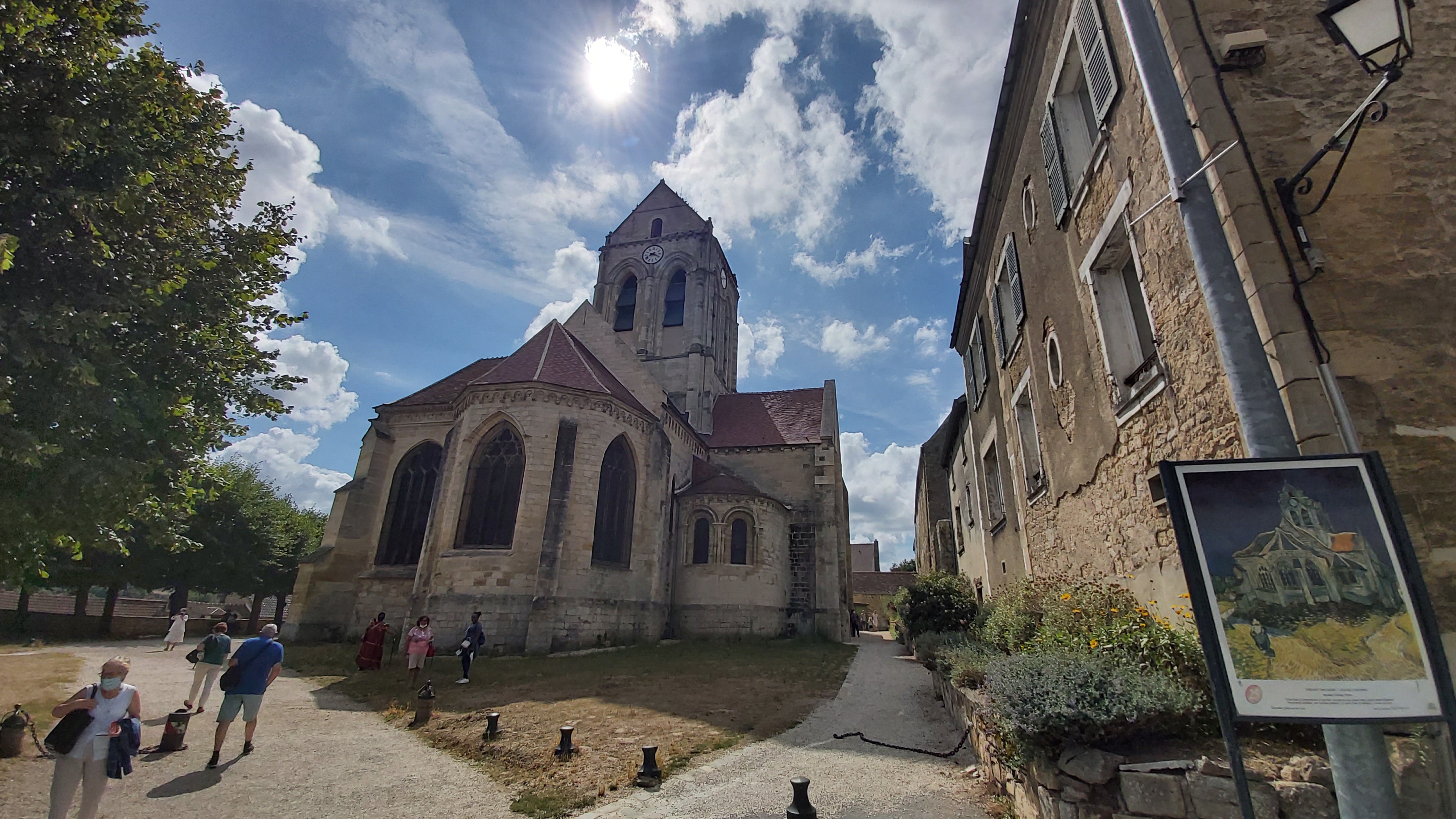 Un contre-jour met en évidence la courbe de la toiture de l'église peinte par Van Gogh. On se prend à chercher l'endroit exact où l'artiste a posé son chevalet. Un panneau sucette donne des informations intéressantes sur tous les lieux à visiter et les spots du peintre. Un des porches d'entrée de l'église représente l'assomption de la vierge dans une mandorle entourée par des anges. Si vous venez l'été, par temps très chaud, vous trouverez des bancs pour vous reposer un peu.