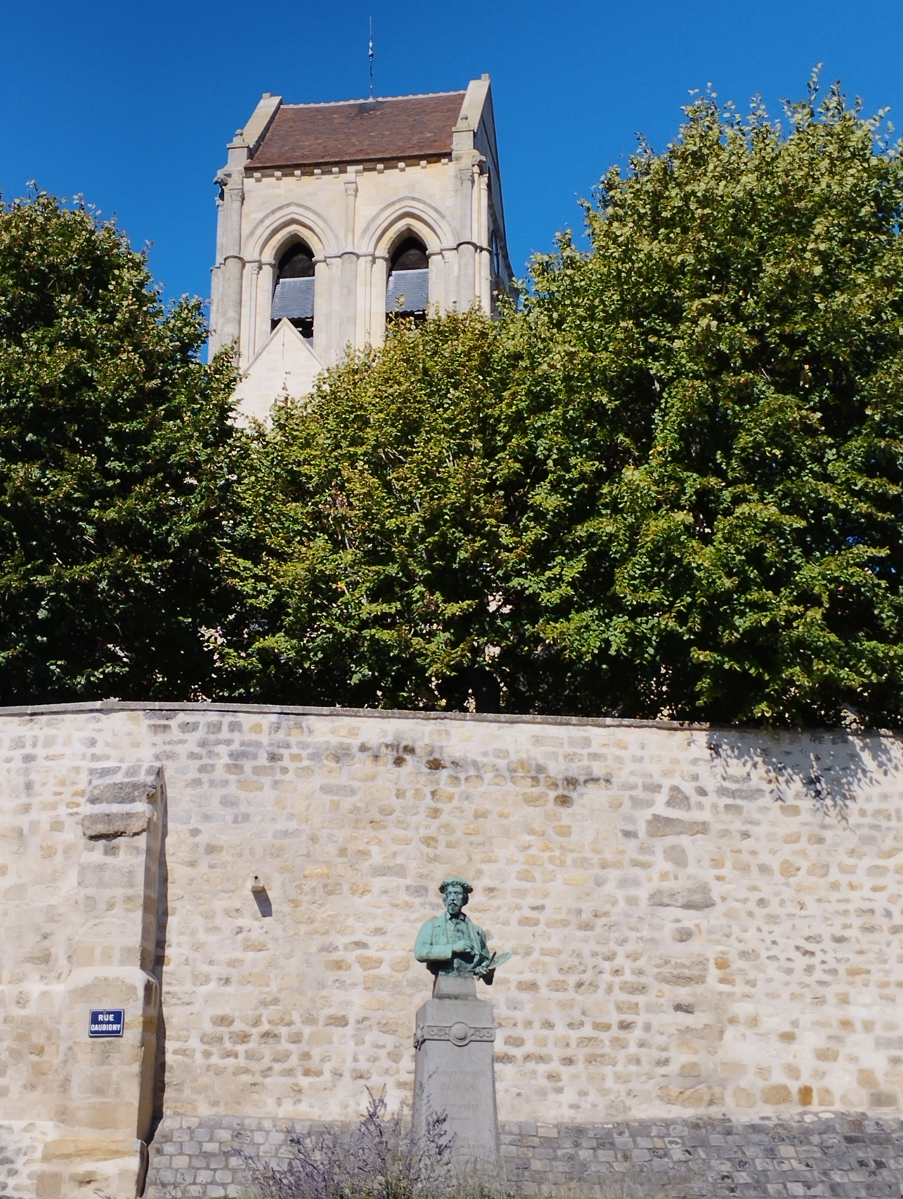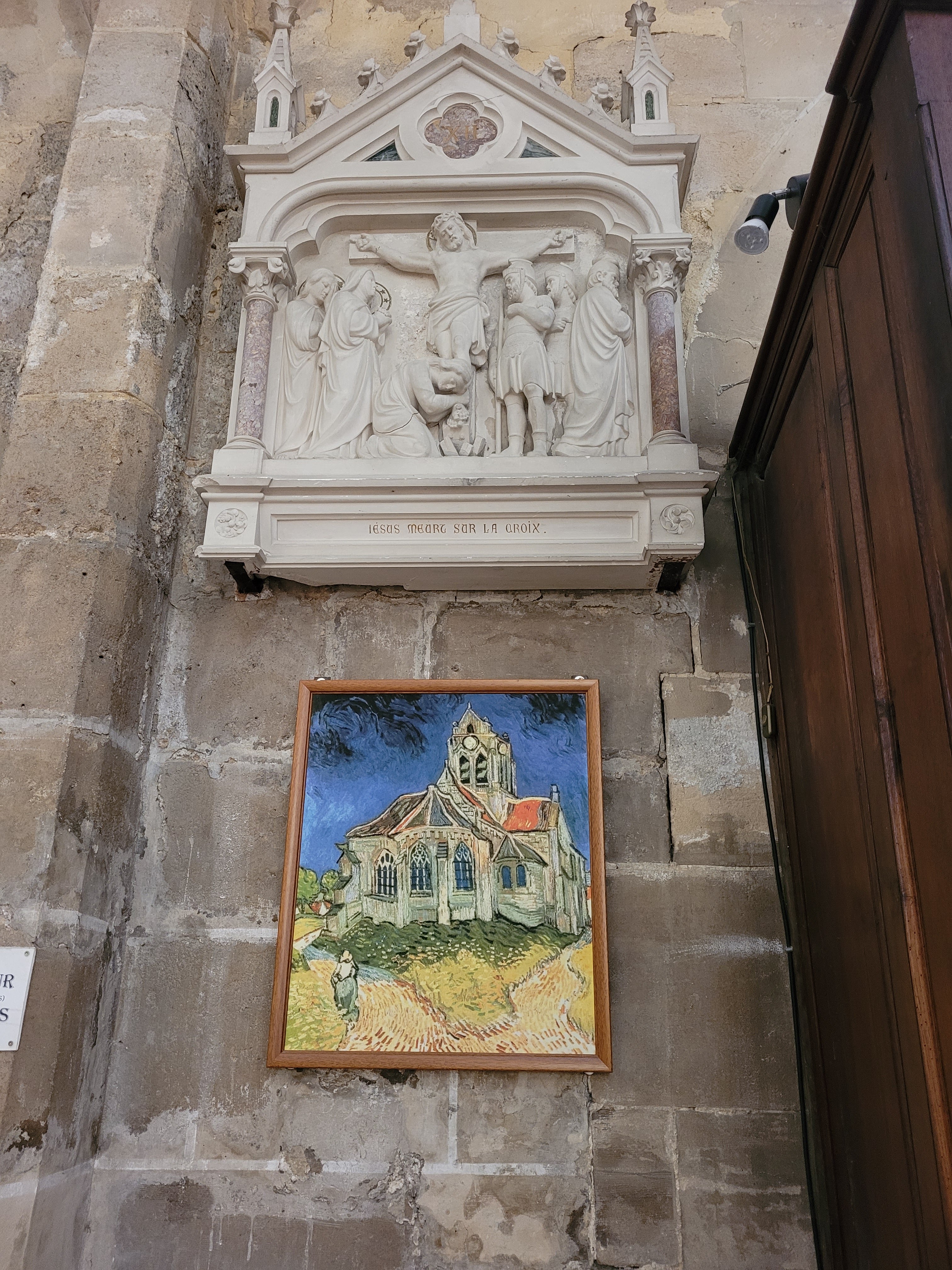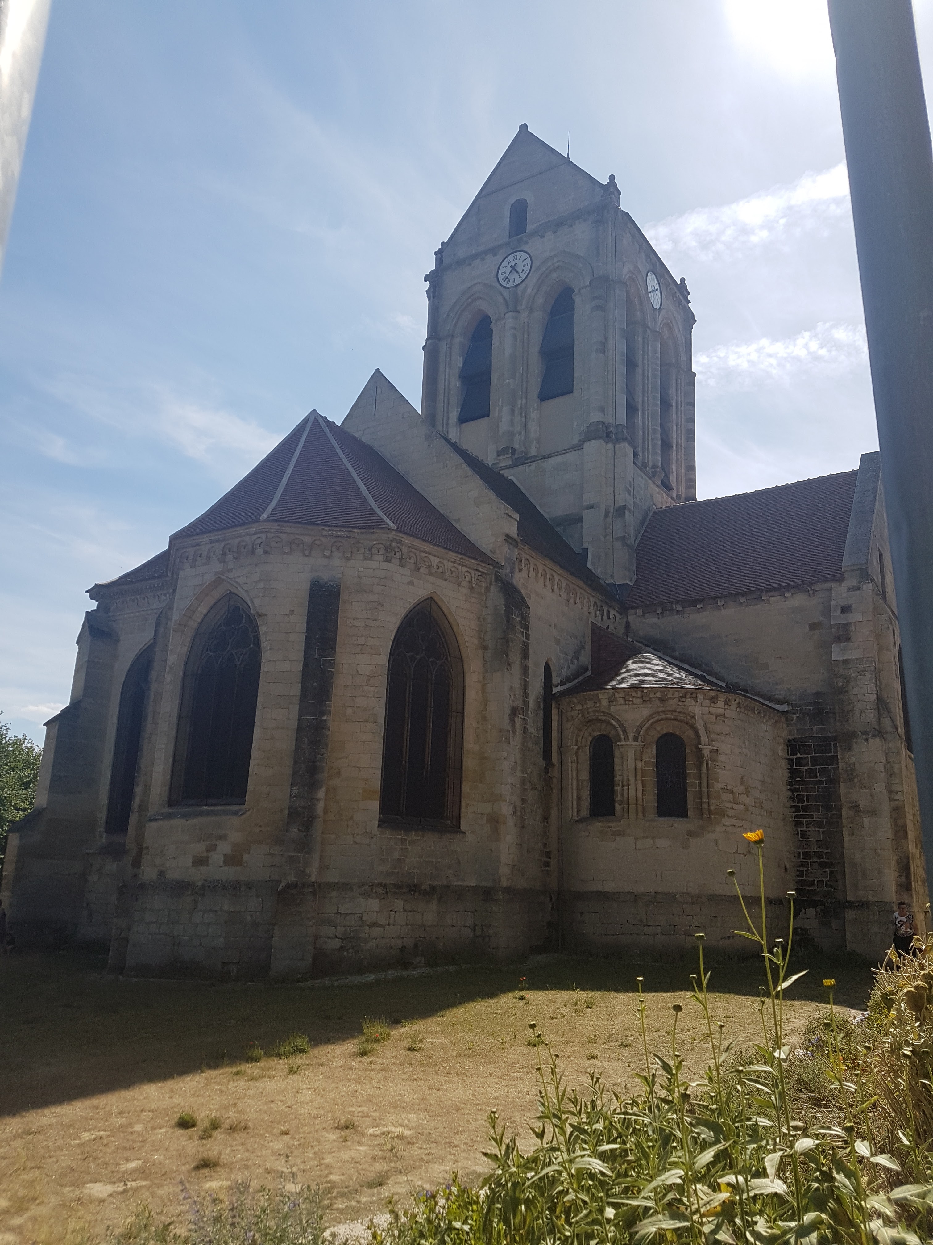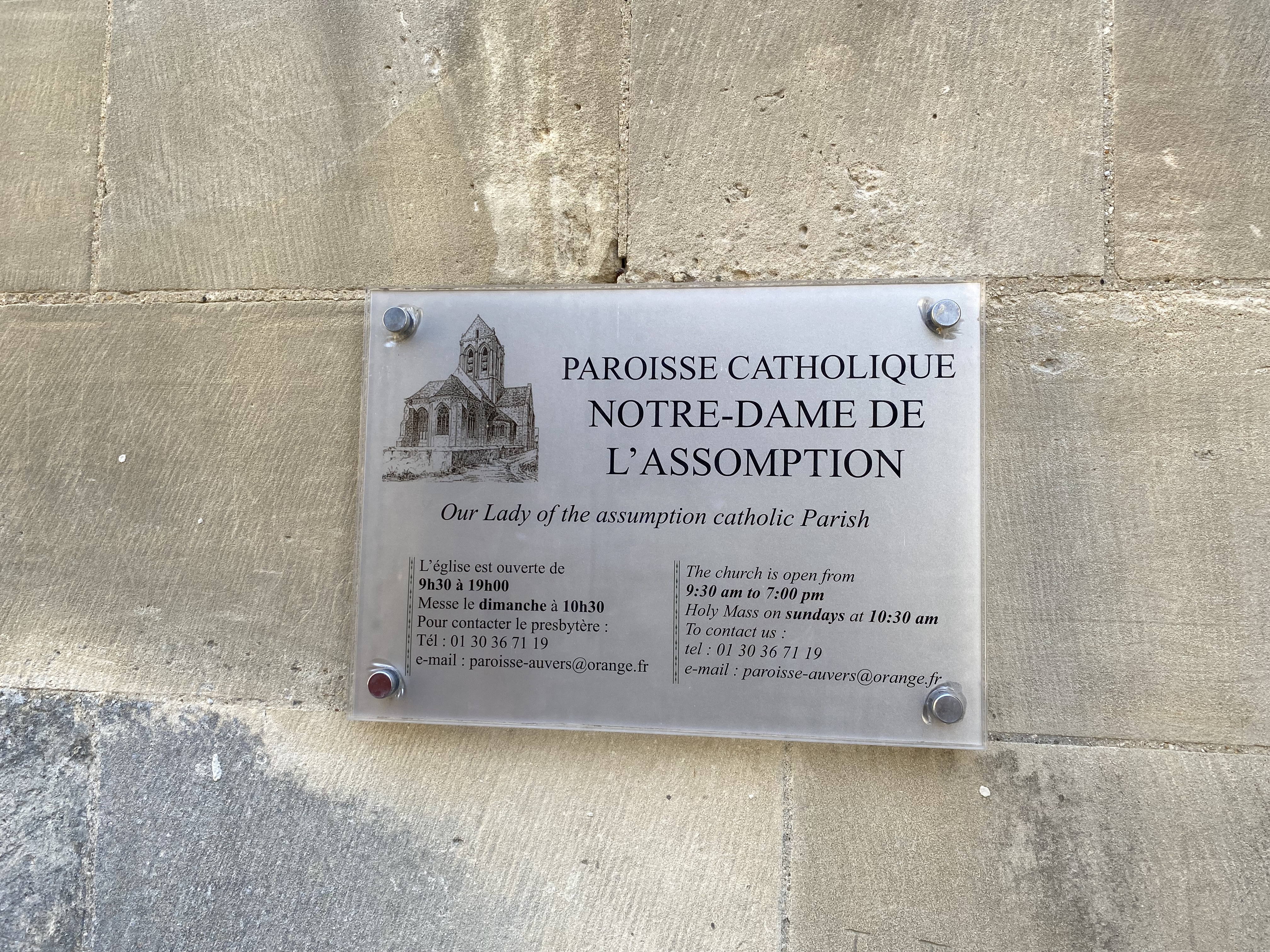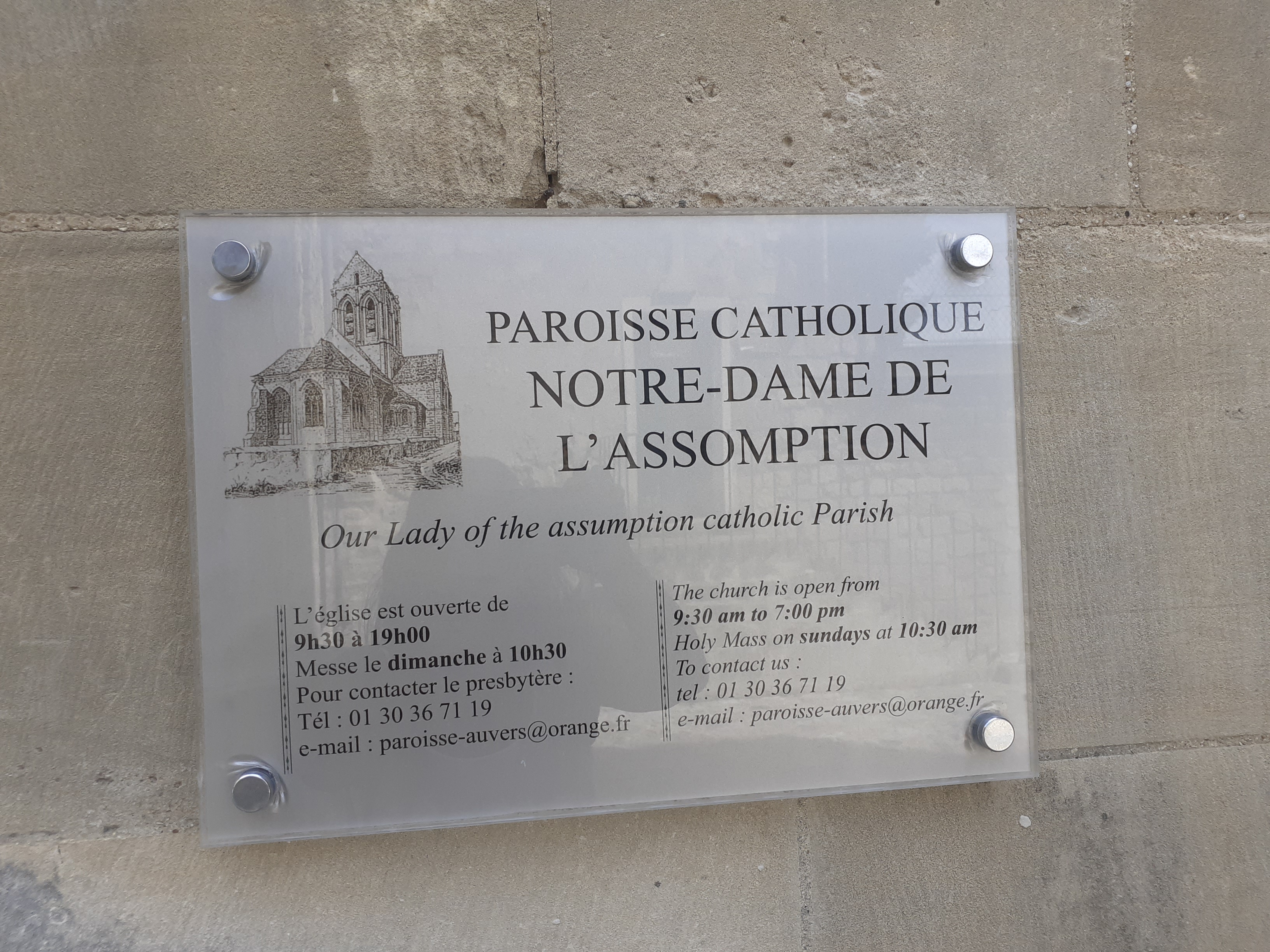 Un contre-jour met en évidence la courbe de la toiture de l'église peinte par Van Gogh. On se prend à chercher l'endroit exact où l'artiste a posé son chevalet. Un panneau sucette donne des informations intéressantes sur tous les lieux à visiter et les spots du peintre. Un des porches d'entrée de l'église représente l'assomption de la vierge dans une mandorle entourée par des anges. Si vous venez l'été, par temps très chaud, vous trouverez des bancs pour vous reposer un peu.