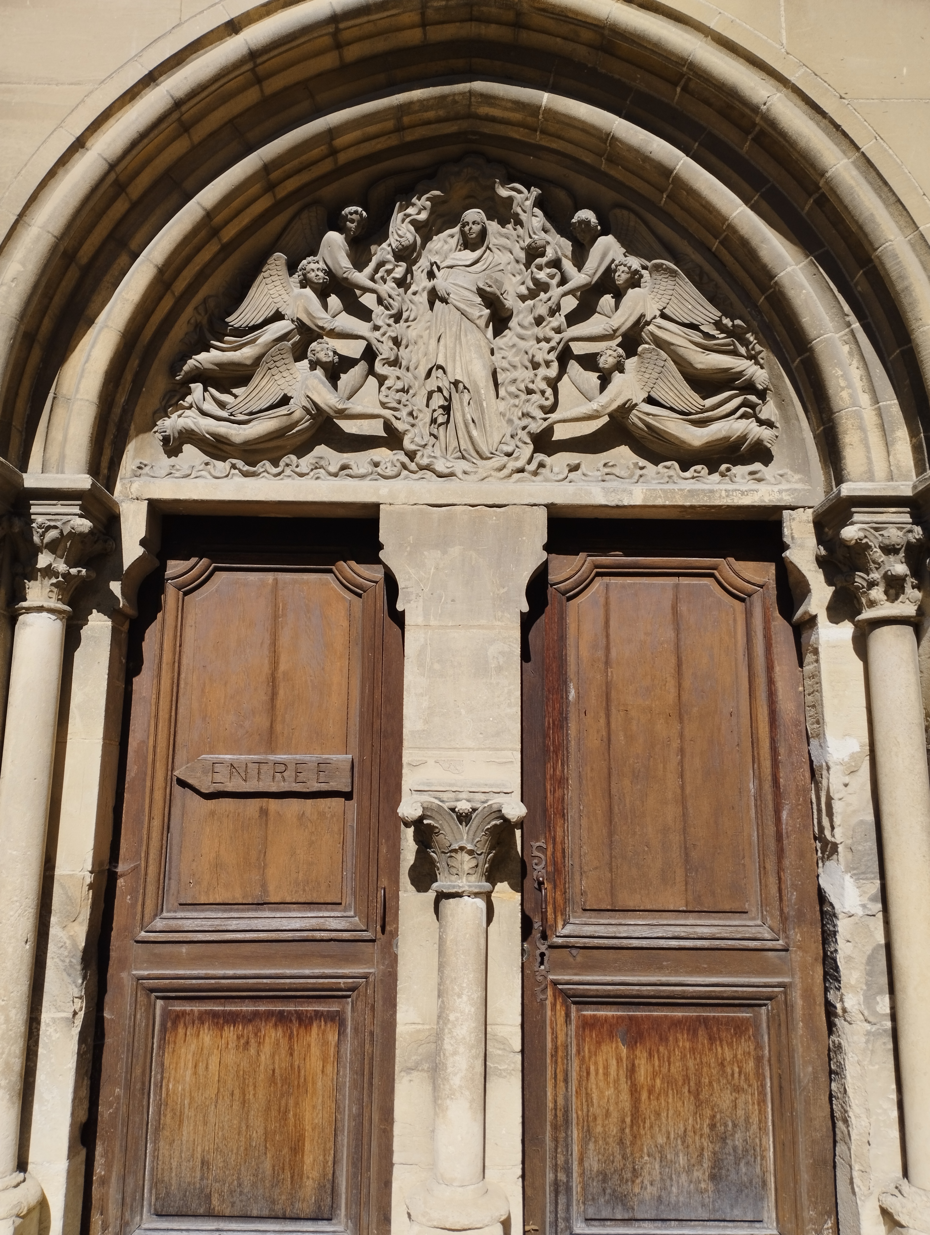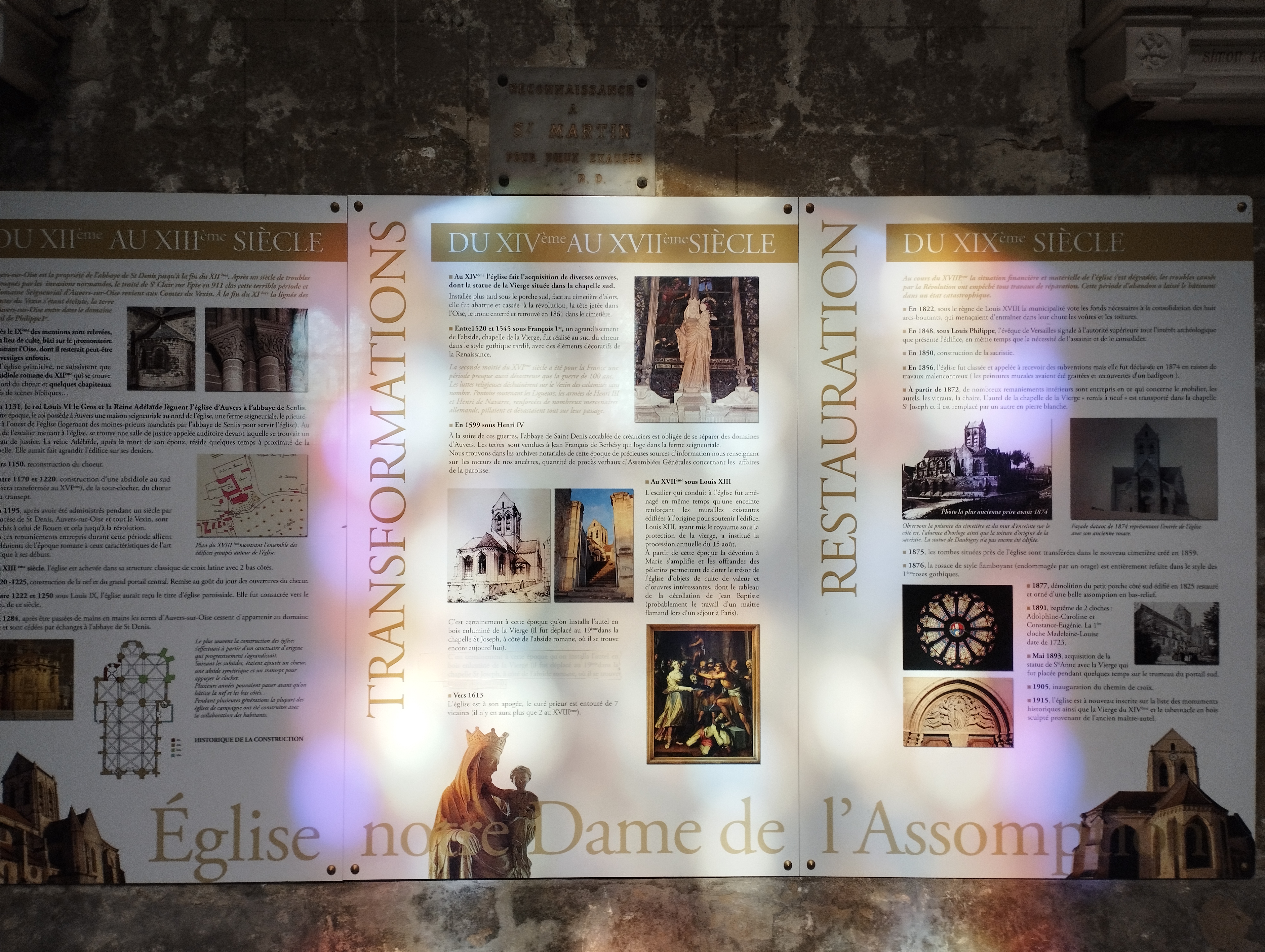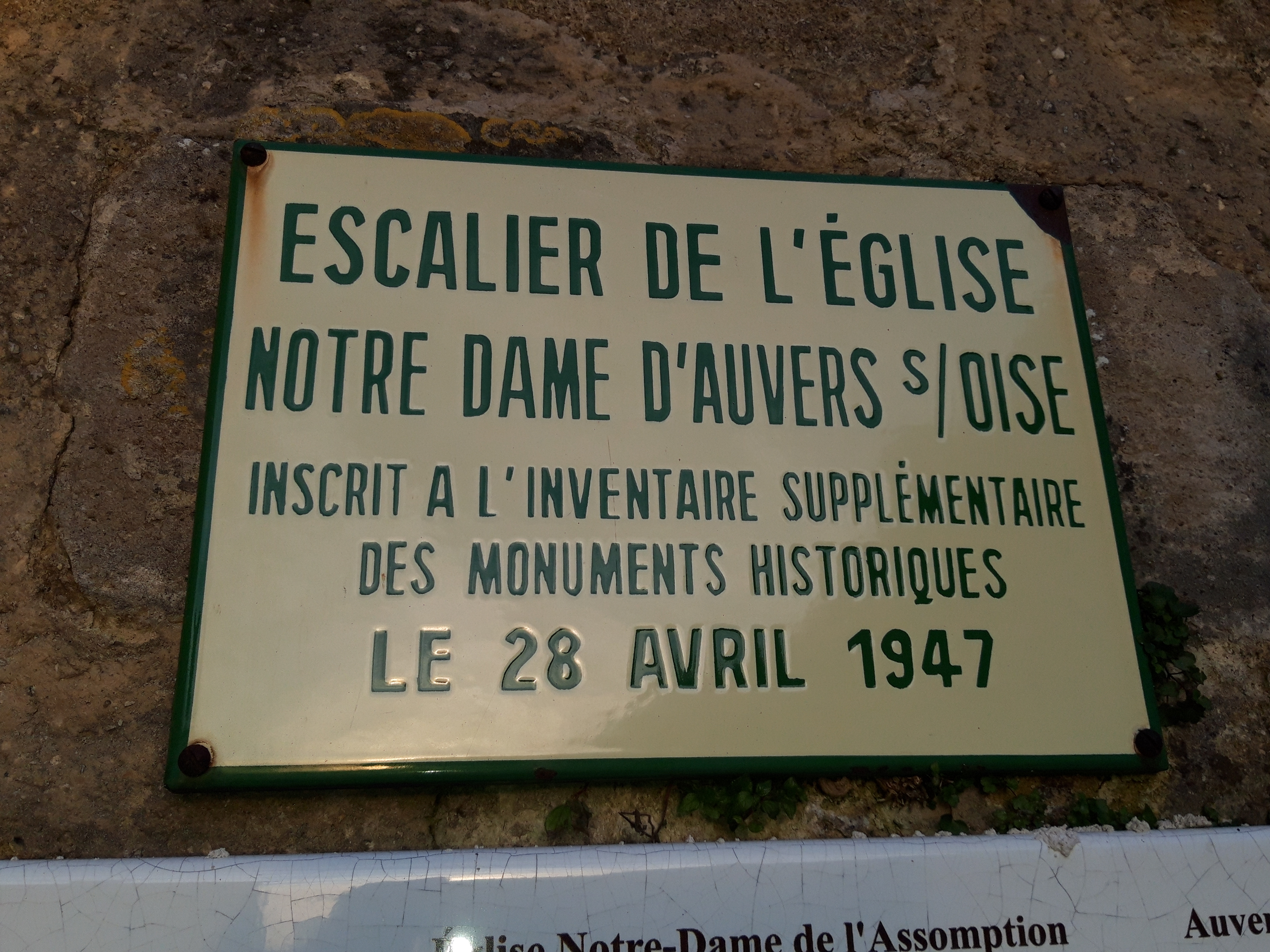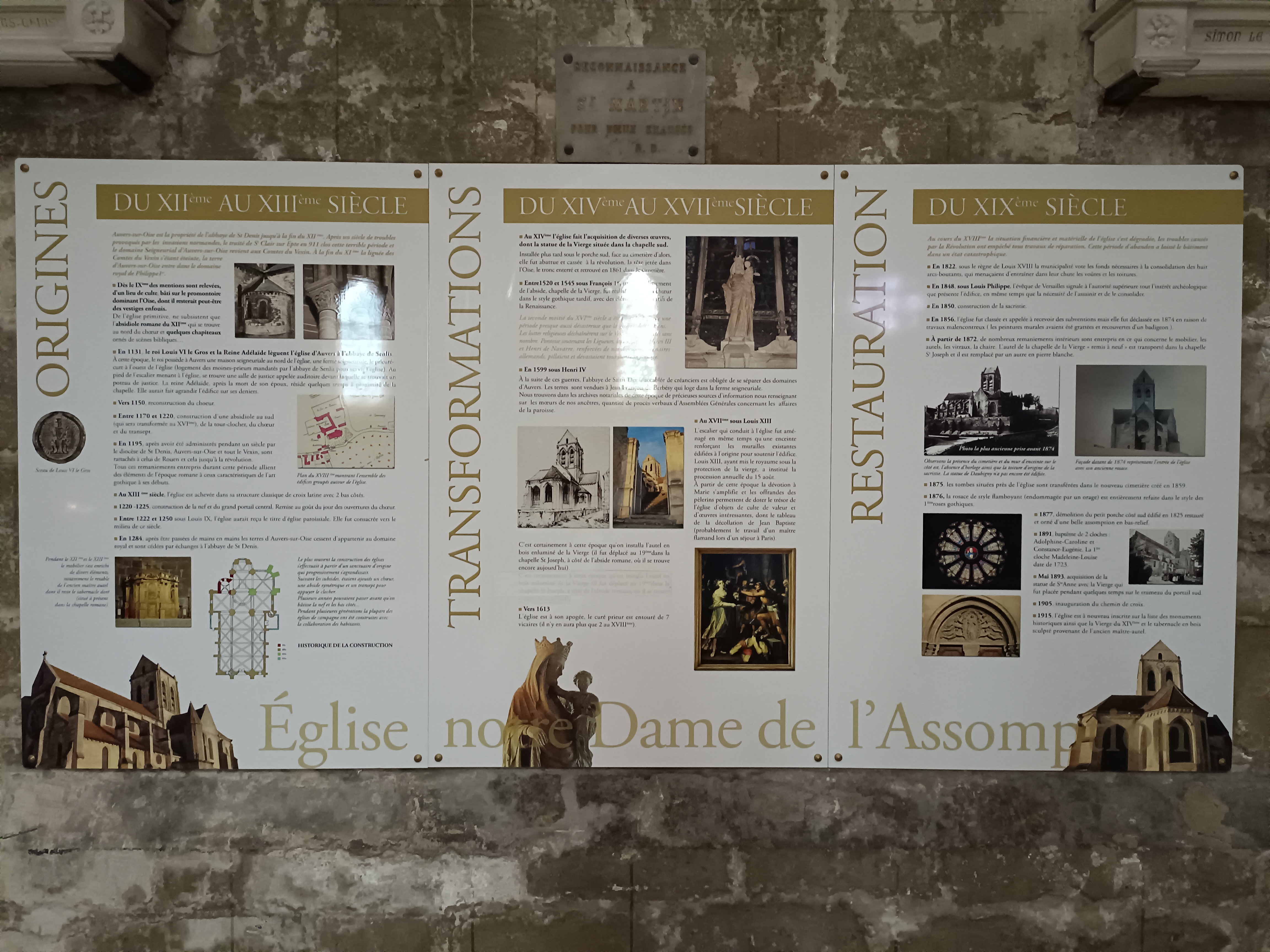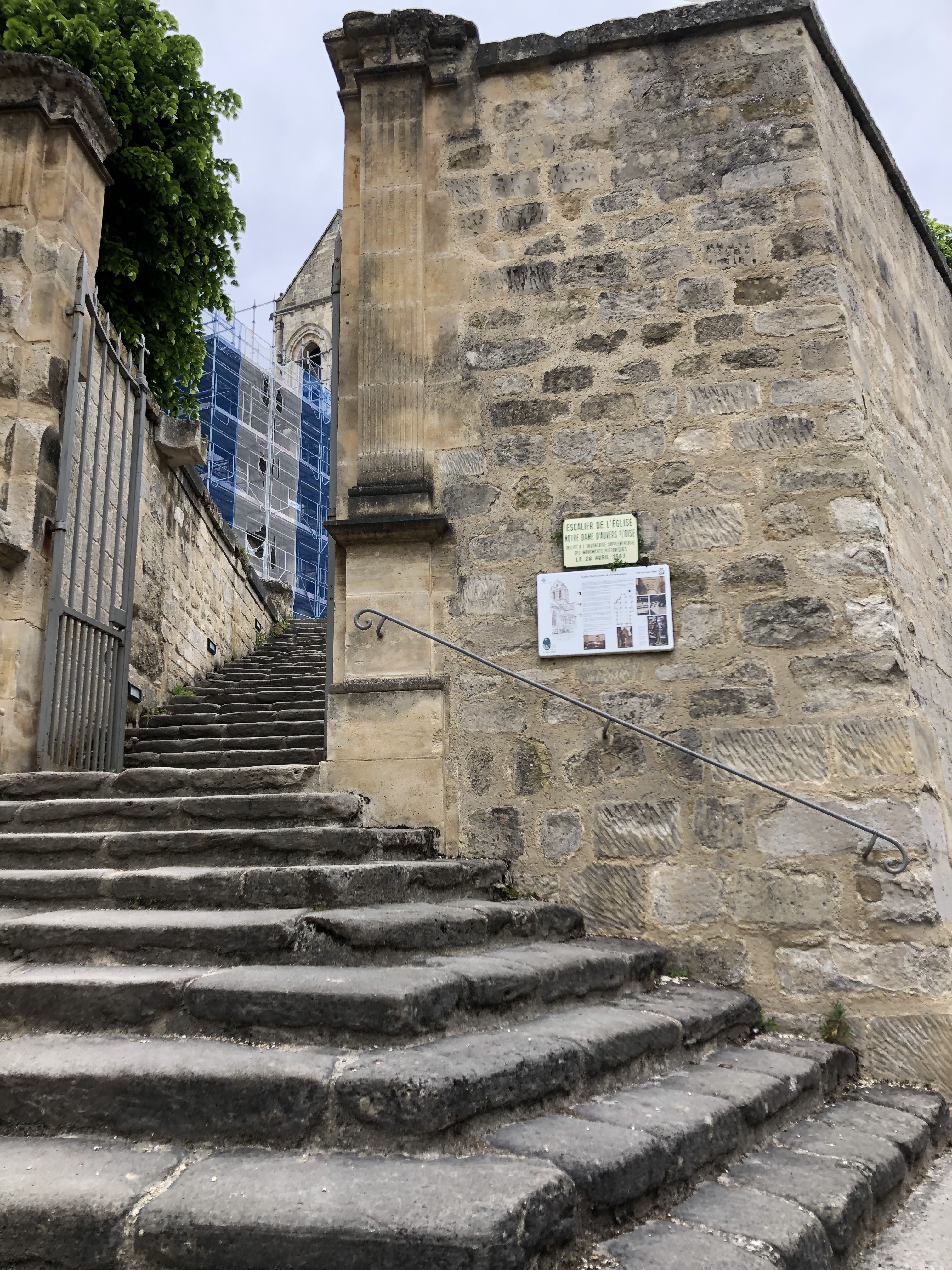 Un contre-jour met en évidence la courbe de la toiture de l'église peinte par Van Gogh. On se prend à chercher l'endroit exact où l'artiste a posé son chevalet. Un panneau sucette donne des informations intéressantes sur tous les lieux à visiter et les spots du peintre. Un des porches d'entrée de l'église représente l'assomption de la vierge dans une mandorle entourée par des anges. Si vous venez l'été, par temps très chaud, vous trouverez des bancs pour vous reposer un peu.