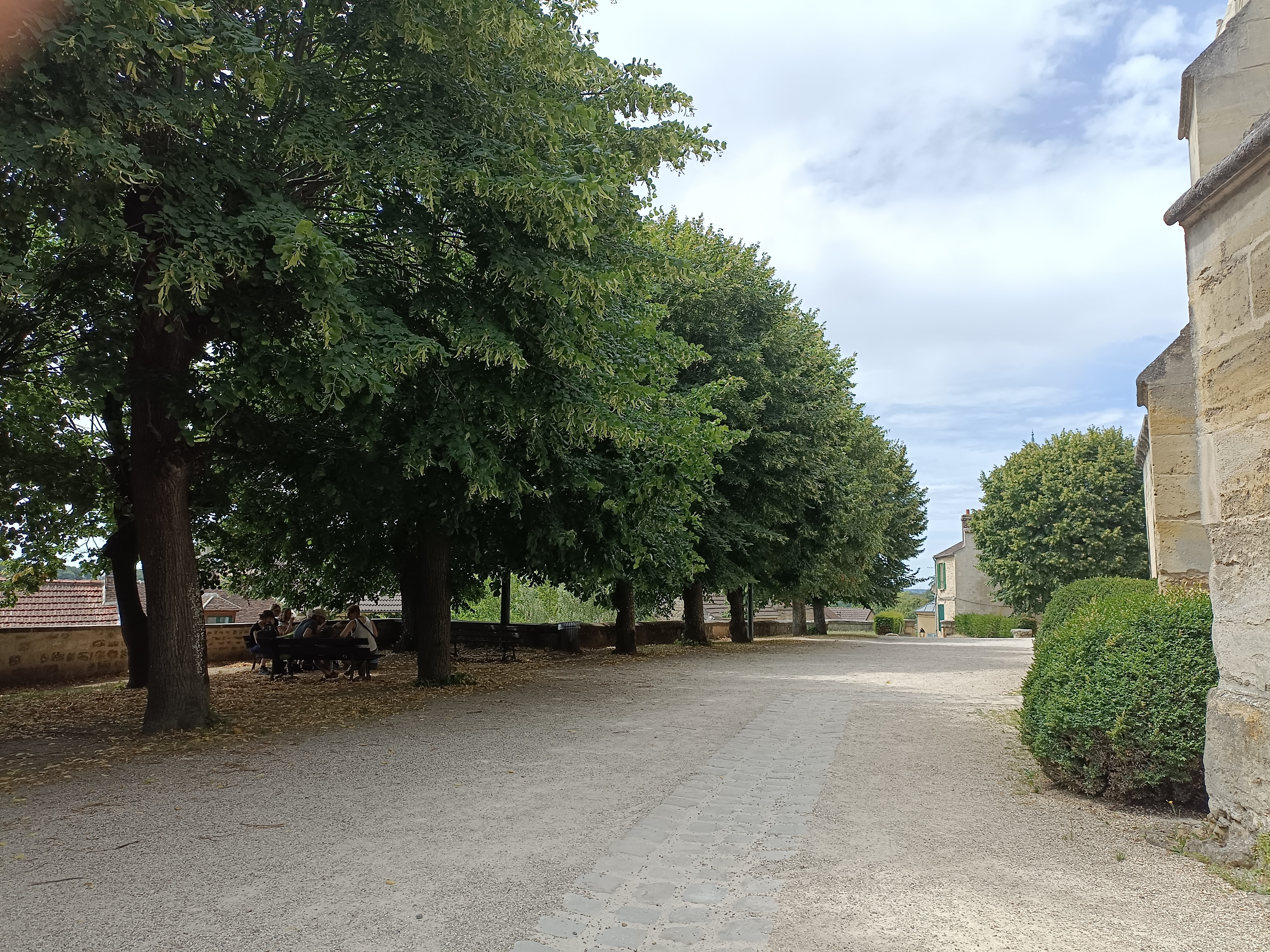 On arrive par le devant de l'église dite de Van Gogh. Pour voir la correspondance avec la peinture, il faut aller sur l'arrière. Très belle église avec quelques peintures, de beaux vitraux et un orgue. On peut s'installer sur les bancs à côté pour pique-niquer à l'ombre. Et d'autres face à l'arrière pour admirer la vue au soleil. De là vous pourrez prendre la direction du cimetière.