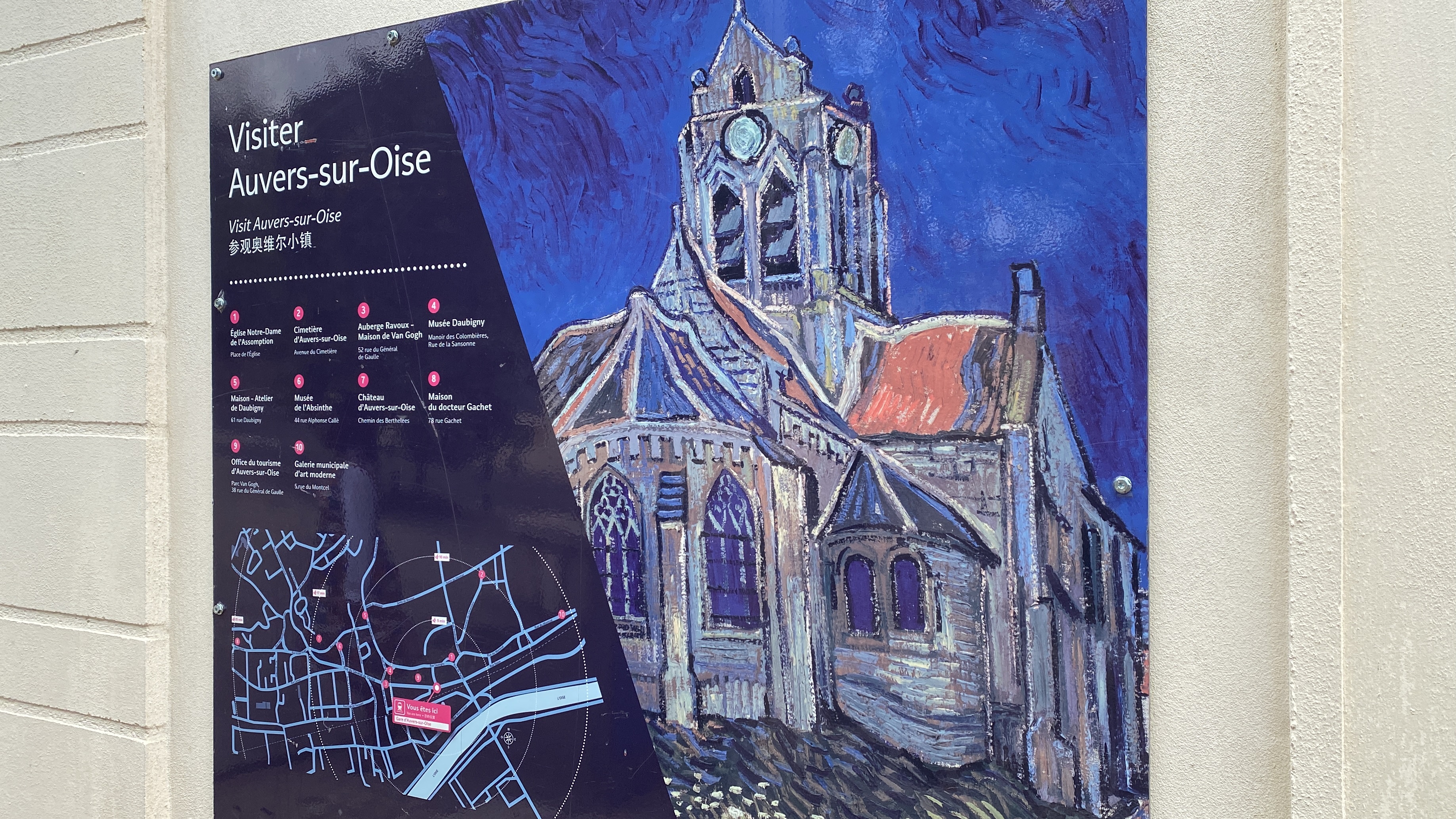 France🇫🇷Auvers sur Oise est une petite ville de l'Oise située au nord-ouest de Paris. C'est une petite ville belle, simple et tranquille. La raison pour laquelle cette ville est célèbre est qu'elle est la vie du célèbre peintre Van Gogh. La dernière résidence de Van Gogh n'y fut que 70 jours (20/05/1890 – 29/07/1890), mais il peignit près de 80 tableaux au cours de ces 70 jours. La ville d'Auvers est située à la périphérie de Paris, avec des transports pratiques et, couplée à la renommée de Van Gogh, elle attire souvent de nombreux touristes venus en pèlerinage. J'ai vu l'hôtel de ville d'Auvers. Comparé aux hôtels de ville de nombreuses villes françaises, cet hôtel de ville a une apparence relativement simple et sobre. L'apparence de l'hôtel de ville d'Auvers reste presque exactement la même que dans les peintures de Van Gogh, sans grand changement. L'église d'Auvers est célèbre pour les peintures de Van Gogh. Il y a un tableau de Van Gogh à côté de l'église, afin que chacun puisse admirer l'église elle-même et les peintures de Van Gogh à titre de comparaison.