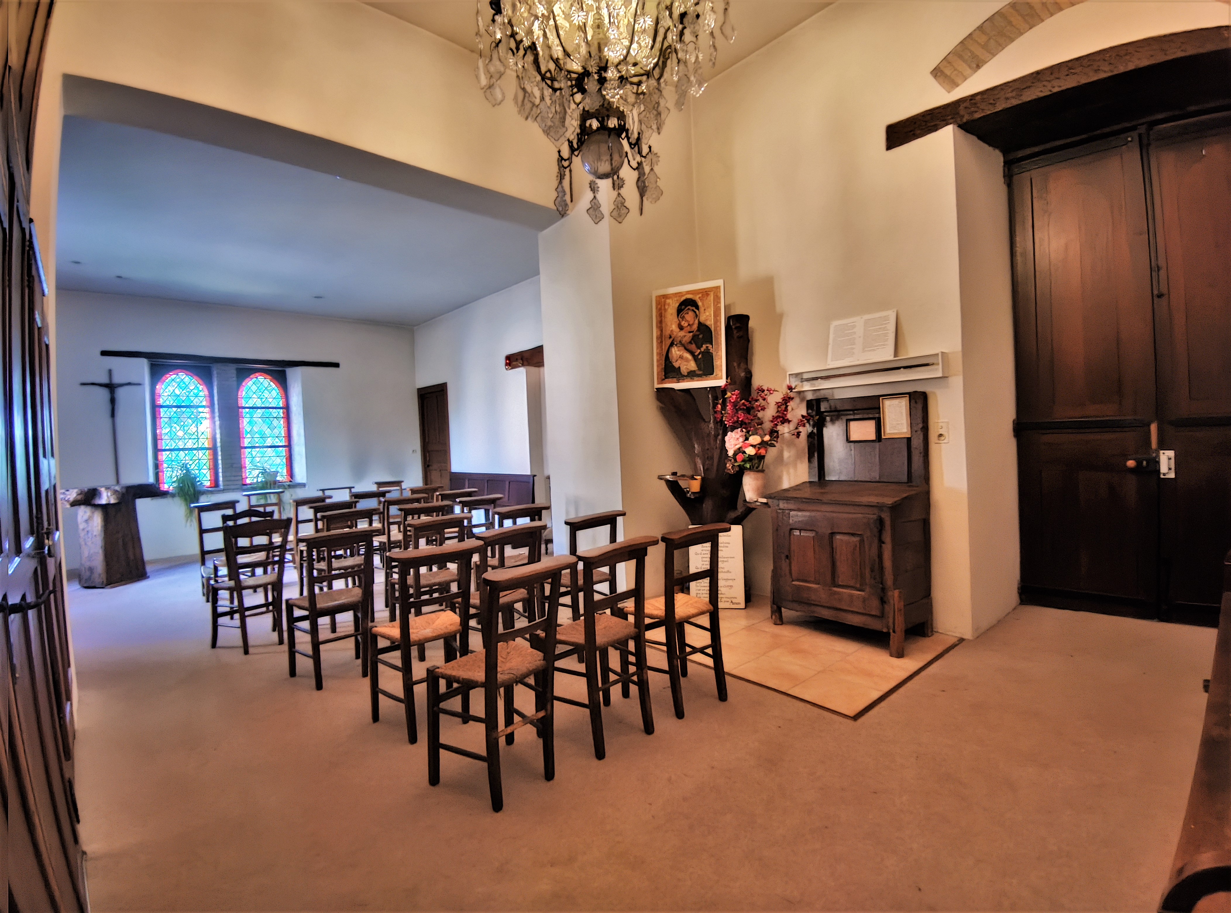 Heureusement, la petite chapelle reste ouverte, c'est un lieu accueillant, parfait pour le recueillement. Voila une église du 19ème siècle peu engageante. Fermée, le portail est encadré d'échafaudages supportant une sorte de parapluie retourné chargé de récupérer les débris de pierre tombant des clochetons. Voilà déjà 6 ans, une estimation de 600 000€ avait été faite pour une restauration (Ouest-France, le 23/04/2022). Combien aujourd'hui ??? Résoudre le problème des financements est complexe. Heureusement, la petite chapelle reste ouverte, c'est un lieu accueillant, parfait pour le recueillement.