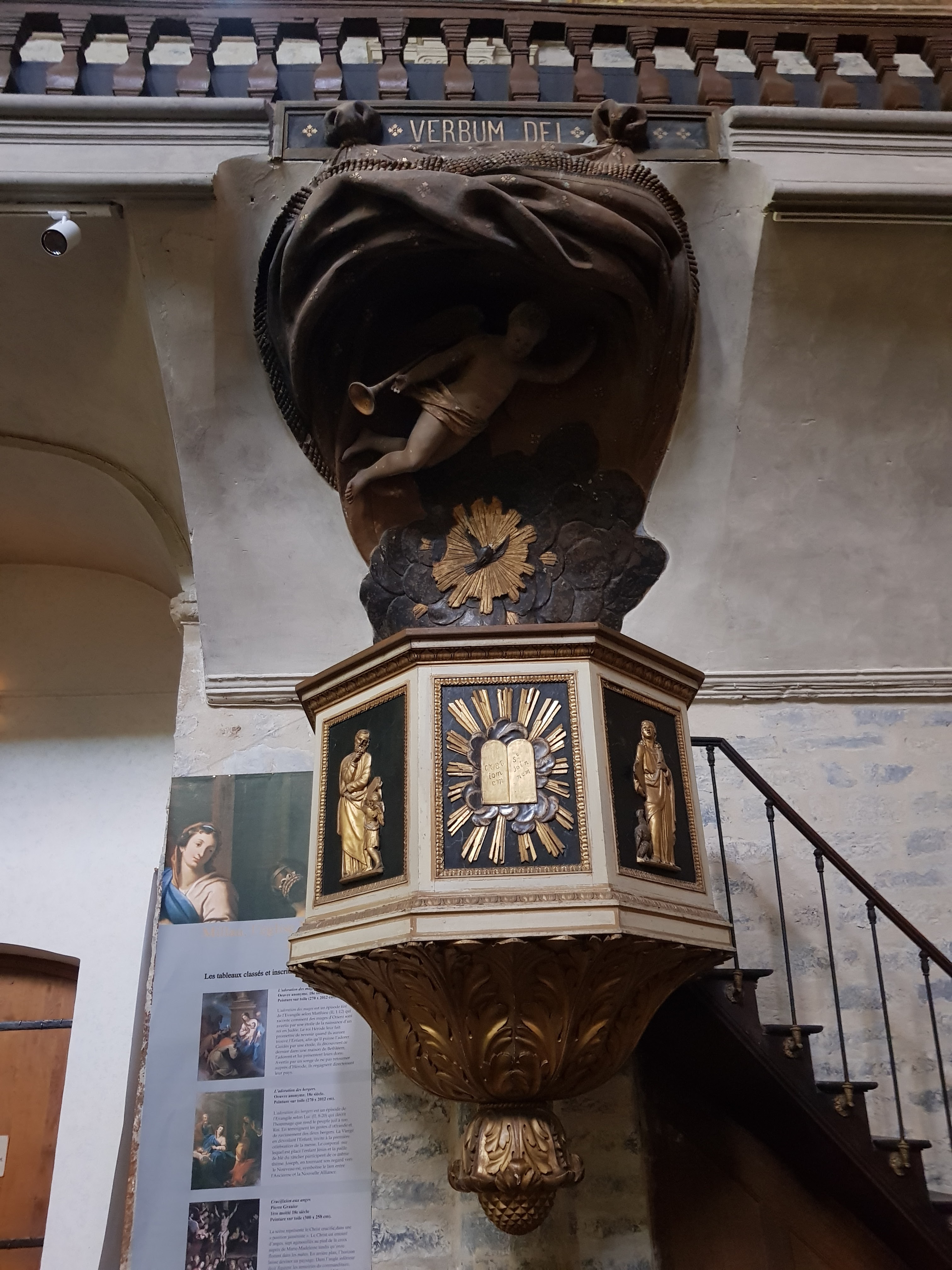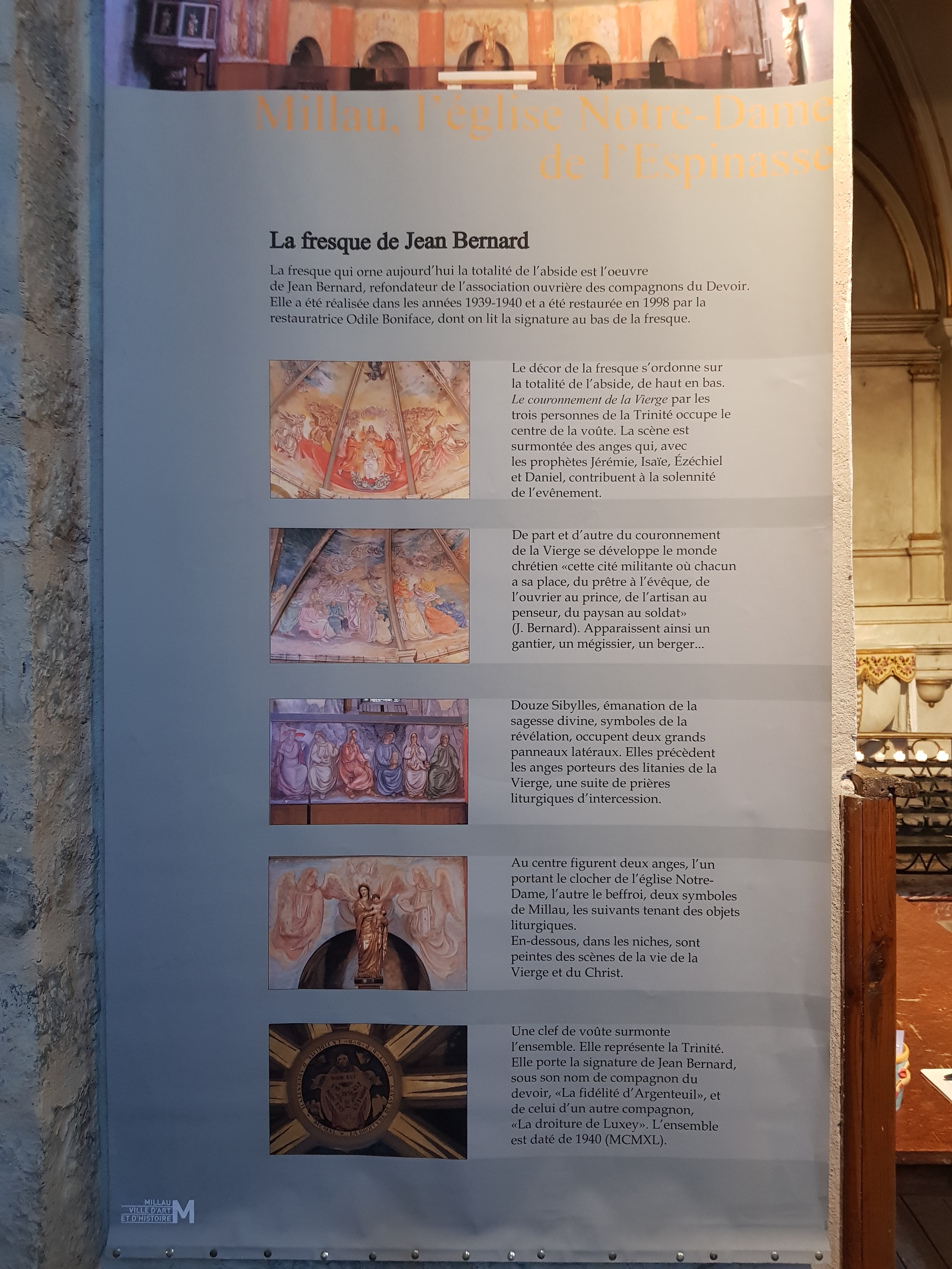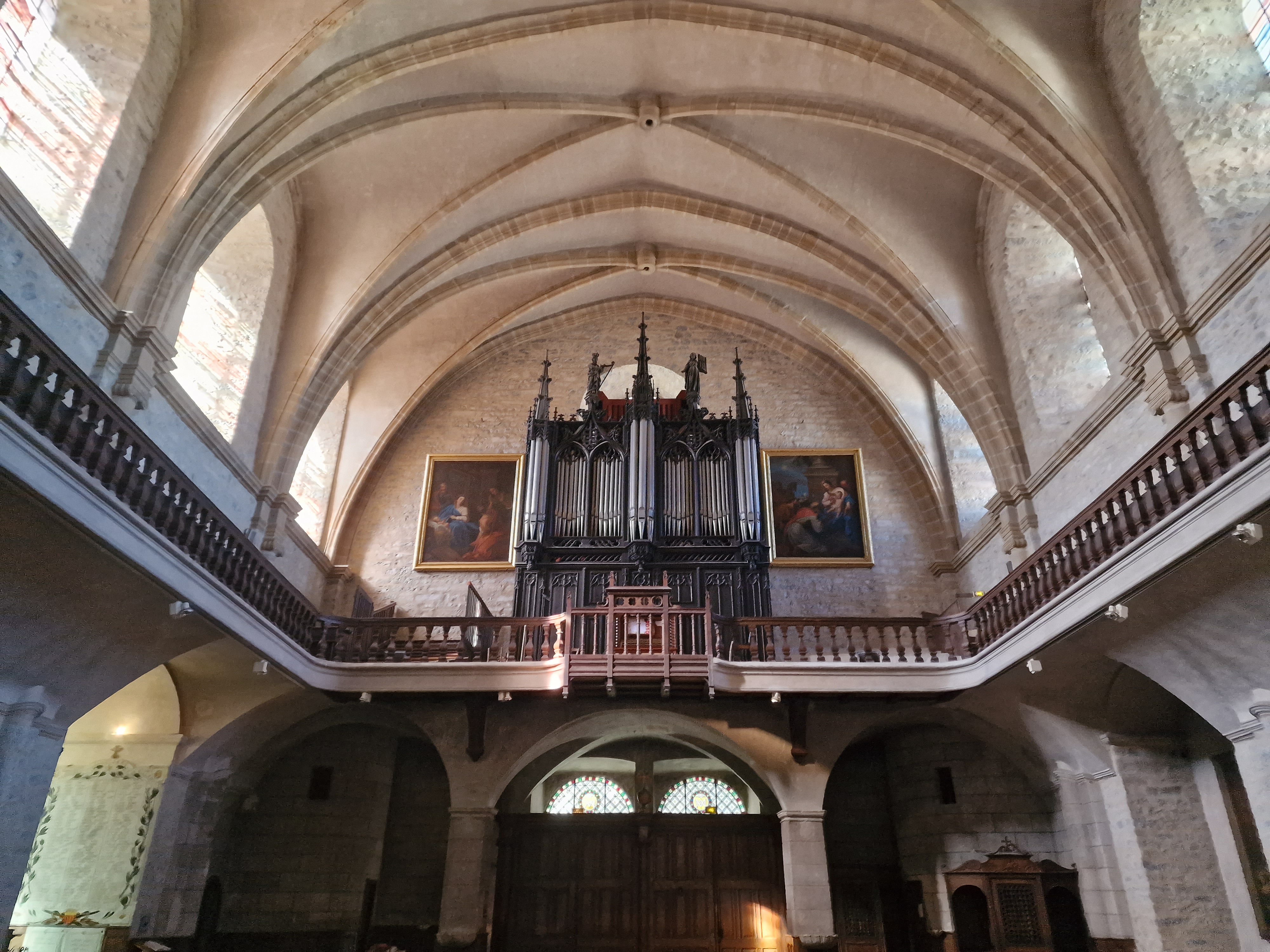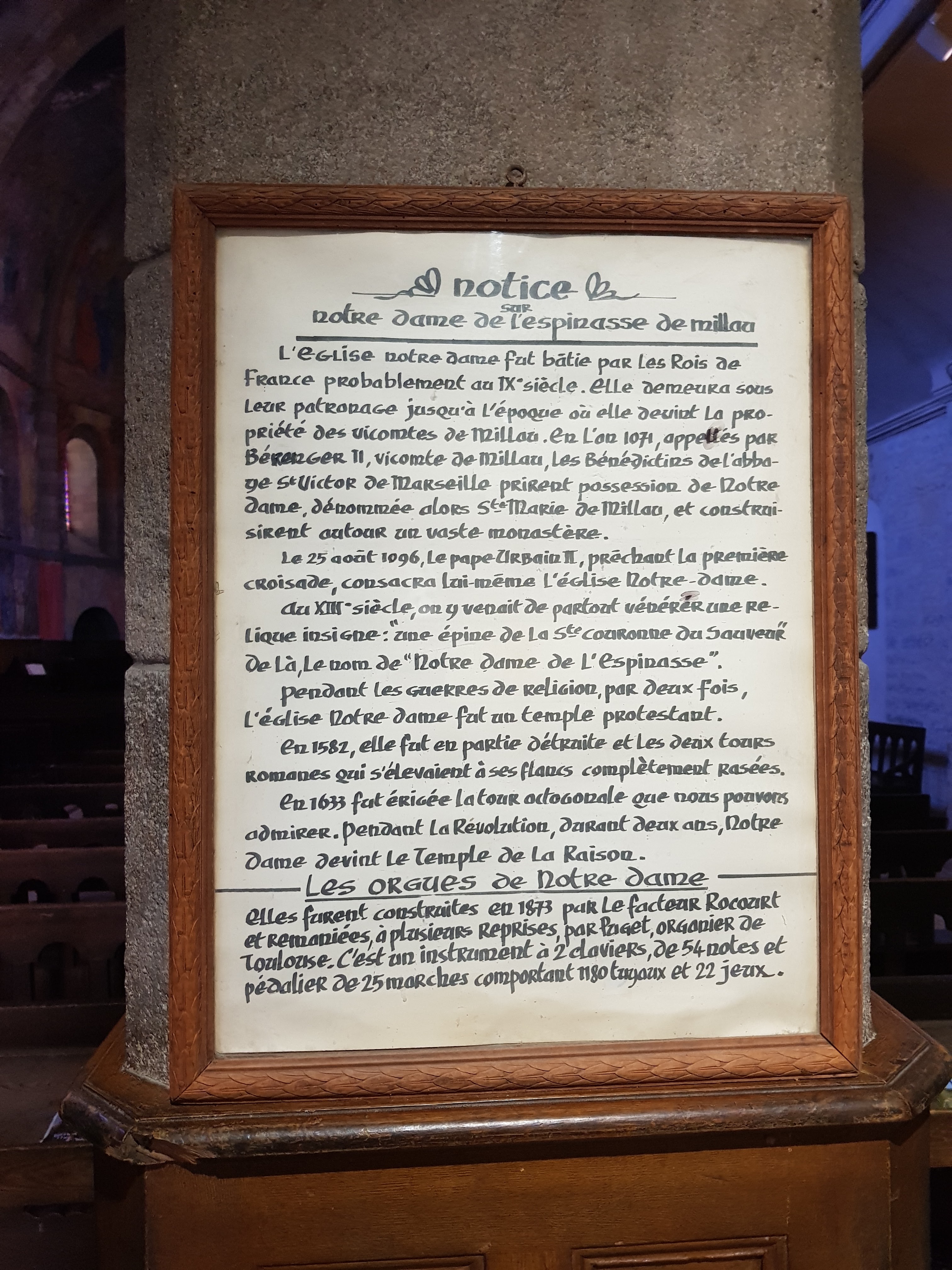 Belle église située dans la vieille ville de Millau. Façade en pierre vue en petit blocs rectangulaires et tour imposante situés à côté. Intérieur avec des fresques spectaculaires des lares dans la zone de l'autel, tant sur les murs que sur le plafond, qui est voûté. d'une belle beauté, ils sont parfaitement conservés deux et leurs couleurs variées et intenses se démarquent res.Dans sa partie supérieure derrière une jolie balustrade en bois il y a un orgue coloré et magnifique de tubes à air.