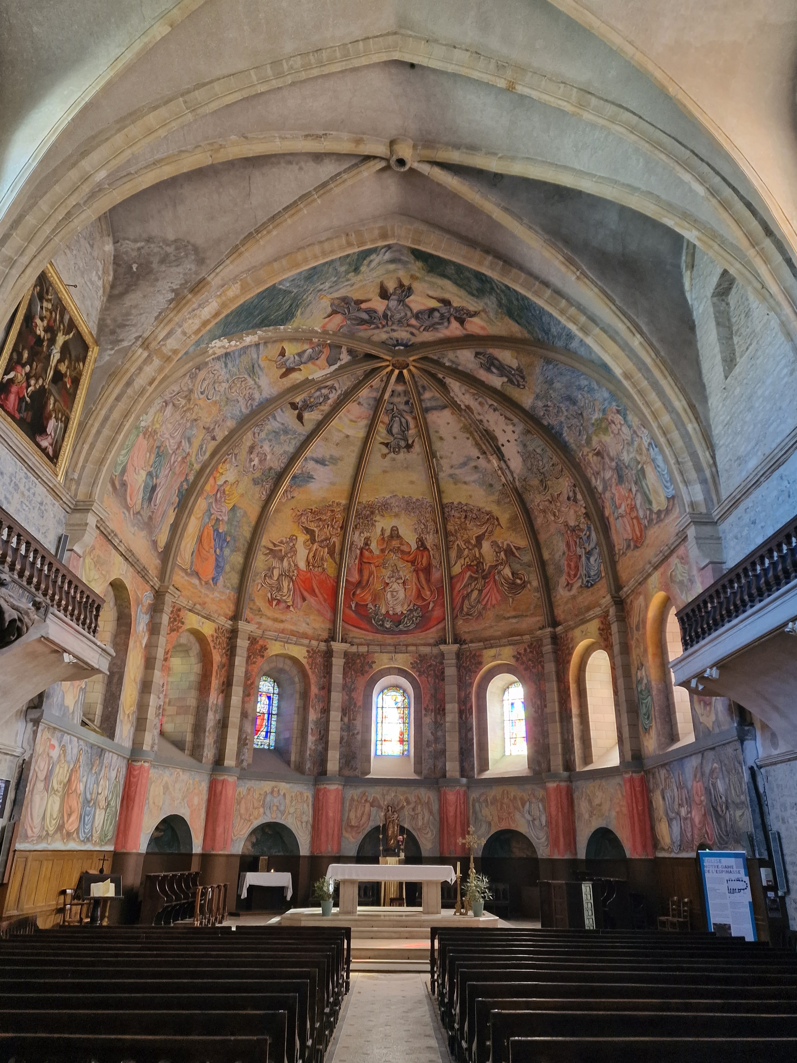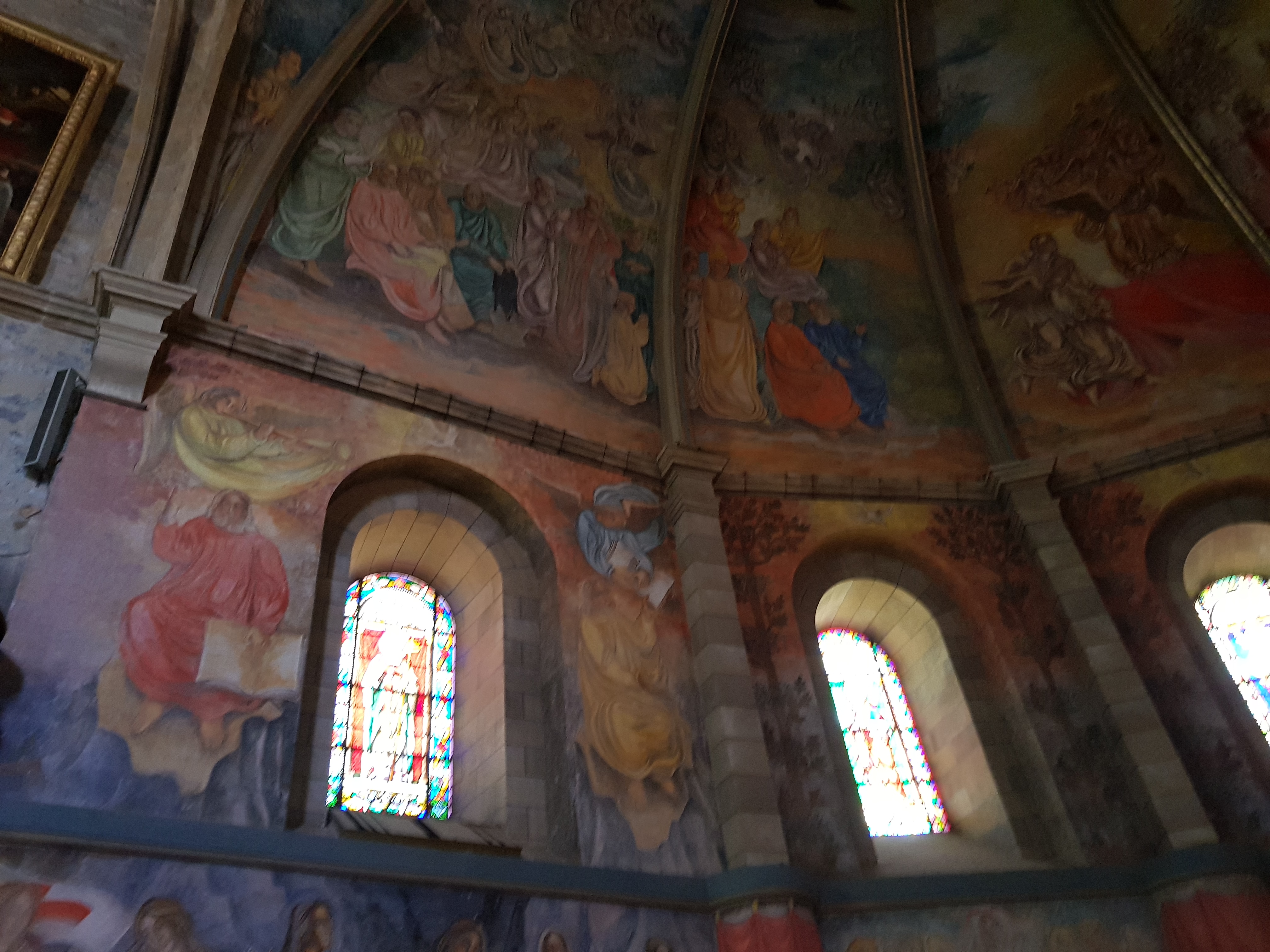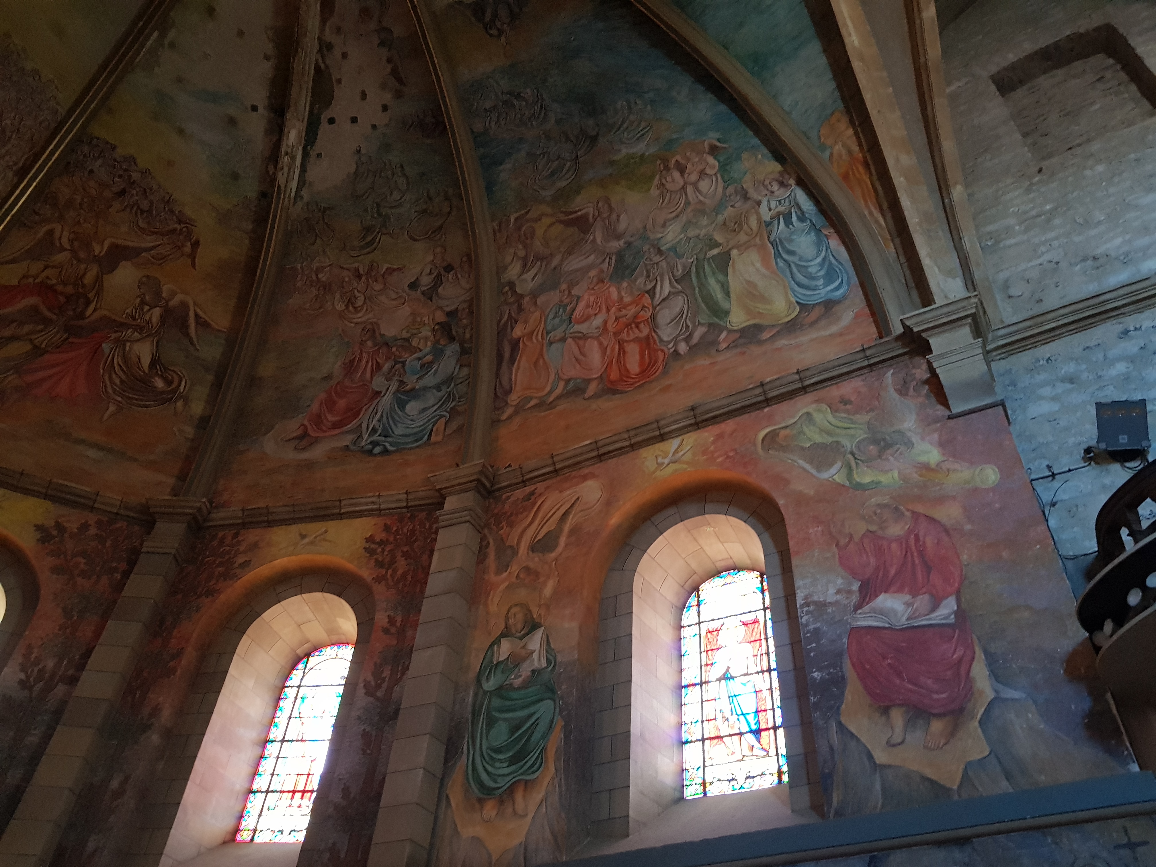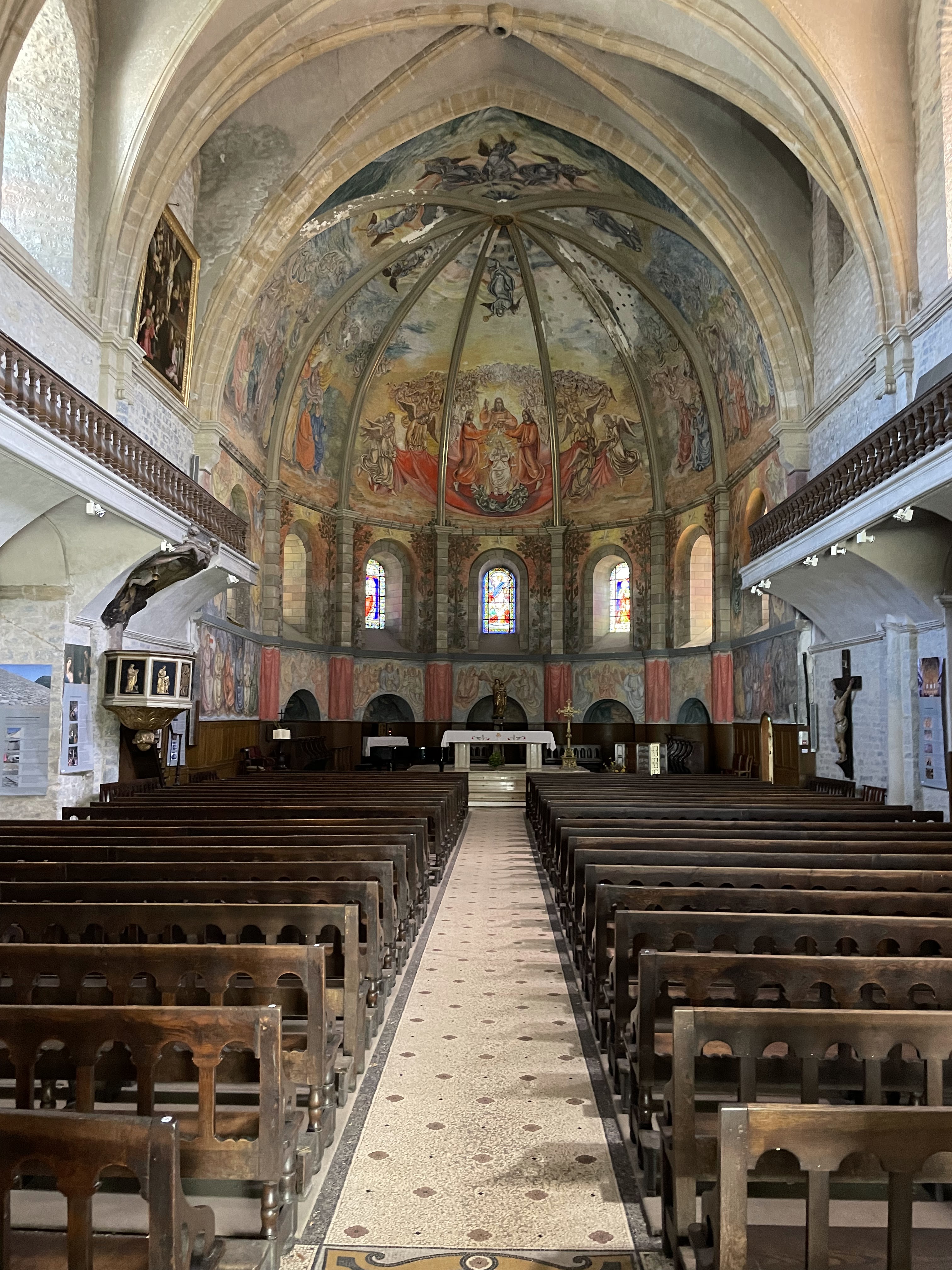 On ne retrouve pas grand chose du bâtiment du XIeme siecle, qui a été beaucoup transformé mais la fresque de l'abside, peinte dans les années 1930, est très impressionnante, ce qui donne à cette église une grande beauté. Et puis il y a le clocher à la mode de Saint-Sernin (de Toulouse).