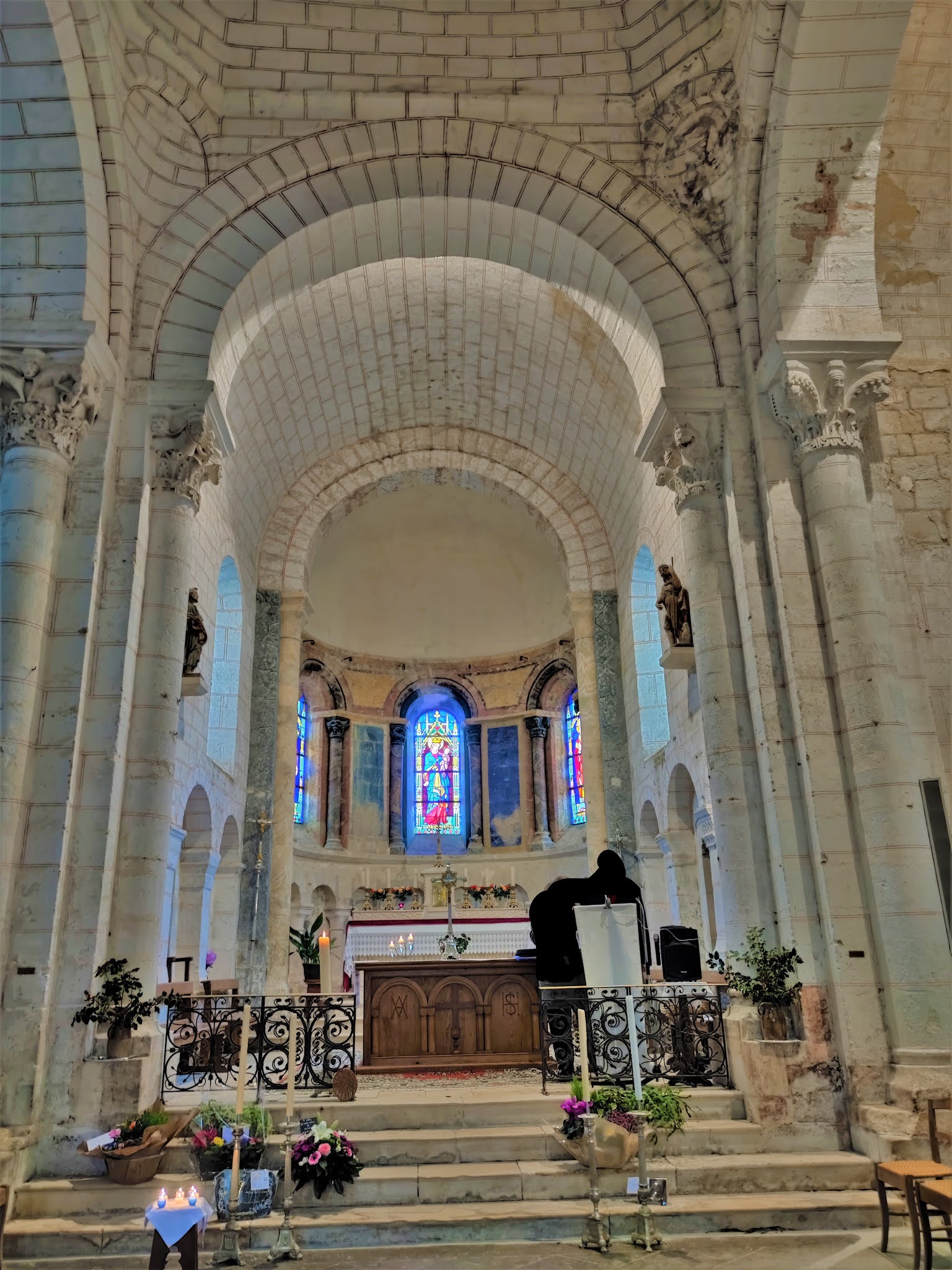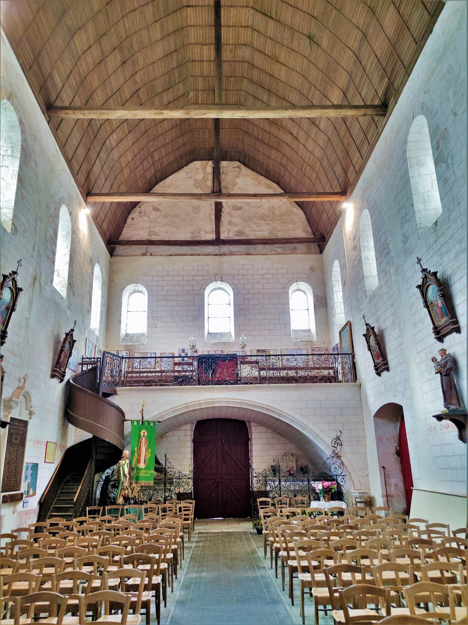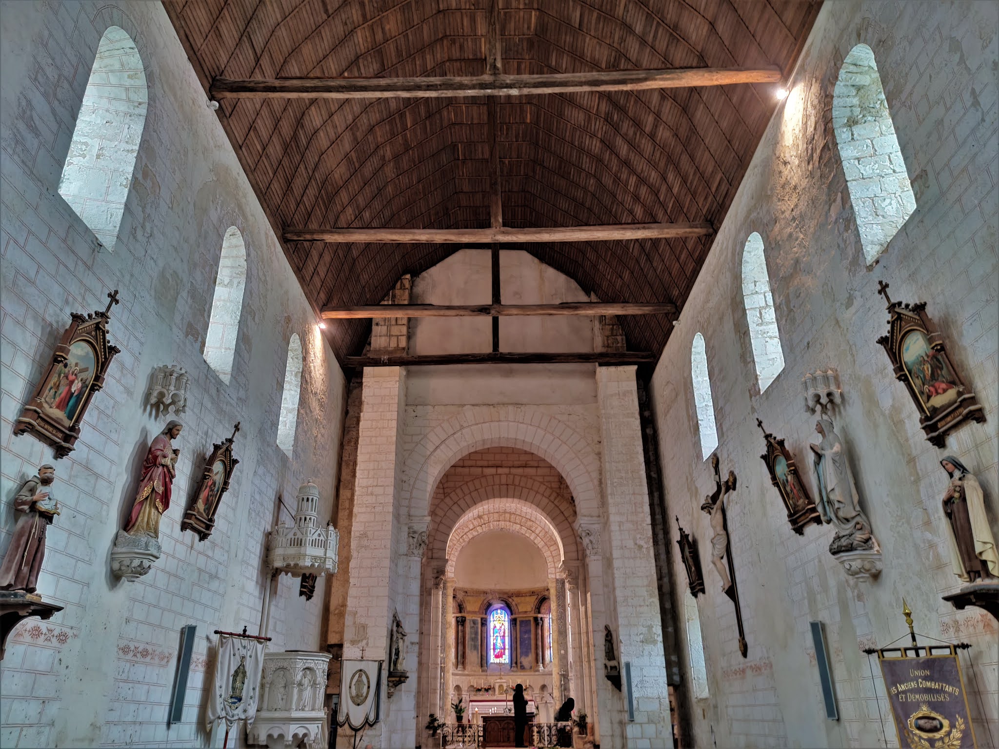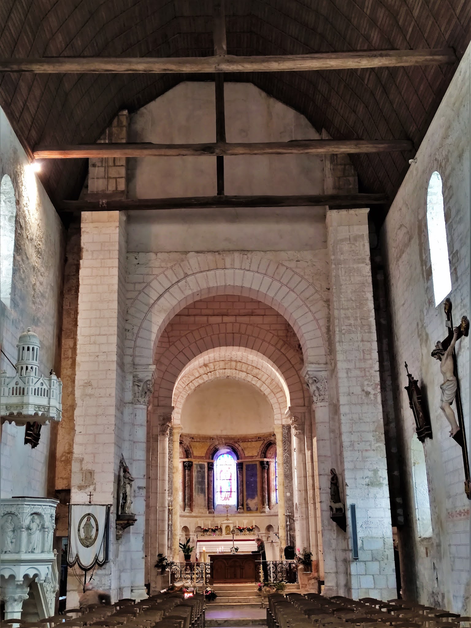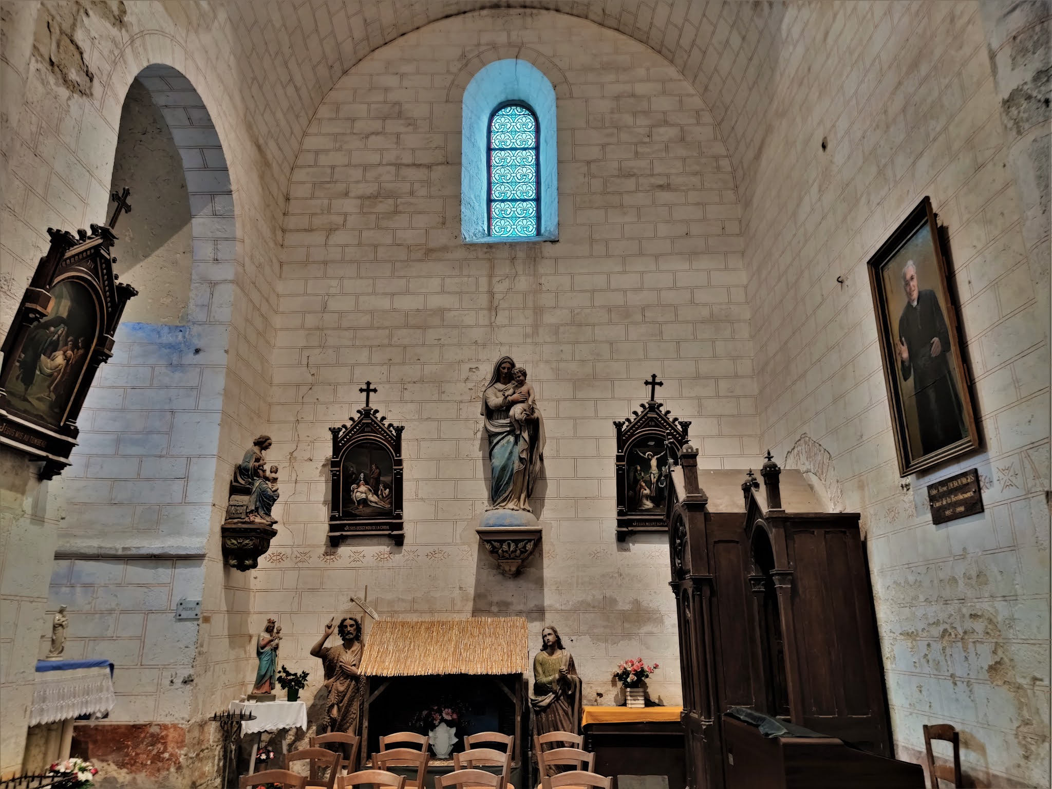 La visite de cette église est riche d'enseignements, l'édifice primitif a été peu remanié. L'église Notre-Dame de La Berthenoux, construite au 12ème siècle et classée en 1924, est typique des églises romanes du Berry. Eglise d'un prieuré bénédictin fondé au 9ème siècle et seul vestige de cette possession de l'abbaye de Massay, elle devint église paroissiale à la révolution française. Son chevet avec abside et absidioles, que l'on voit en arrivant, ne manque pas de charme. Le transept et sa croisée dominée par un clocher carré annoncent un édifice de belles dimensions, mais joliment proportionné. On pénètre à l'Ouest par un porche simplement décoré et surmonté de quelques modillons. La nef est voûtée en bois comme l'était l'édifice primitif, la voûte en pierres bâtie au 19ème siècle a été démontée. L'accès au transept est impressionnant, deux piliers porteurs sont dans la nef, particularité architecturale qui autorise l'existence de deux passages berrichons. Quatre passages de la même hauteur encadrent la croisée du transept, cette dernière est voûtée à 8 pans reposants sur 4 trompes et 4 arcs doubleaux. Des chapiteaux sculptés, quelques tableaux, les décors peints dans l'abside, des vitraux, apportent quelques agréments dans cette église d'une grande sobriété. La visite de cette église est riche d'enseignements, l'édifice primitif a été peu remanié. Seuls, font exception, la sacristie accolée au Sud du chevet et la tour escalier du clocher ajoutée au 19ème siècle.