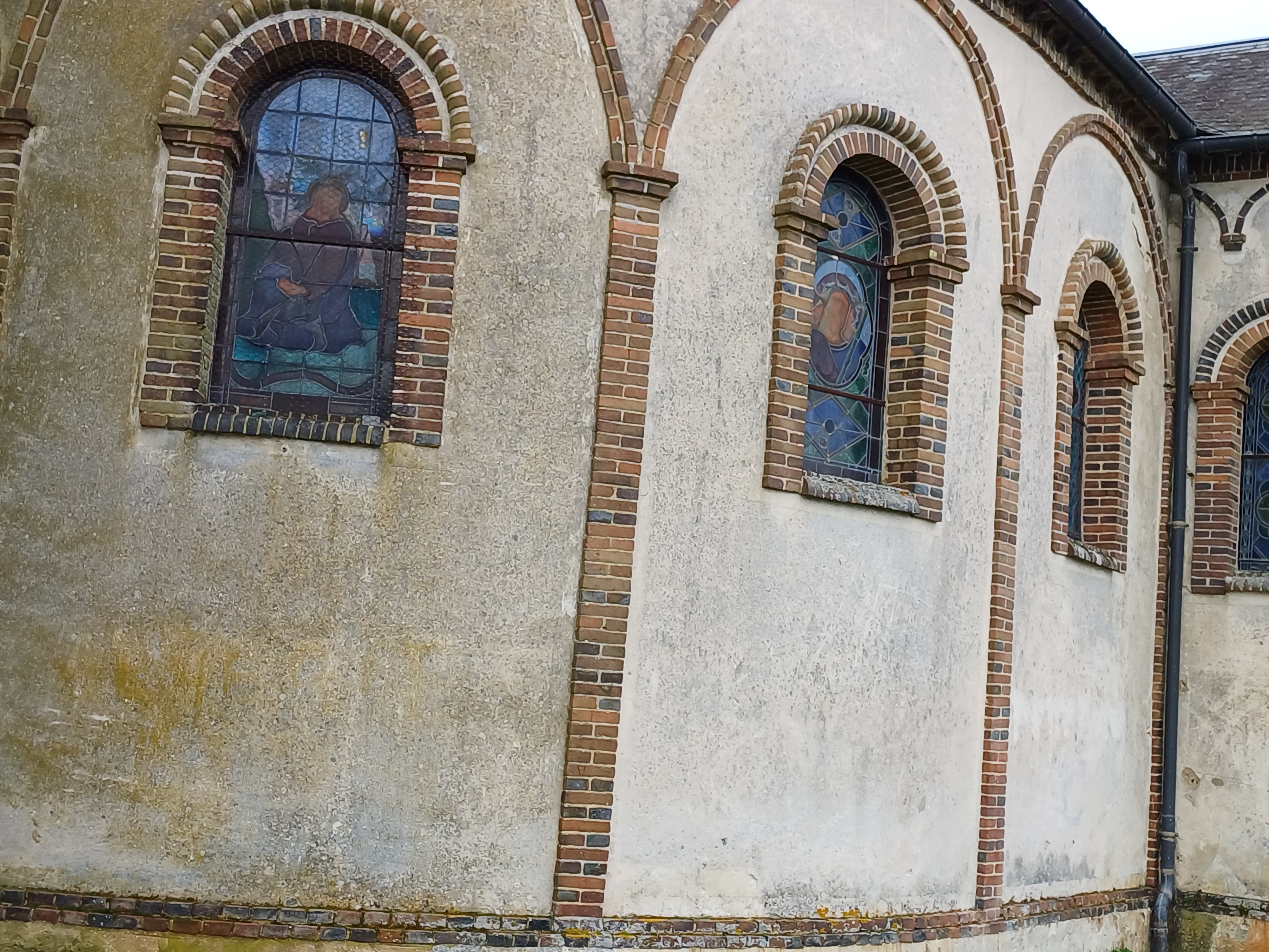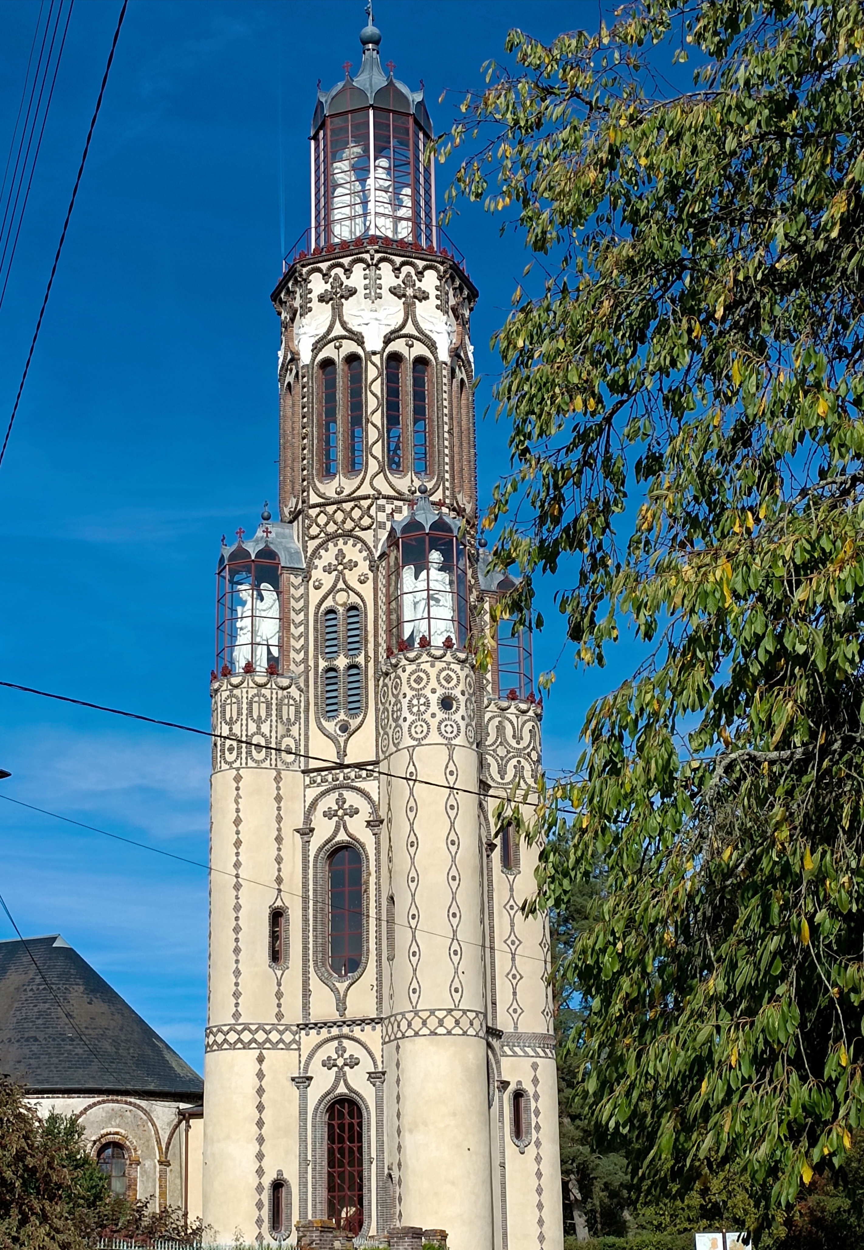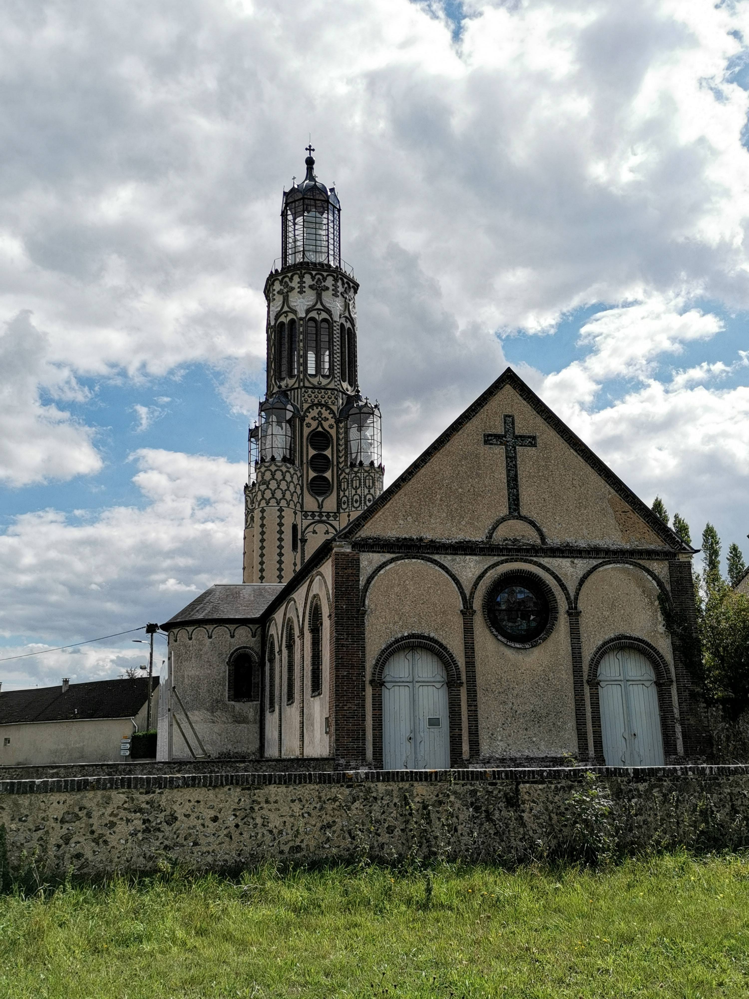 eglise avec un clocher hors norme et de magnifiques vitraux plantée au milieu d'un tout petit village, surprenant