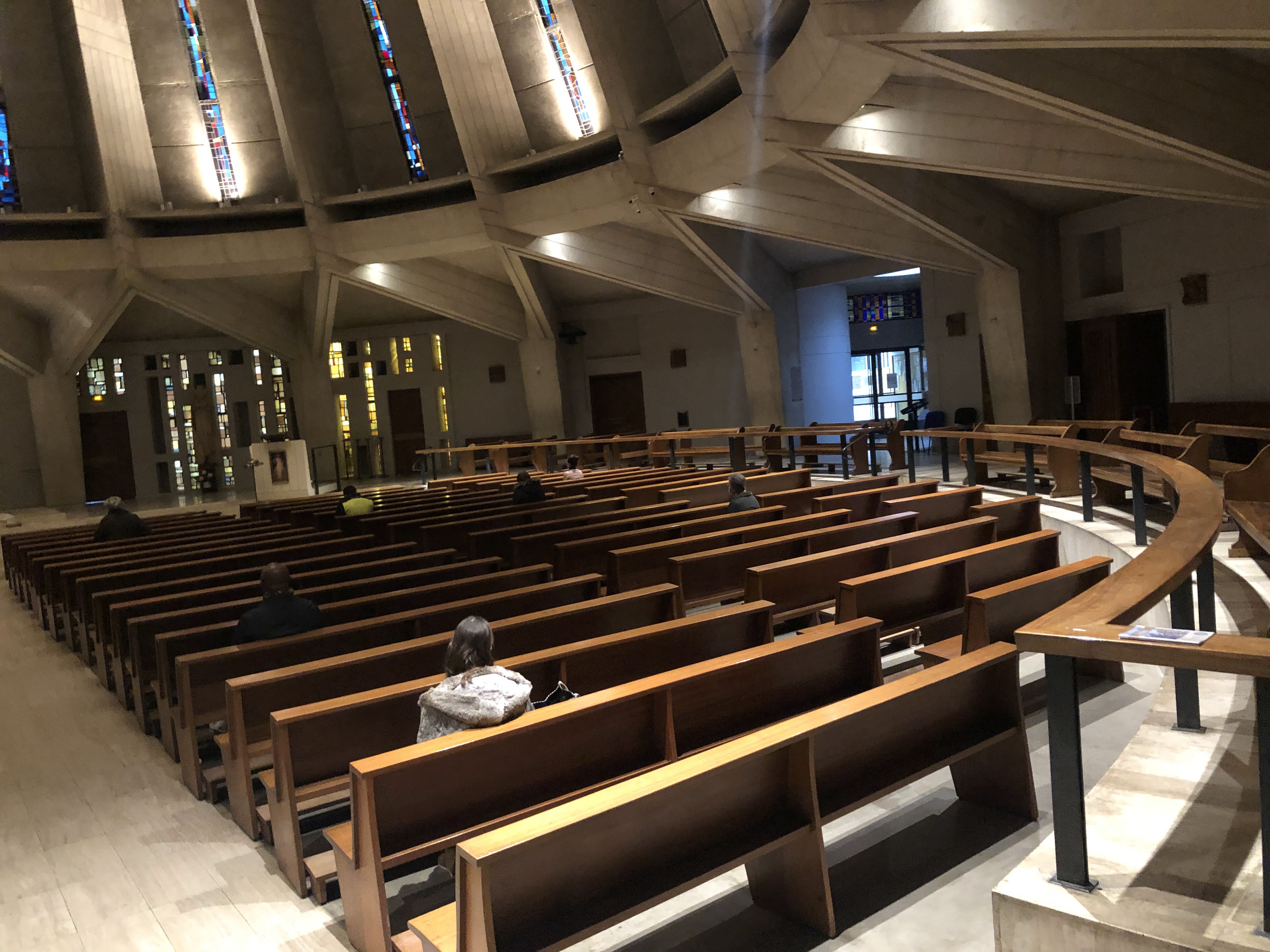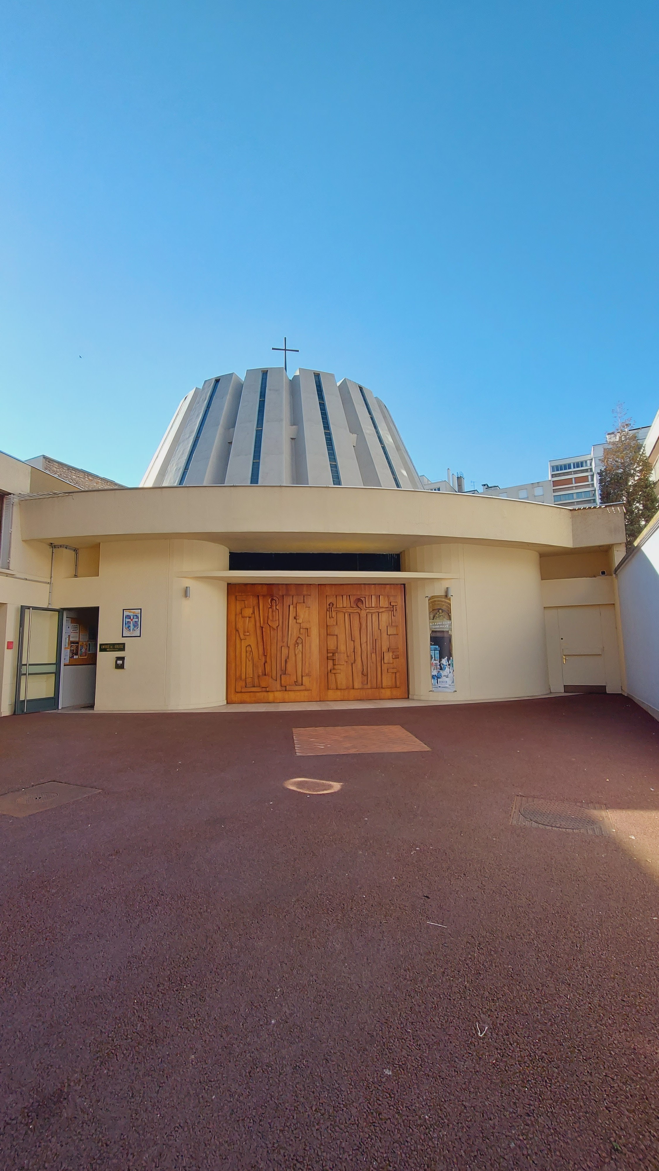 Je suis venue plusieurs fois dans cette église très moderne dans sa forme et le béton utilisé, , pendant les offices il est possible de se retirer dans une salle sur le coté, pour y emmener un enfant bruyant, , les offices y sont très priant, 1 fois par mois au minimum, la messe de 11h est chantée par une chorale mixte, adultes et enfants, les chants montent dans la voûte, accompagnés par un bel orgue refait à neuf, sur lequel joue un organiste de talent, l'église est Ronde, vous pouvez voir l'autel, et suivre le célébrant facilement, communauté paroissiale, chaleureuse et active,