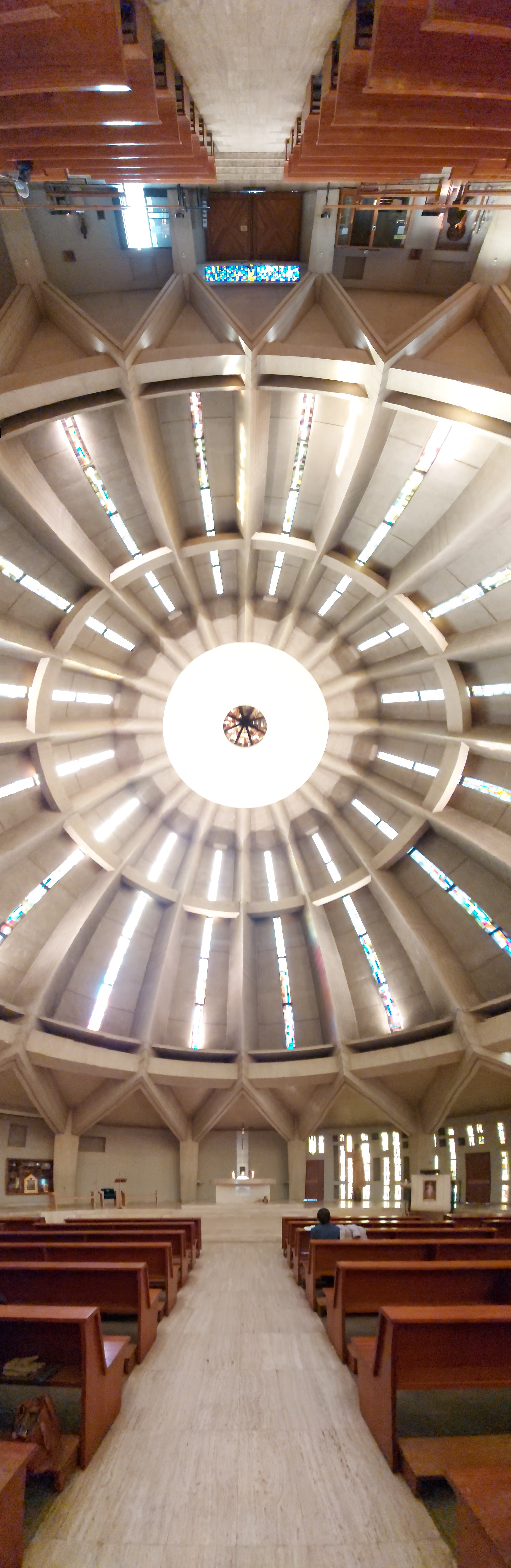 Tres jolie église moderne circulaire propice au culte et au recueillement grace à sa luminosité , aux matériaux utilisés et sa lumineuse coupole Cette église paraît très vivante au visiteur de passage, qui comme moi entrée un dimanche a été impressionnée par le dynamisme et la jeunesse des membresparticipant à la célébration sobre et priante de la messe