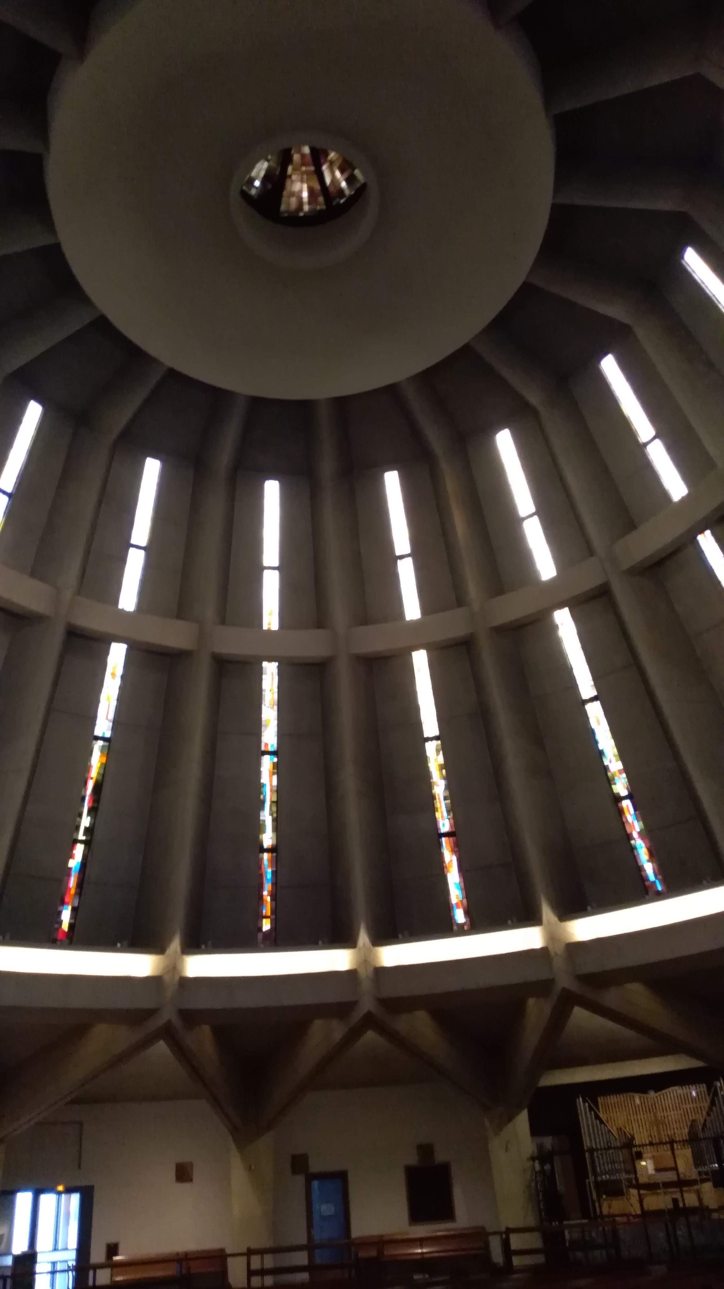 Église moderne, très belle à l'intérieur, disposition en rond sur un plan incliné... de l'extérieur on a l'impression qu'une soucoupe volante s'est posée là...