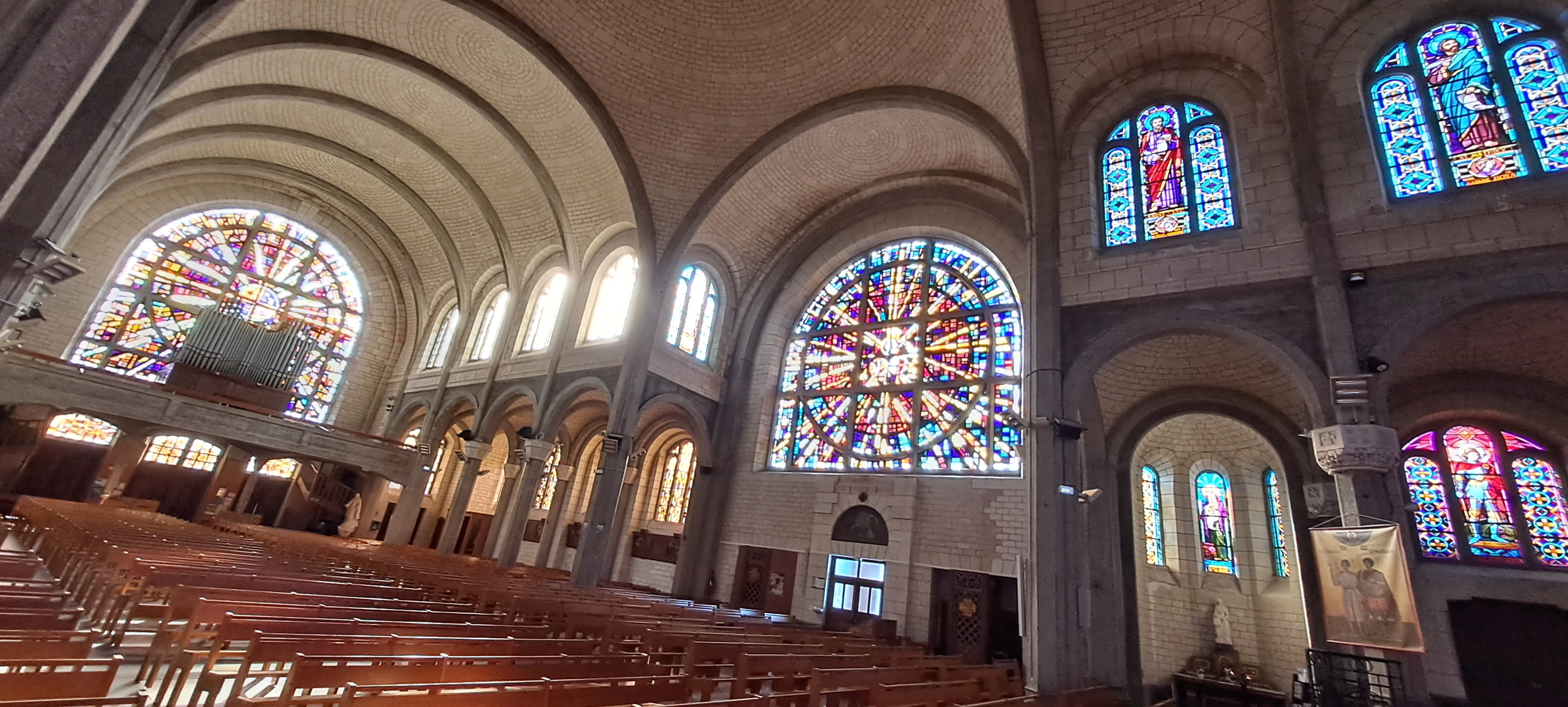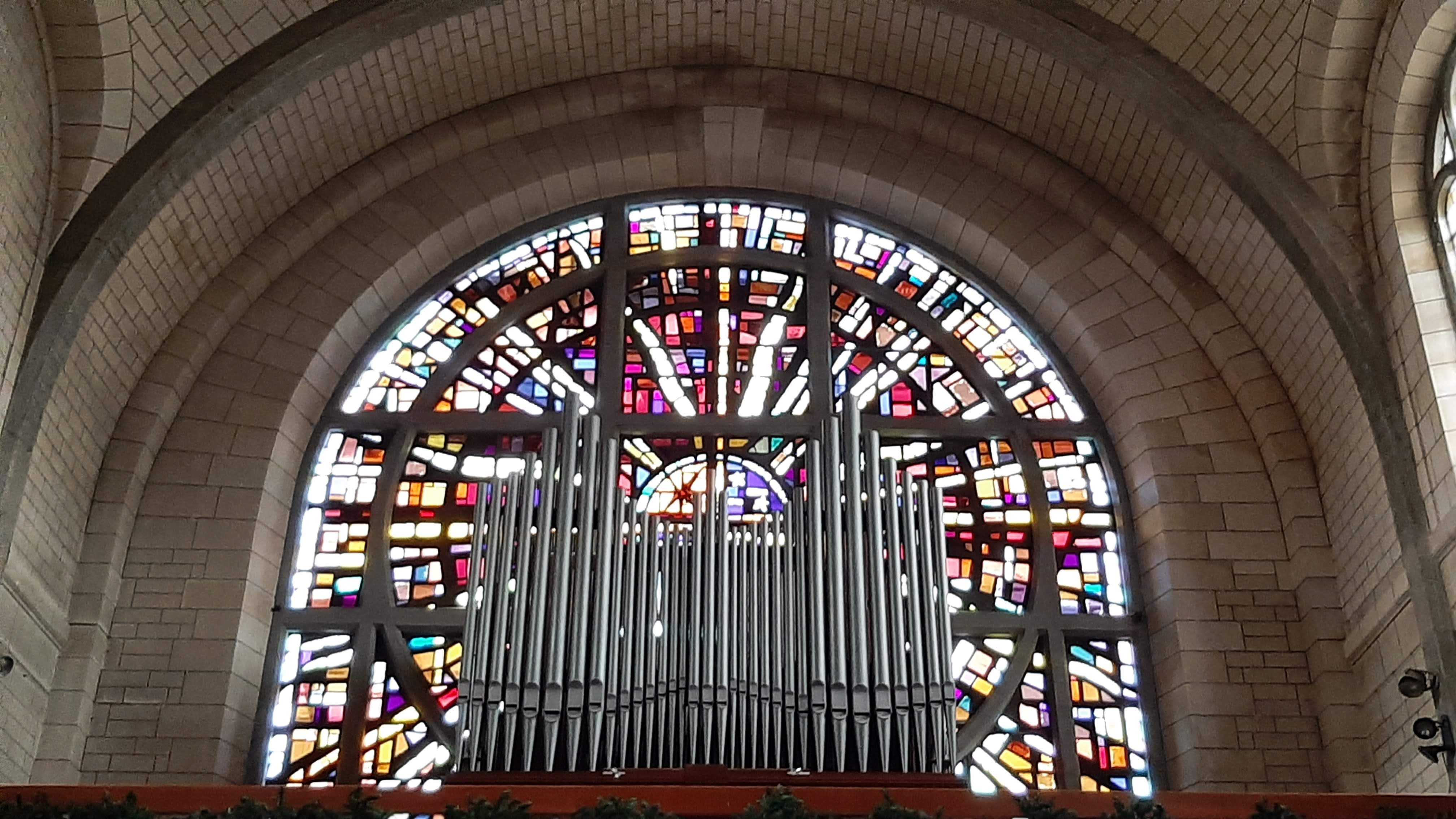 Belle église avec de beaux vitraux modernes et un grand orgue