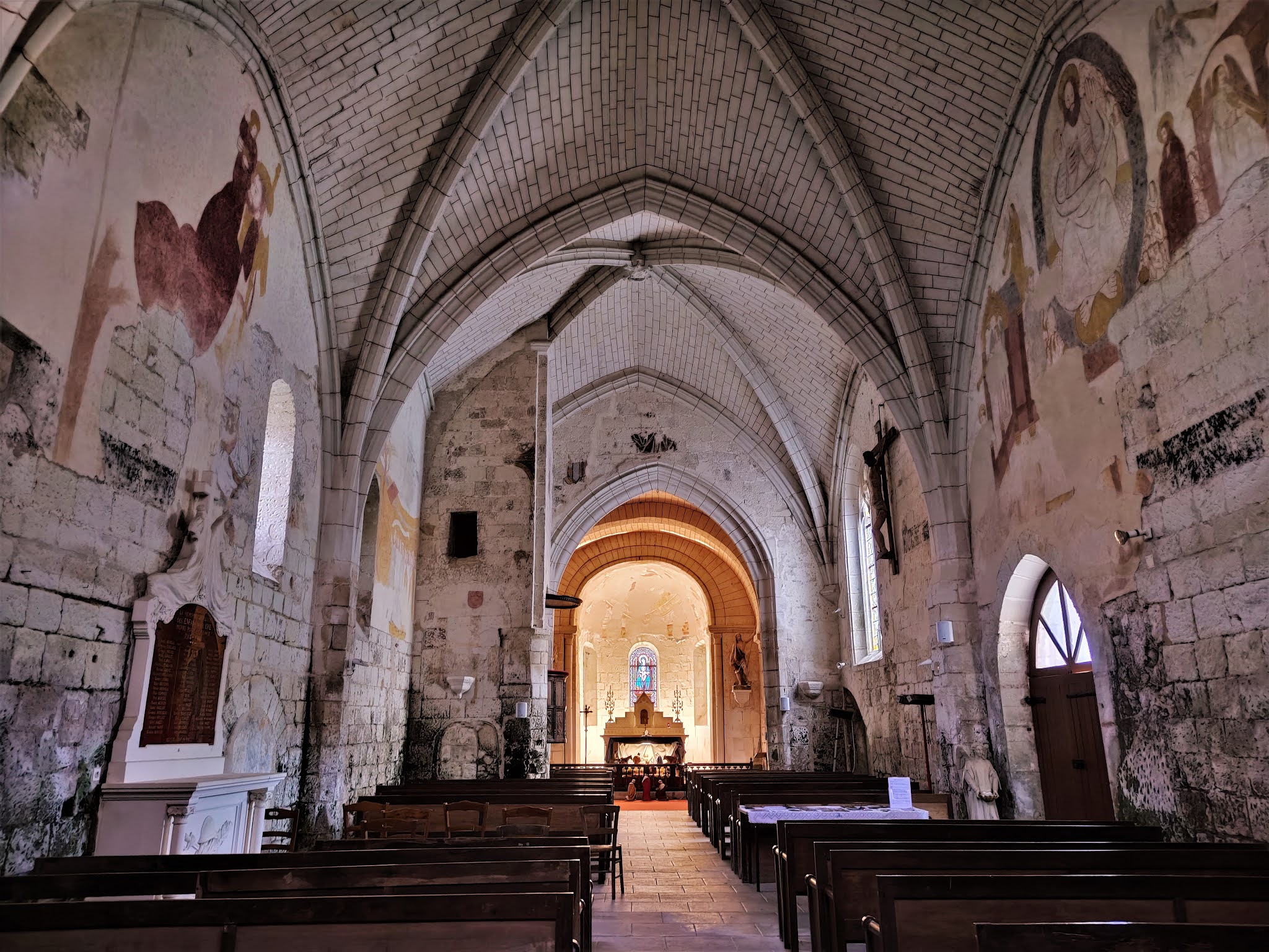 Restauré et bien mis en valeur, ce monument roman repris au 15ème siècle mérite une visite. Une église du 12ème siècle, le sanctuaire est abrité dans une abside voûtée en demi-coupole. Les deux travées du chœur, voûtées en berceau, sont encadrées par deux chapelles à chevet plat, du 15ème siècle, voûtées en croisées d'ogives. La nef romane a reçu une voûte gothique au 15ème siècle, de nombreux décors peints sont visibles partout dans l'église. Les ouvertures romanes ou gothiques ont reçues des vitraux offrant un éclairage coloré très agréable. Au Nord, un arc boutant et le clocher carré en protubérance du mur apportent quelques originalités. Au Sud, une porte abritée par un balet ou caquetoire en pierre permet d'accéder à la nef. La restauration de cette église est une réussite.