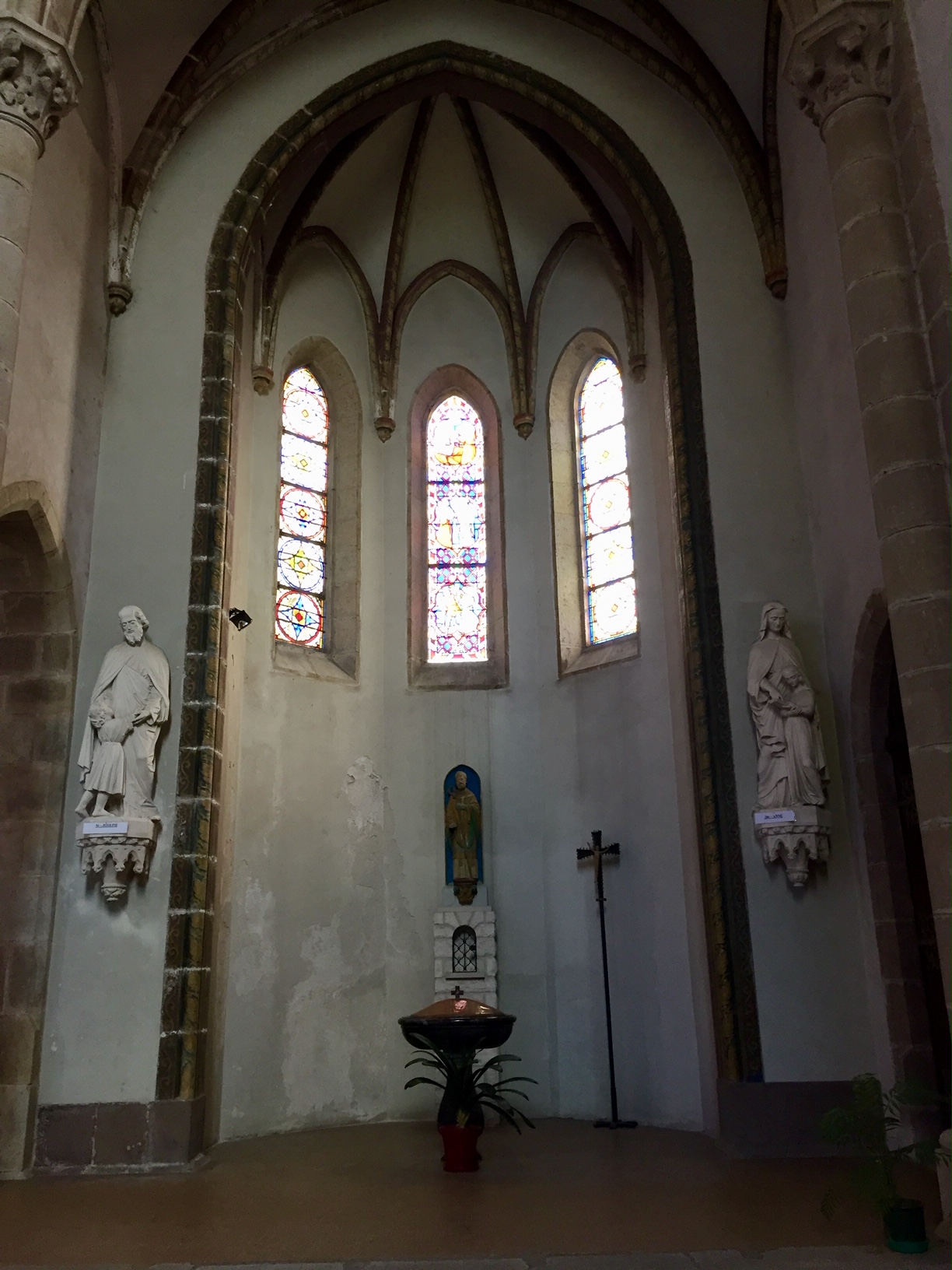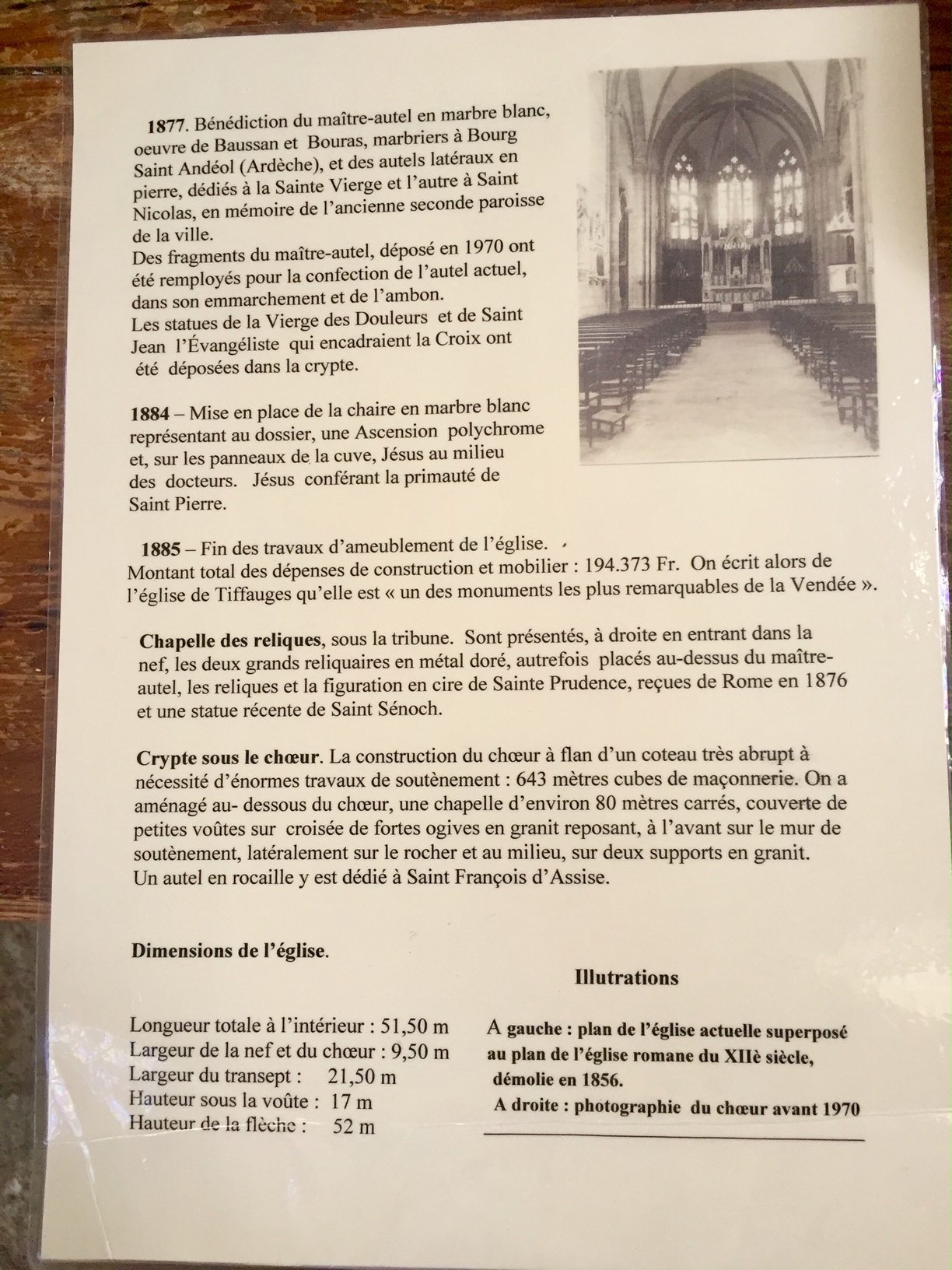 En dehors du château, le patrimoine de Tiffauges m'a déçu quant aux possibilités de visites. L'église romane Saint-Nicolas est en piteux état extérieur et inaccessible. L'église contemporaine Notre-Dame présente quelques jolies choses à l'intérieur, mais sa crypte, pourtant en bon état est fermée à la visite : renseignements pris et après avoir été redirigé deux fois, on m'a informé d'une possibilité pour visiter la crypte le 8 août 2018 à 20h 30mn. J'étais sur place le 17 juillet 2018 ???