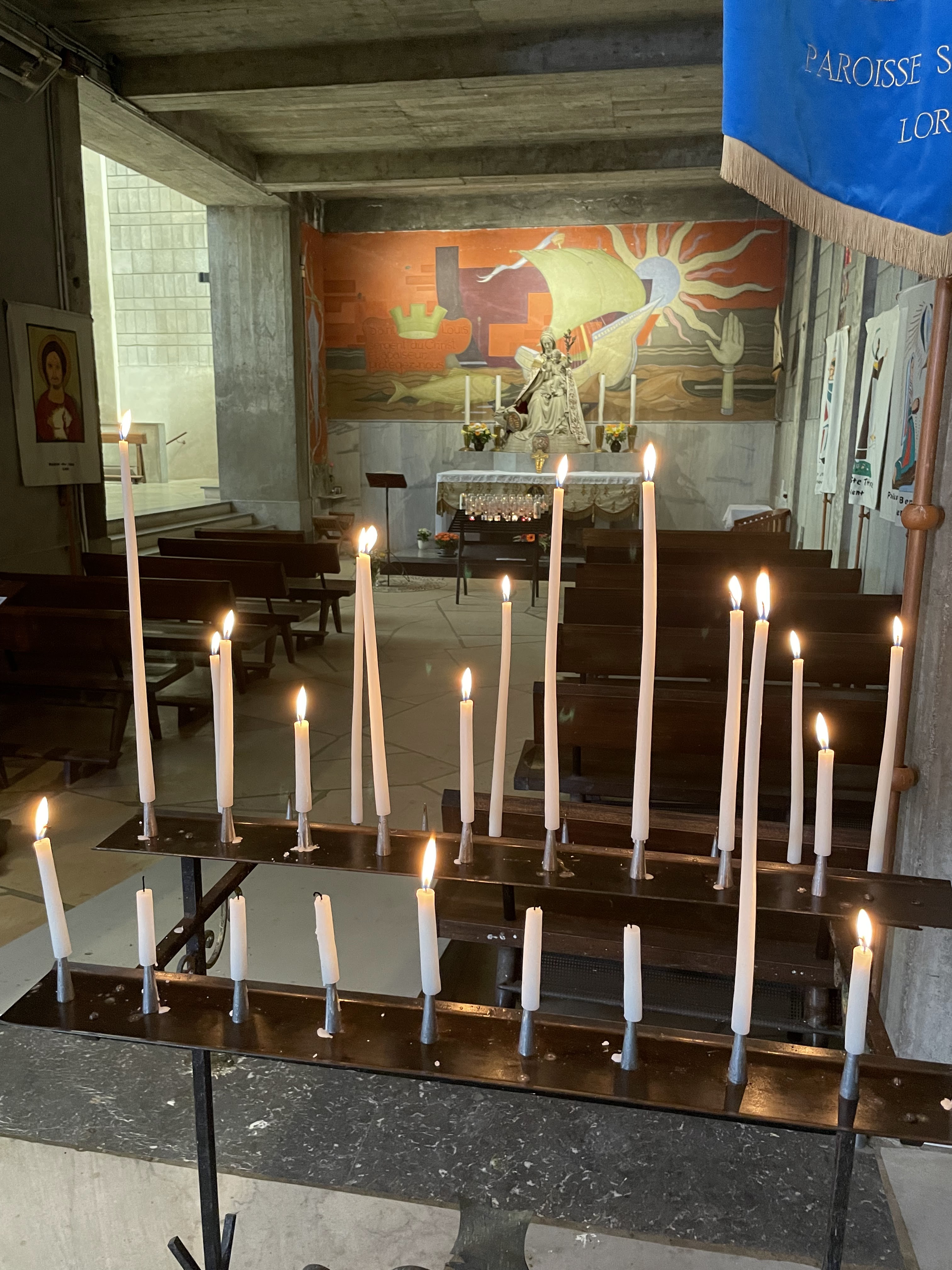 J'aime beaucoup ce genre d'architecture religieuse typique de l'après-guerre. Il en ressort, je trouve une forte spiritualité. L'église vaut la visite et un petit détour.