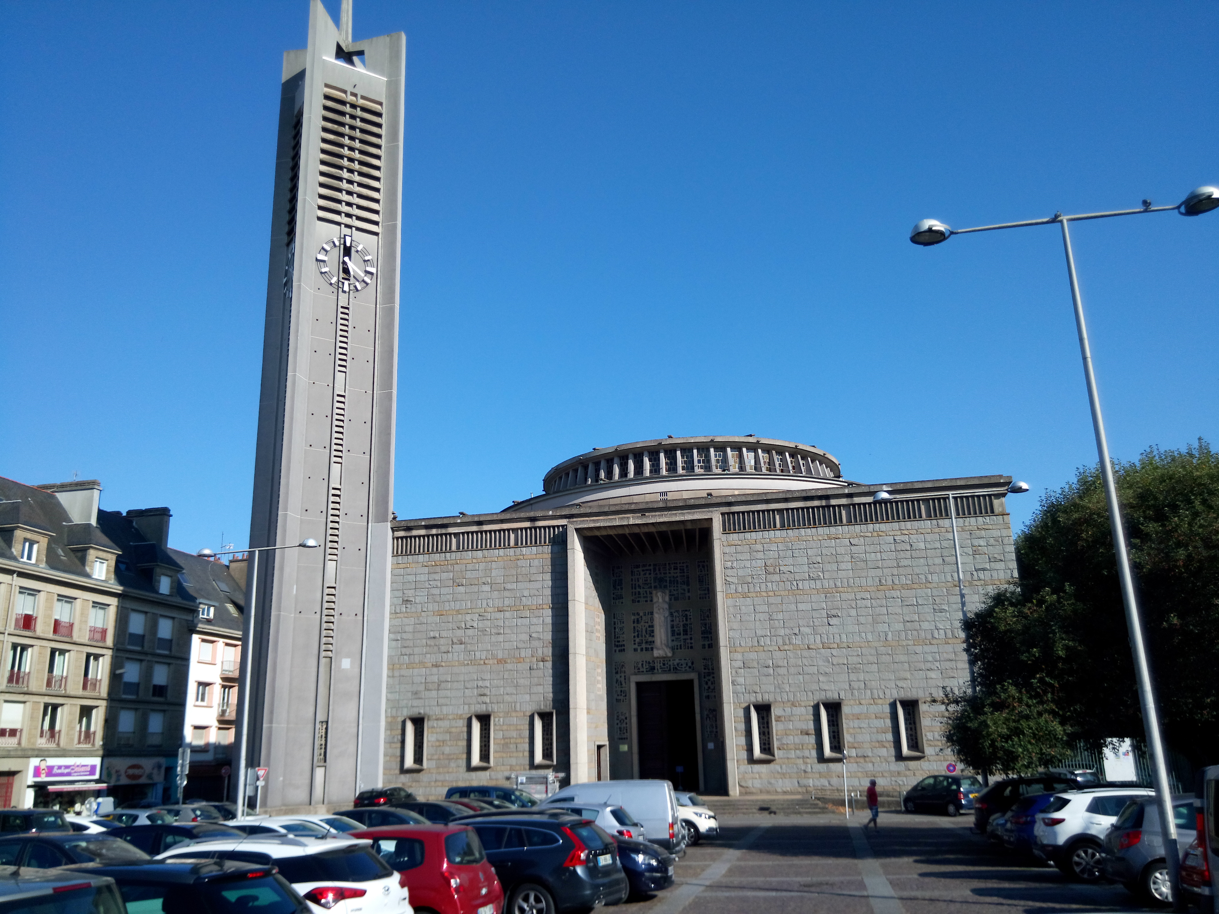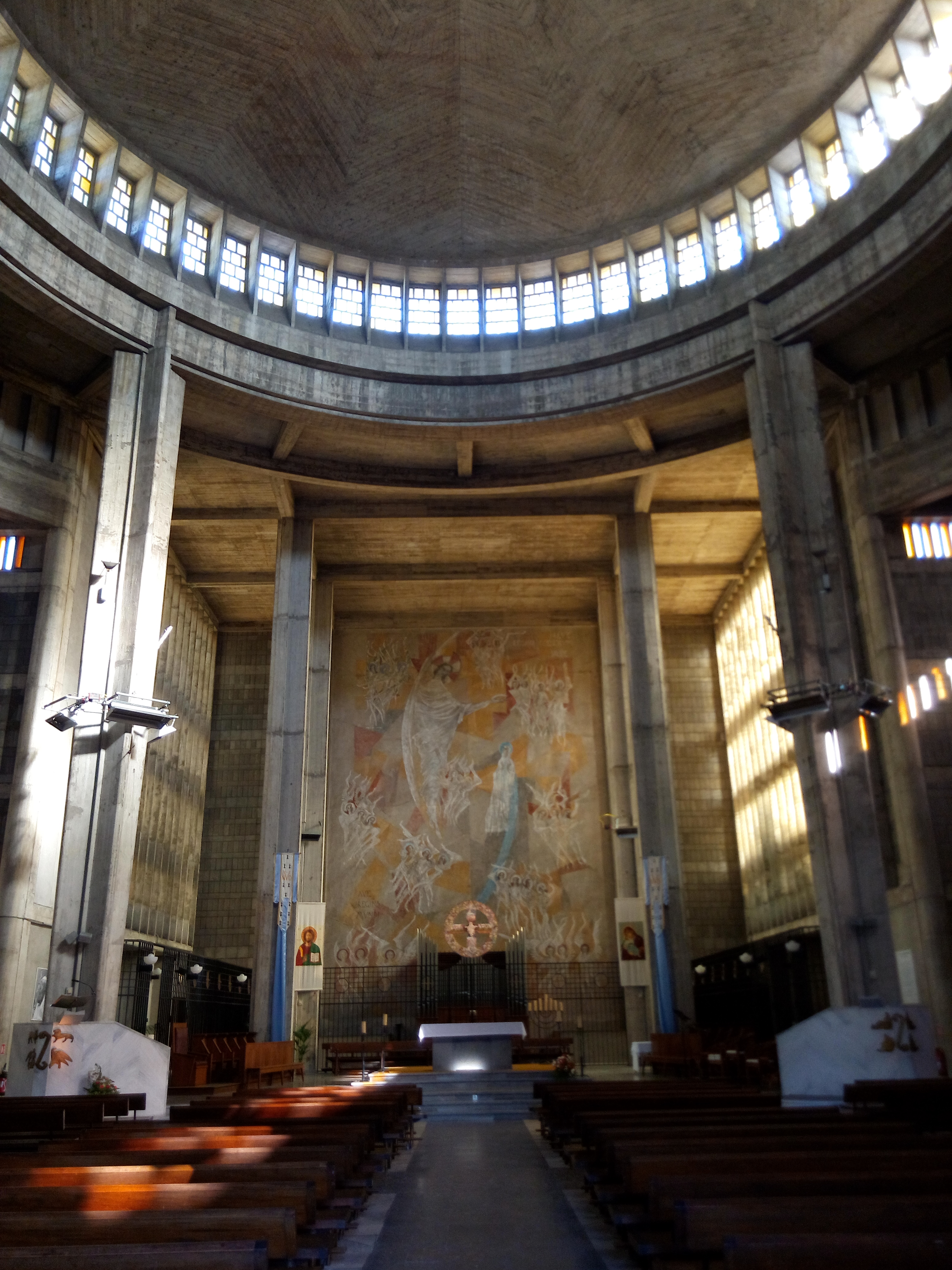 Église surprenante, en béton , assez exceptionnelle de par sa taille. Un effet acoustique surprend sous la coupole où le moindre bruit est reproduit par un écho remarquable ( phénomène similaire dans l’entresol de la gare centrale de New York sauf qu’il n’y a jamais assez de silence pour l’expérimenter !)