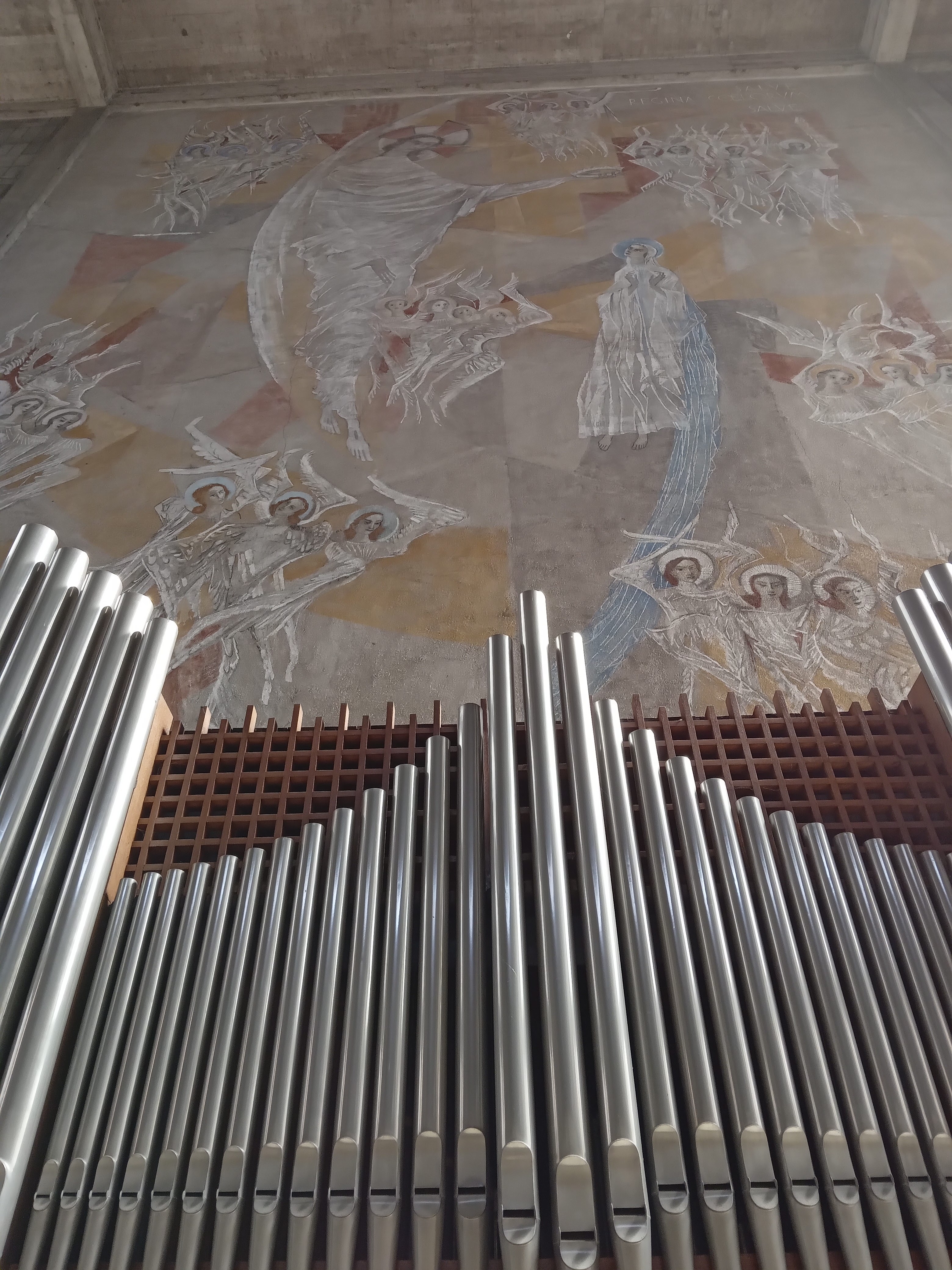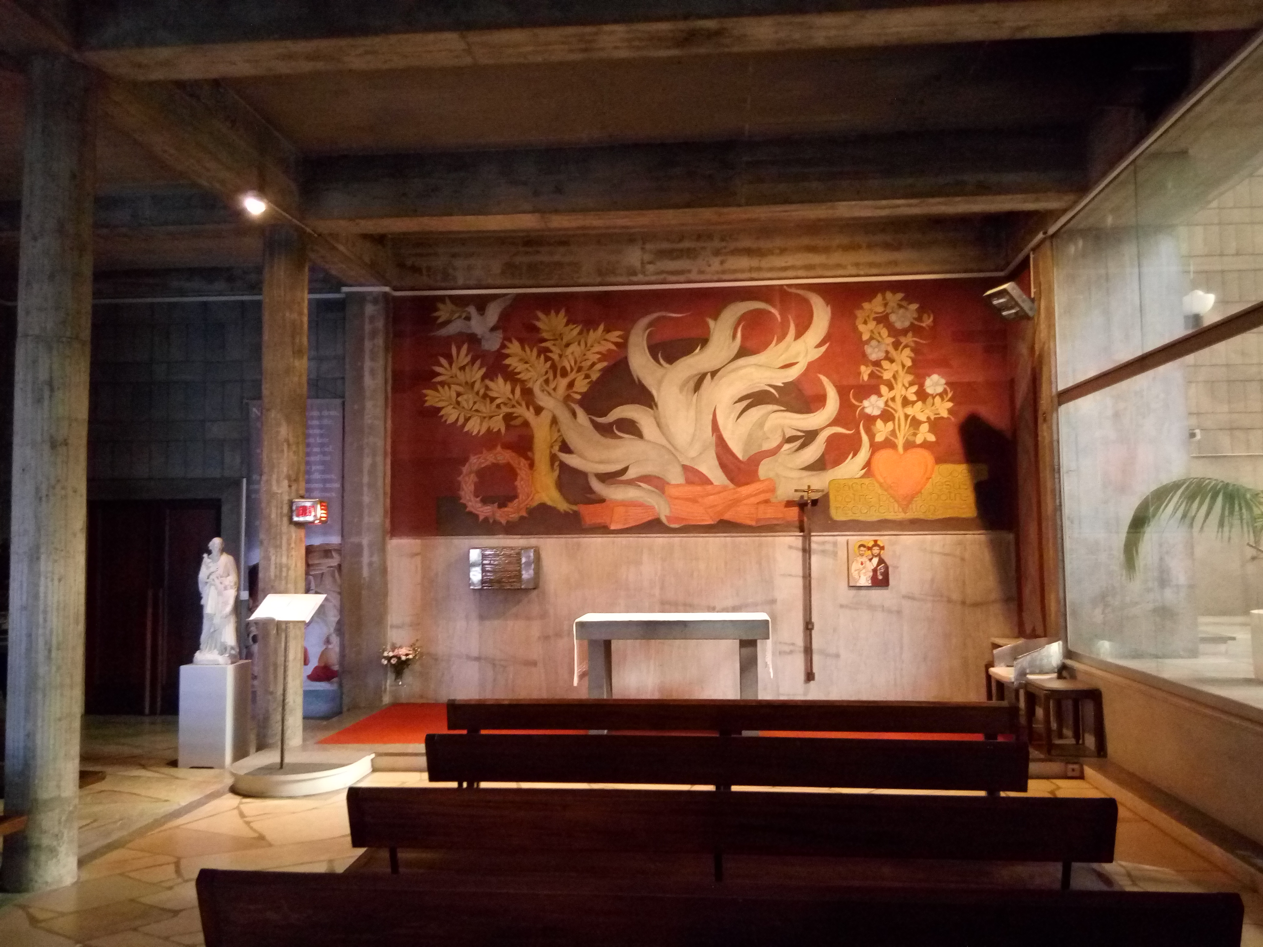 Architecture moderne en béton. Le cœur et les fresques sont très stylisés.