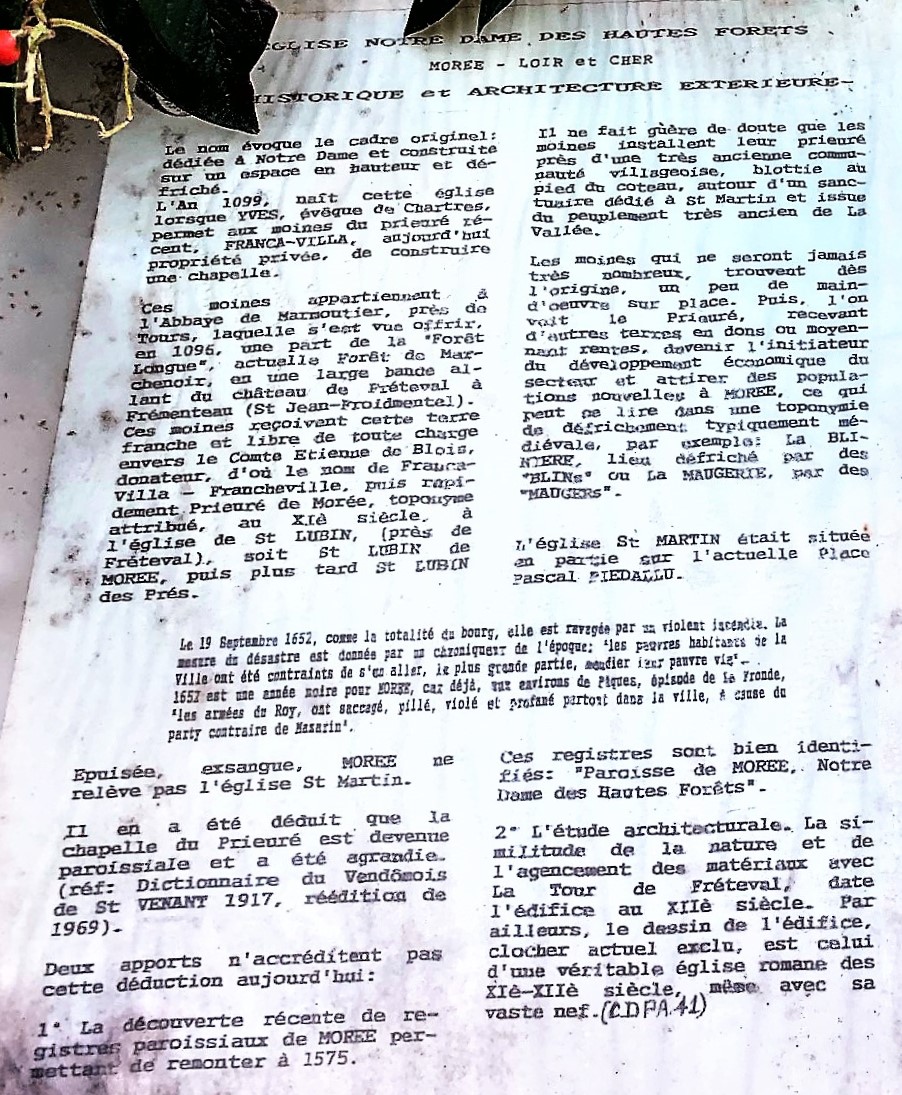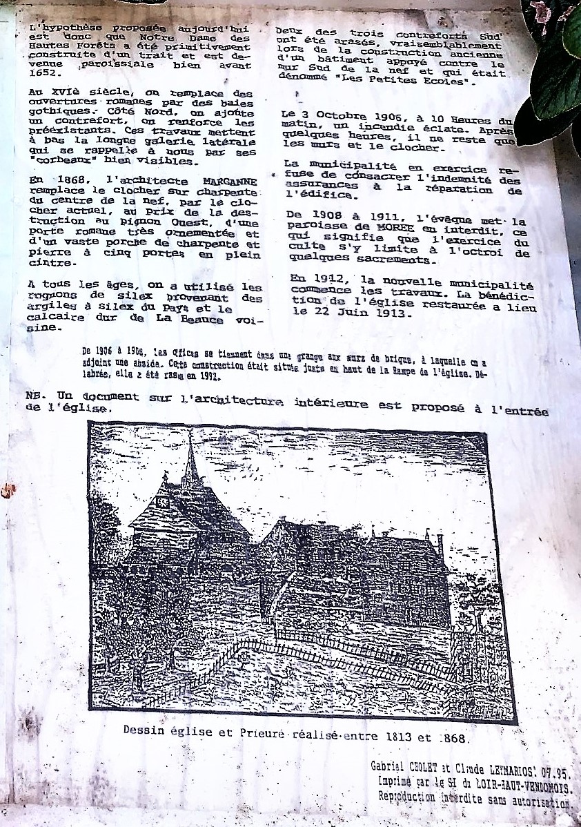 Une église ouverte et accueillante, un magnifique témoin de 1000 ans d'histoire. Au 11ème siècle, c'est une chapelle prieurale (prieuré rattaché à l'abbaye de Marmoutier) qui est d'abord édifiée à l'emplacement de l'édifice actuel, situé sur les hauteurs. Au 12ème et 13ème siècles, une église romane ( Notre Dame des Hautes Forêts), est bâtie à la place de la chapelle prieurale. En défrichant des terres, aidés par les habitants des hameaux, les moines du prieuré ont œuvré pour le développement économique de Morée, attirant de nouvelles populations. L'église paroissiale Saint-Martin, construite dans le bourg, disparaît en même temps que la plus grande partie du village dans l'incendie de 1652. On suppose aujourd'hui que cette église romane du prieuré a eu des fonctions d'église paroissiale avant 1652, rôle qu'elle a tenu de toute façon à partir de cette date. Au 16ème, des modifications introduisent des éléments gothiques dans cette église Notre Dame des Hautes Forêts, et au 19ème, on édifie le clocher actuel. Au 20ème siècle, en 1906, un incendie criminel détruit l'église, la municipalité en place est anticléricale, elle utilise l'argent de l'assurance pour construire un pont. C'est seulement en 1912, que les nouveaux élus décideront de la restauration du bâtiment.