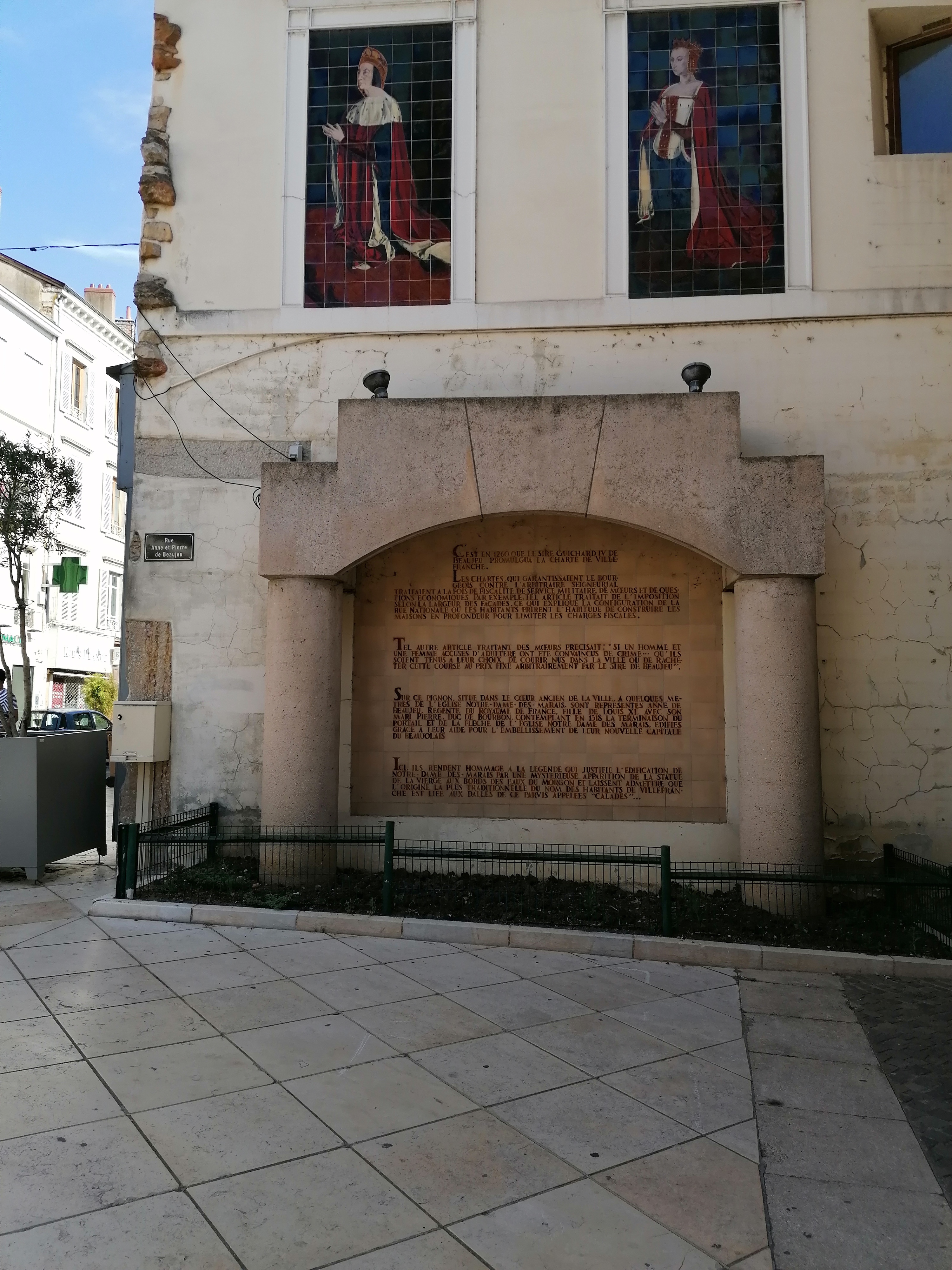 La collégiale Notre Dame des Marais de Villefranche sur Saône, est le monument emblématique de cette ville. L' édification de cette église, débutée au 13e, a été effectuée sur une zone marécageuse longeant la rivière Morgon. Actuellement, cette petite rivière qui a été canalisée, traverse la ville, partiellement en souterrain. Vous pouvez observer celle- ci, en bout de la nef, côté nord-est. Pourquoi cette église a été construite sur la nappe phréatique du Morgon ? Avant l'édification de cette église, il n'existait pas d'église à l'intérieur des remparts. Seule existait hors les murs, l'église Ste Madeleine. Suivant une légende, une statue d'une vierge a été découverte, dans les marais de la ville, par des bergers, ces derniers décidèrent de la déposer dans l'église Ste Madeleine. Le lendemain, cette statue est à nouveau retrouvée dans ces mêmes marais. Dès lors, les échevins et l'Eglise décident l'édification d'une église dans ces marais. La nature du terrain, a bien sûr nécessité un enrochement, avant d'entreprendre la construction. il a été décidé d'utiliser les pierres plates trouvées au bord de la Saône, appelées en provençal calades. L'utilisation de ces calades, a généré, le nom caladois, pour désigner les habitants de Villefranche. Financée essentiellement par les échevins de la ville, et un peu par les sires de Beaujeu, l'édification de cette église est réalisée entre le 13e et le 16e. Du fait de l'existence, d'un chapitre de chanoines, cette église est élevée, au 17e au rang de collégiale. Lors de votre visite, je vous informe que la Collégiale, étant en dessous du niveau de la voirie, vous serez obligés de descendre 2 marches (pour les PMR, l'accès s'effectue par une entrée située sur le côté Nord). A l'intérieur, vous serez surpris par la taille et la hauteur de cet édifice, lesquelles sont renforcées par la couleur beige clair des pierres. Je vous invite à visiter les chapelles, lesquelles sont décorées de tableaux et de superbes vitraux réalisés entre le 14e et le 16e. La copie de la petite vierge des Marais, n'est pas dans la chapelle de la Vierge, mais au dessus de l'ancien maître autel. Vous pourrez également observer le magnifique orgue comptant plus de 2000 tuyaux. A l'extérieur, je vous invite à observer, sur le latéral nord les gargouilles, dont l'une dénonce la luxure. Des visites de la Collégiale sont organisées par l'OT, lequel se situe dans la rue pratiquement, en face de ND des Marais. Alors n'hésitez pas à descendre la rue nationale, et les marches de la collégiale, pour une plongée dans l'art, l'histoire et la quiétude...Entrez vite..., vous serez étonné !!!