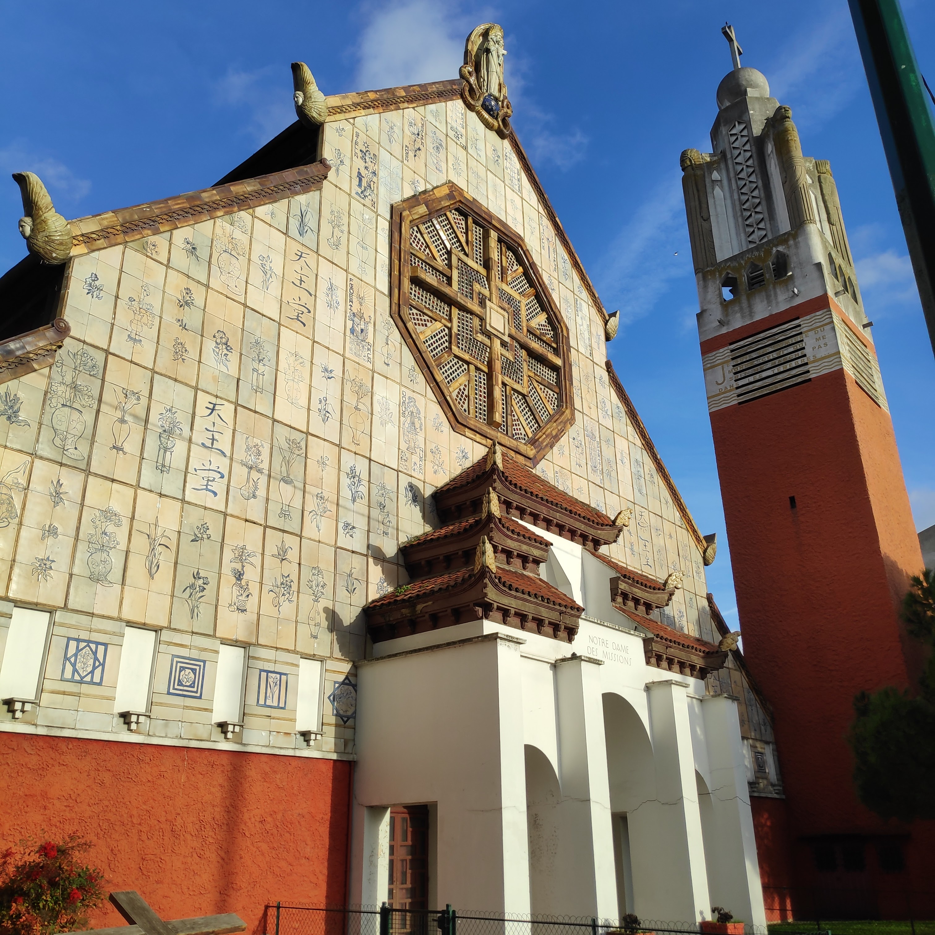 Une eglise vraiment improbable dans son style qui vaut le détour. Si vous regardez avec attention vous aurez remarqué des influences asiatiques. Et c'est bien normal. A l'origine il s'agissait d'un pavillon conçu par l'architecte Paul Tournon pour l'exposition coloniale de 1931 à Paris. C'est ce même architecte qui a réalisé l'église du Saint-Esprit à Paris (une sorte de Sainte-Sophie en béton). L'histoire d'un pavillon : Le bâtiment porte en lui de grand enjeux dès le départ. Il devait symboliser l'apport des missions catholiques à l'exploration et à la colonisation de l'Indochine. Sauf que le règlement de l'exposition interdisait de faire la promotion de groupes religieux. Une exception a donc été faite pour ce pavillon. Comme tous les autres pavillons il aurait dû être démonté juste après l'exposition. Mais suite à l'engouement suscité par le bâtiment, il a été décidé de le garder et de le remonter a son emplacement actuel en 1932. Reconversion en église de banlieue : L'emplacement actuel résulte de son contexte socio-politique de l'époque. Il faut se rappeler qu'à cette époque la ville était en pleine explosion urbaine. Ces constructions de logements étaient là pour loger les ouvriers. Et a partir des années 1930, la banlieue rouge était en effet vu comme une terre de mission (la croyance religieuse était en net déclin dans les banlieues ouvrières). Les vitraux sont sympa de ce que j'ai pû voir mais je n'ai pas pû m'attarder trop longtemps. Si vous passez à côté c'est un inmanquable !
