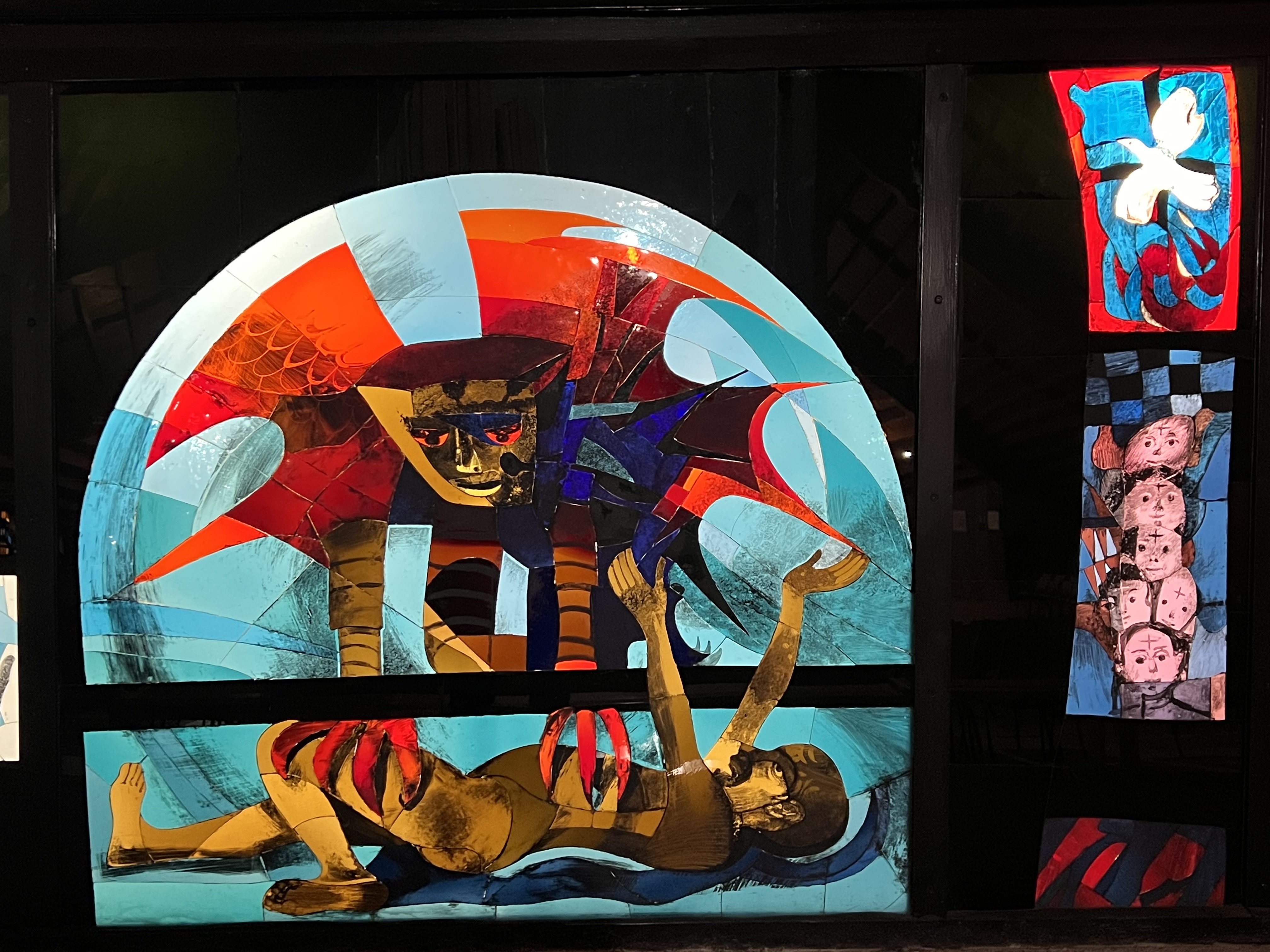 Une architecture moderne et très originale avec un puit de lumière vers le ciel ( et inversement ) . Des vitraux très vifs et colorés . Vraiment novateur et beau .
