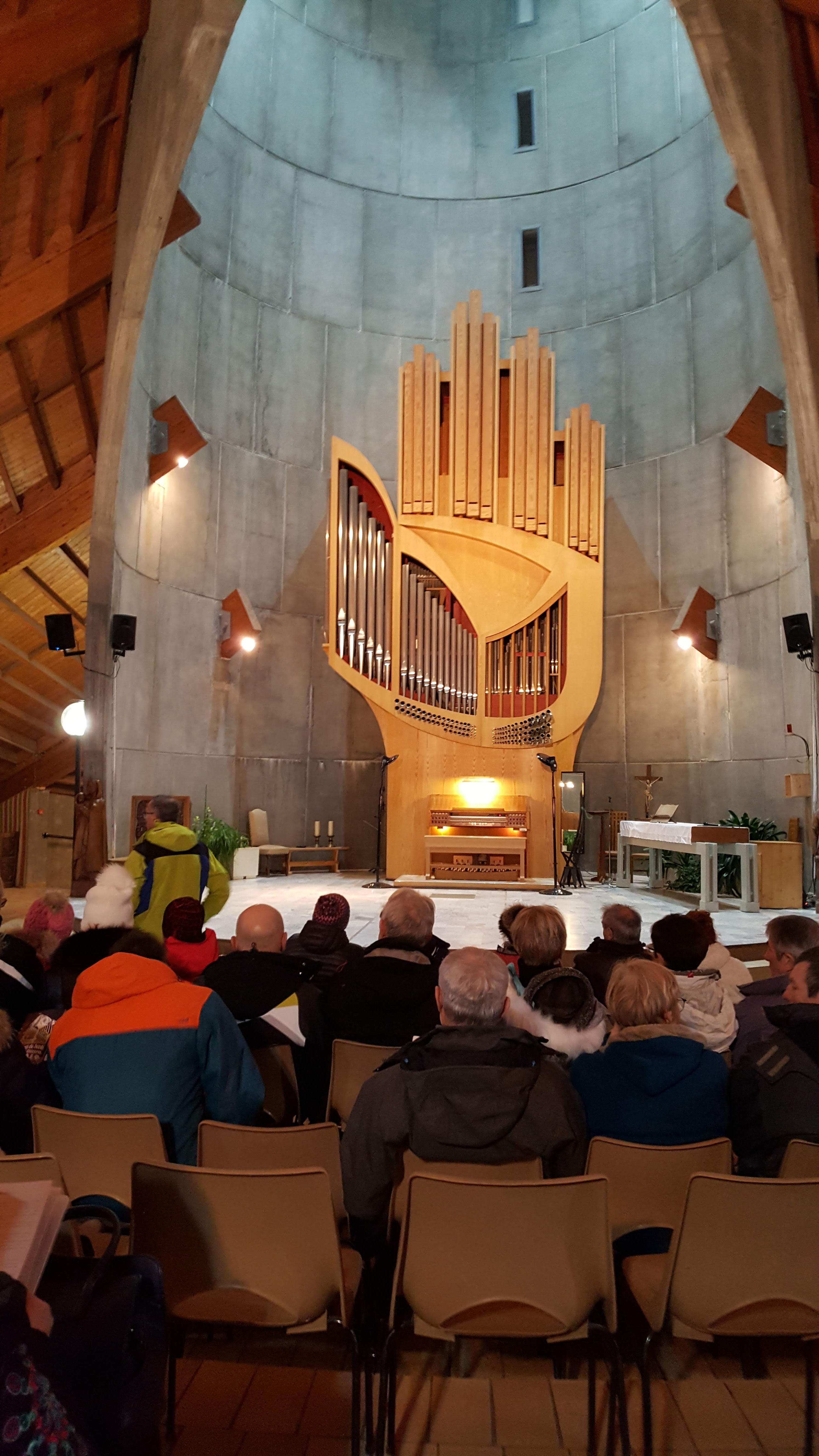 Bonjour Magnifique chapelle très beaux vitraux .des panneaux montrant la construction et 1 film . Orgue en forme de main magnifique chaises pour la messe installées en forme de demi lune . Ne passer pas à côté