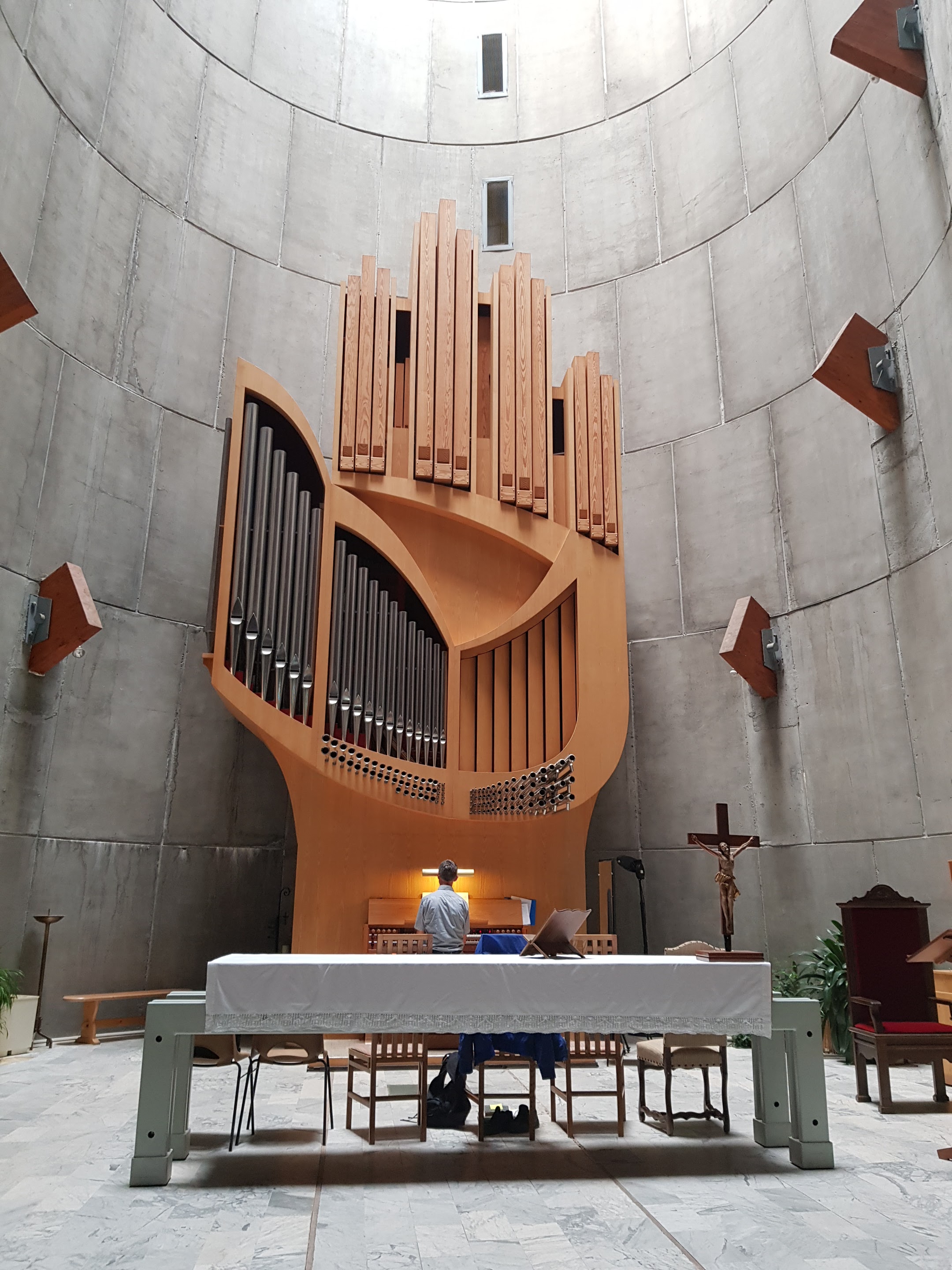 Une église moderne tout en rond autour de l'hôtel et de l'orgue en forme de main 🤚🏻 Assez moderne elle a une très belle acoustique. Les vitraux sont modernes mais l'ensemble est bien entretenu.