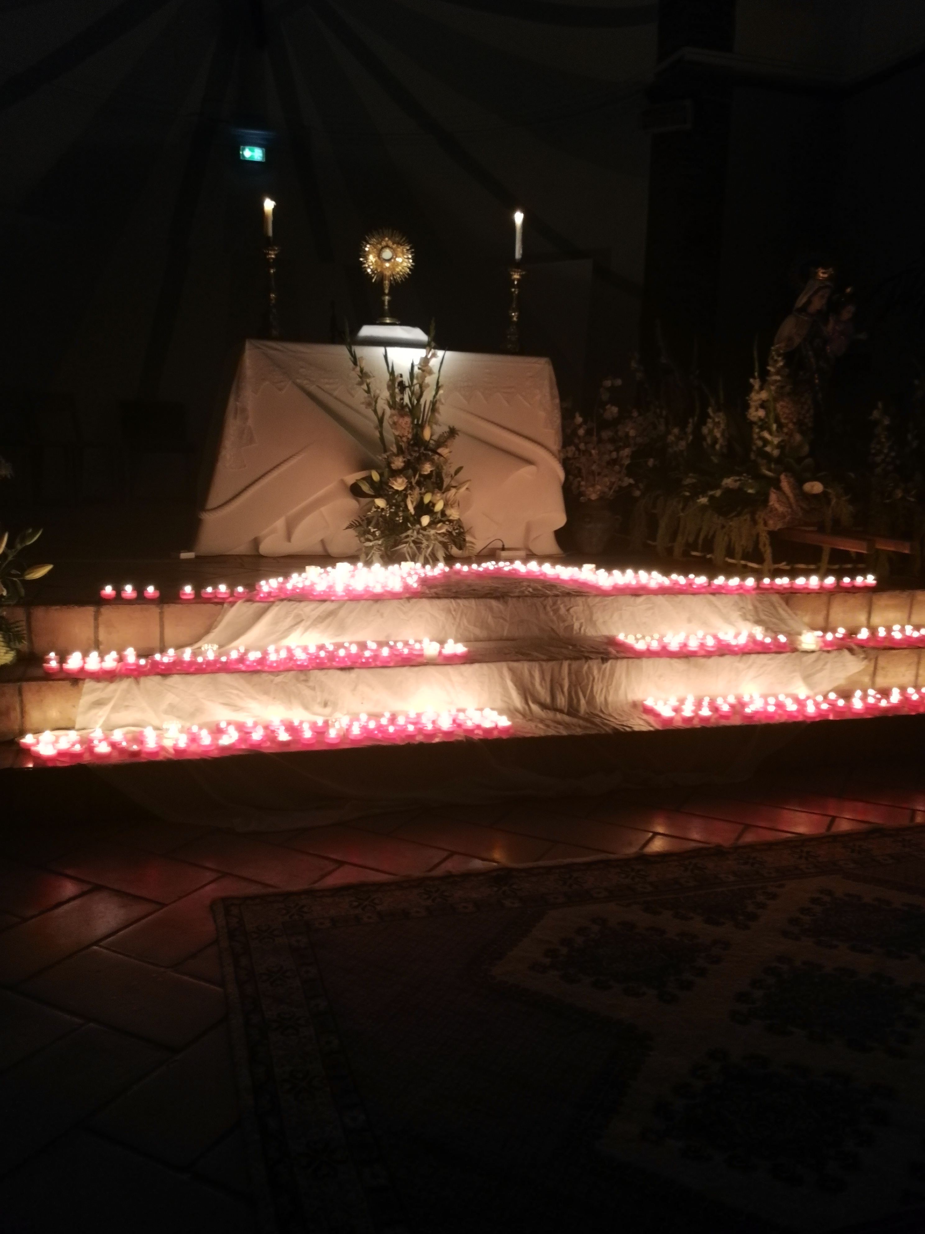 Église ouverte le soir. Distribution de bougies aux enfants qui ont pu aller les allumer et les déposer dans l'église. Très belle initiative