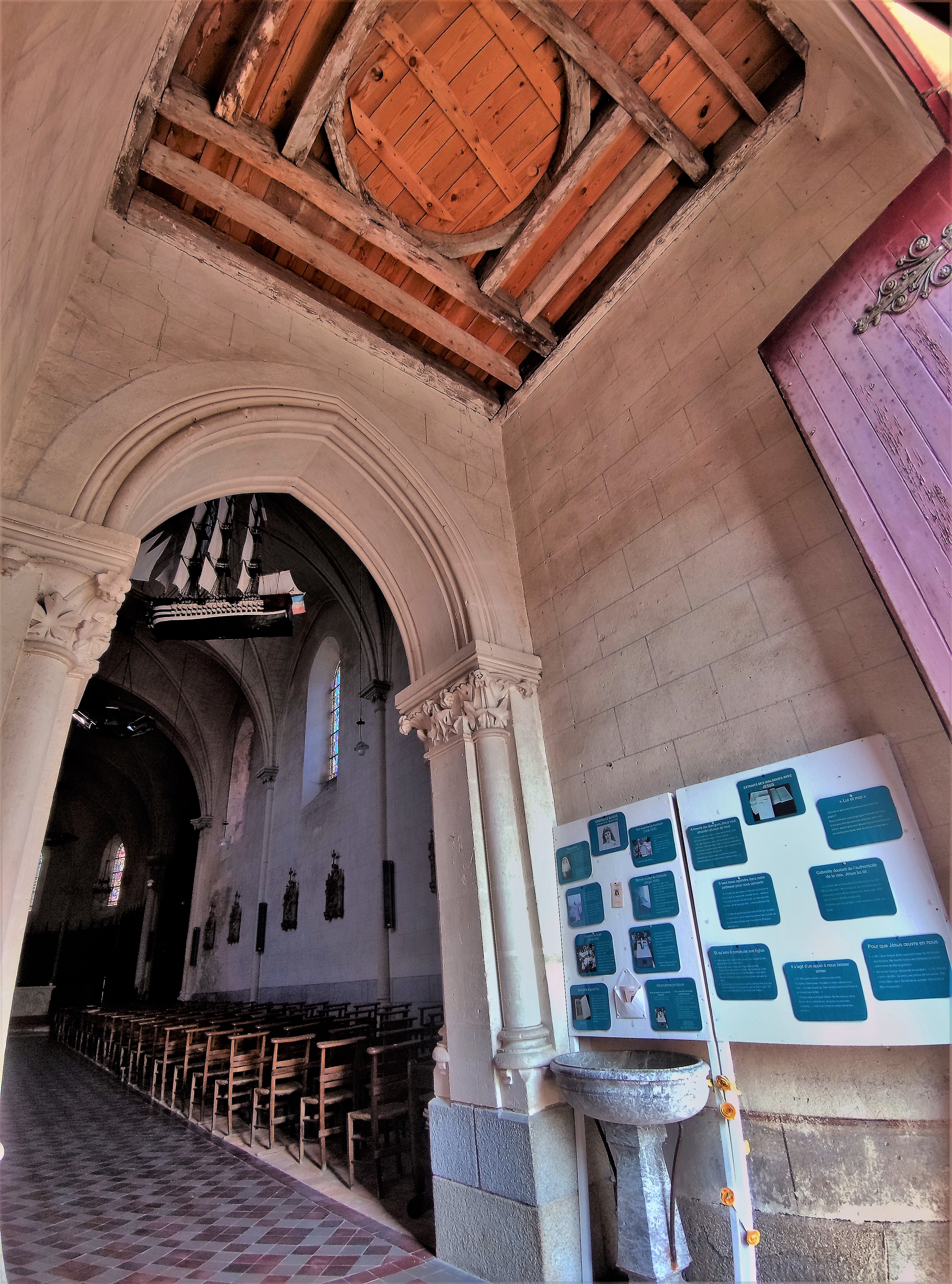 Cette visite d'une église classique complète agréablement la découverte de l'église moderne Notre-Dame d'Ingrandes située à 600 m. Église désorientée, le chevet est au Nord, le clocher porche est côté Loire, on le voit de l'autre rive. Construite dans la 2ème moitié du19ème siècle, cette église à nef unique est de dimensions modestes. Ouverte et accueillante, ses croisées d'ogives assez basses, la brisure peu marquée de ses arcades et des ouvertures, l'abside du chœur, offrent un aspect accueillant et intime à cet édifice. Les vitraux sont un bel agrément, le sanctuaire est encadré de croisillons sans absidiole mais décorés de peintures. Côté Ouest, le monument aux morts est entouré de fresques réalisées en 1922 par J.E. Chapleau. A voir, au-dessus du portail, un navire, ex-voto offert par un marin victime d'un naufrage auquel tout l'équipage survécu ; un rappel du métier difficile et dangereux des marins de la Loire.
